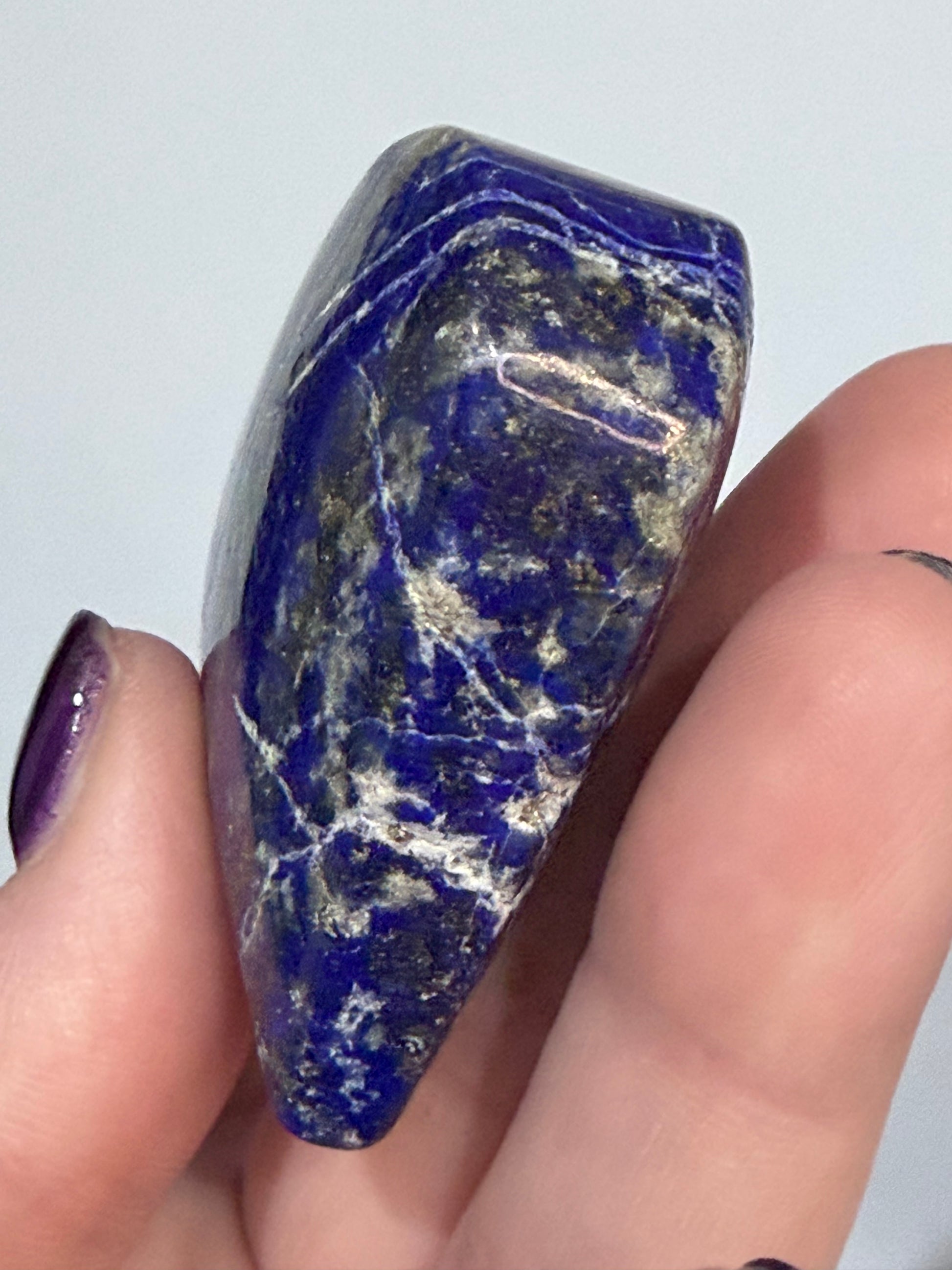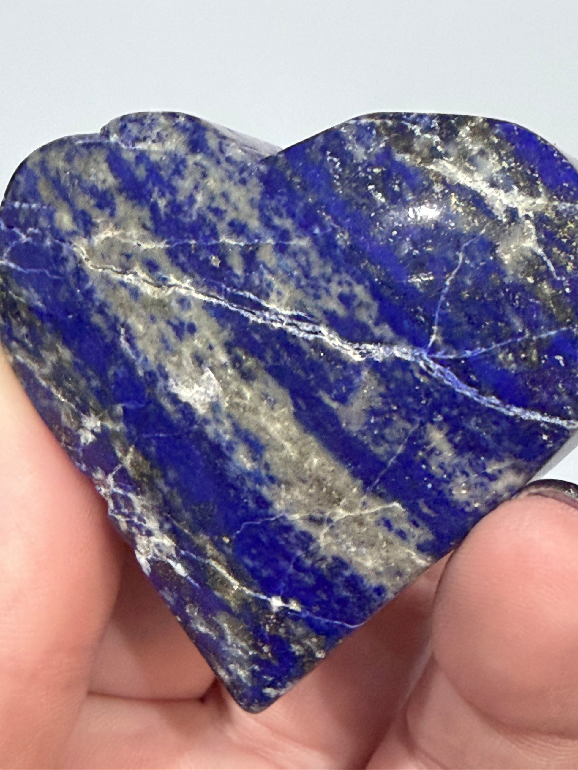 This beautiful self-standing Lapis Lazuli heart features rich royal blue tones blended with soft grey calcite and natural golden pyrite flecks. With a smooth polished finish and a stable flat base, this heart stands securely on its own, making it ideal for display on shelves, desks, or altar spaces.