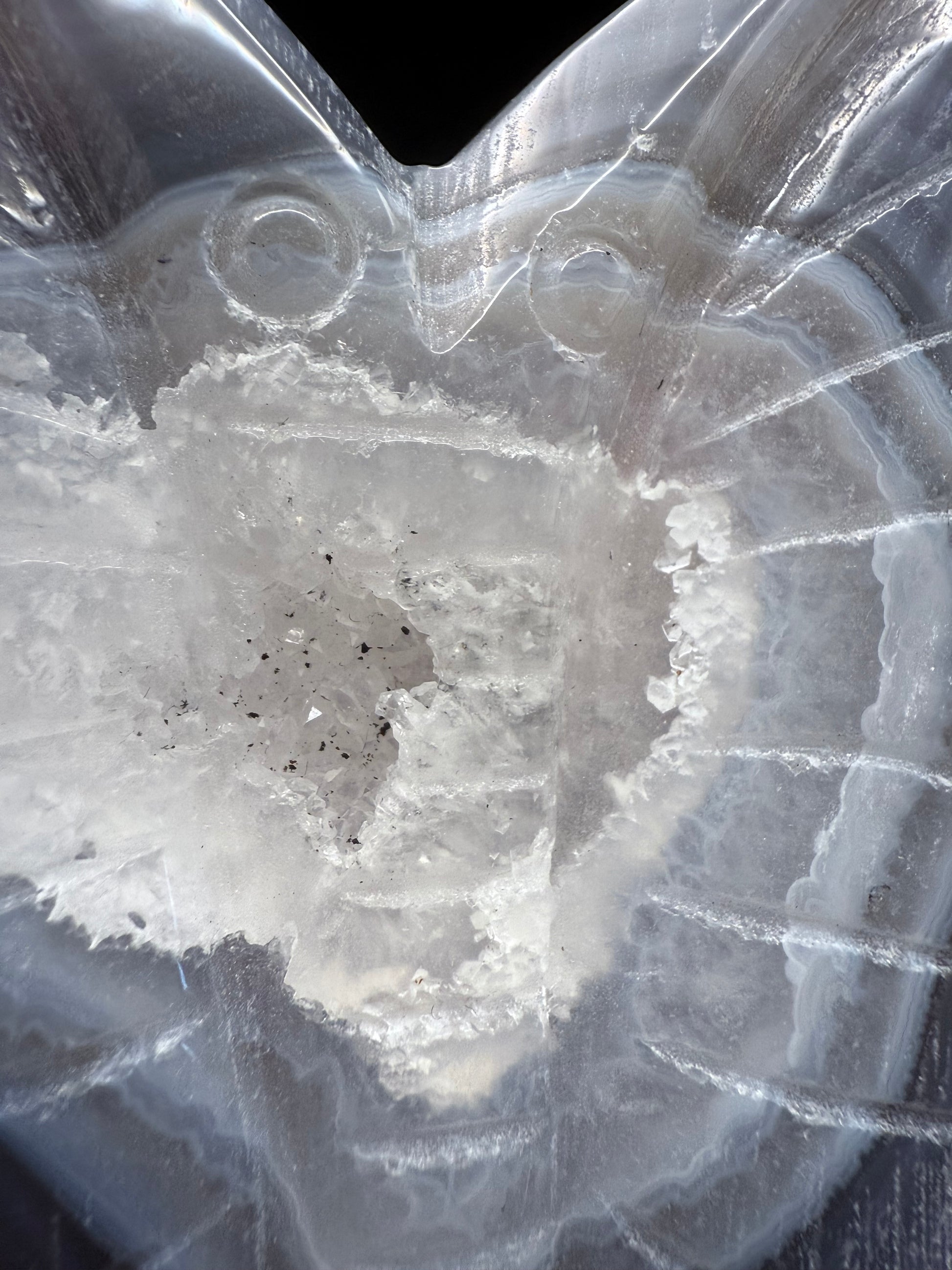 Transform your space with this stunning Agate Butterfly carving — a one-of-a-kind piece that combines the grounding stability of agate with the magic of transformation. Measuring 15 x 12 cm and weighing 320g, this butterfly showcases soft grey and white natural banding, with a sparkling druzy crystal heart at its center that shimmers beautifully under light.