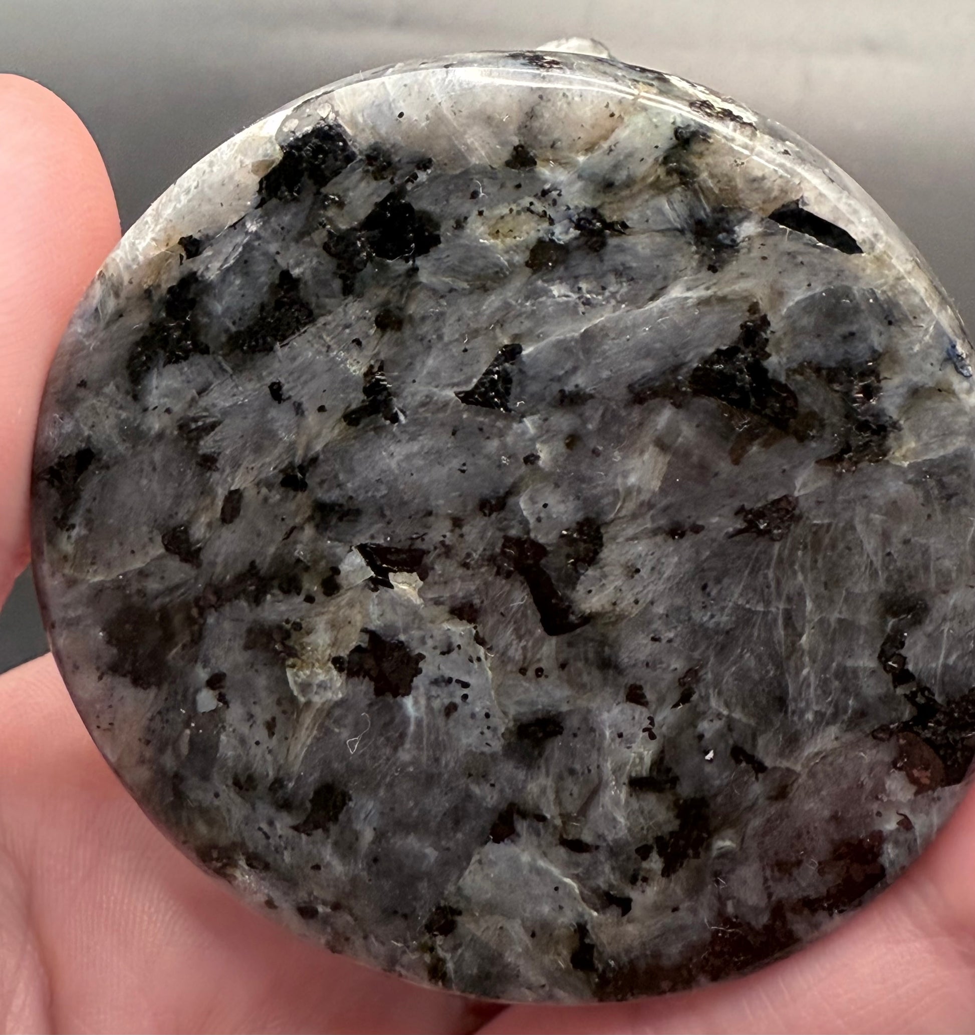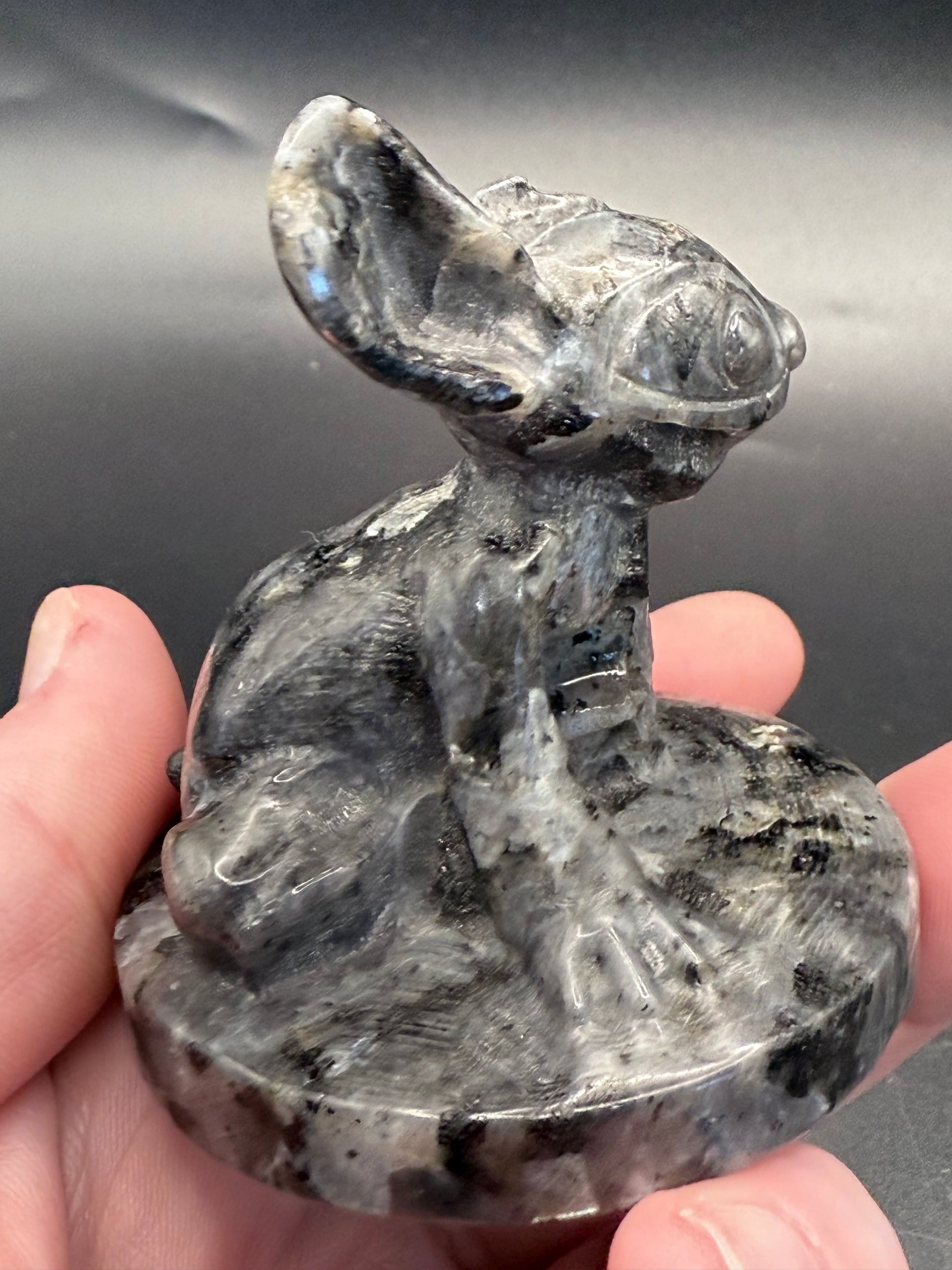 Crafted from natural Larvikite (also called Black Labradorite), this piece weighs 151g and stands 6.5cm tall. With its silvery flashes and dark marbling, itβs a magical collectible for Disney fans and crystal lovers alike β¨