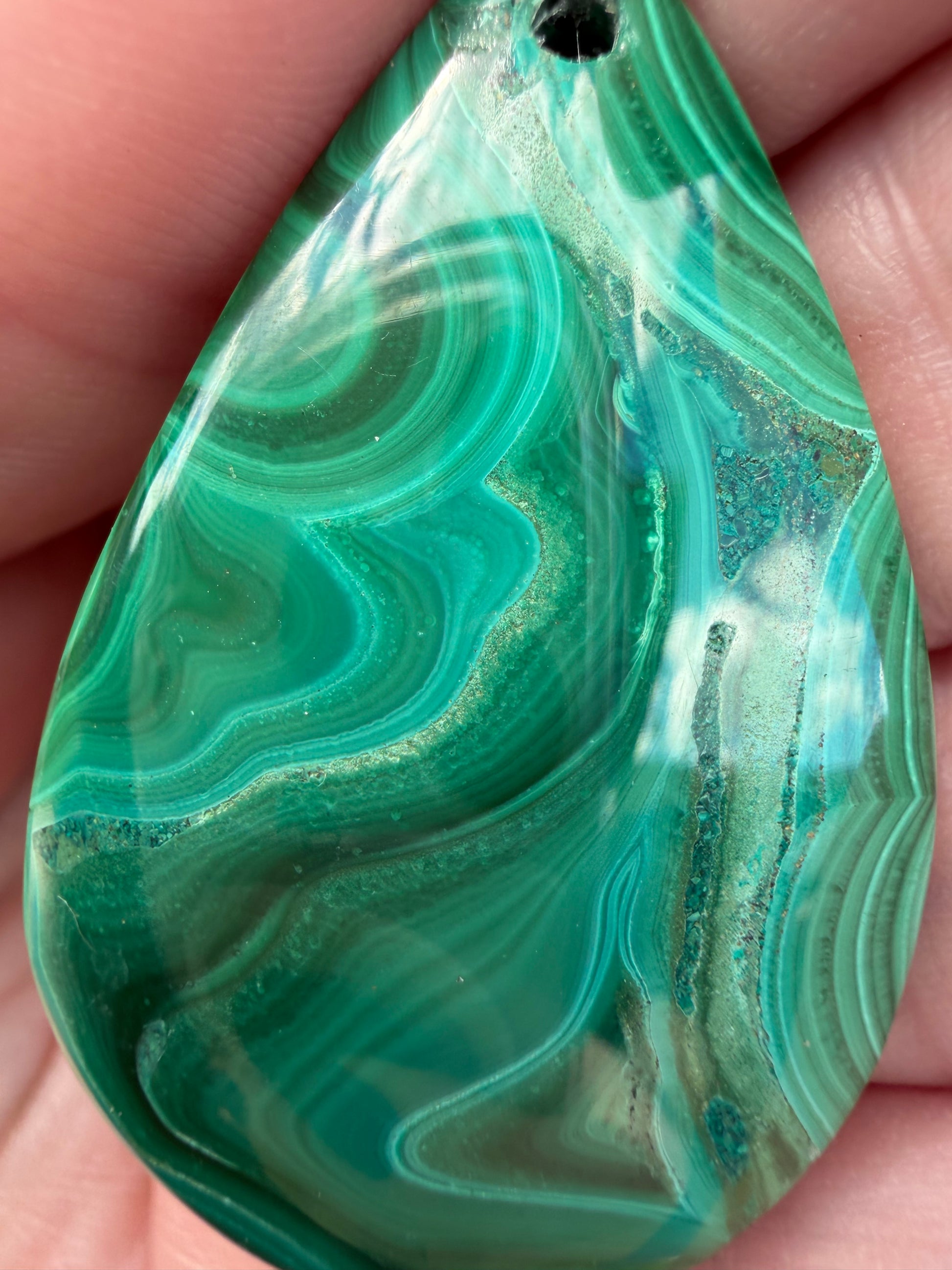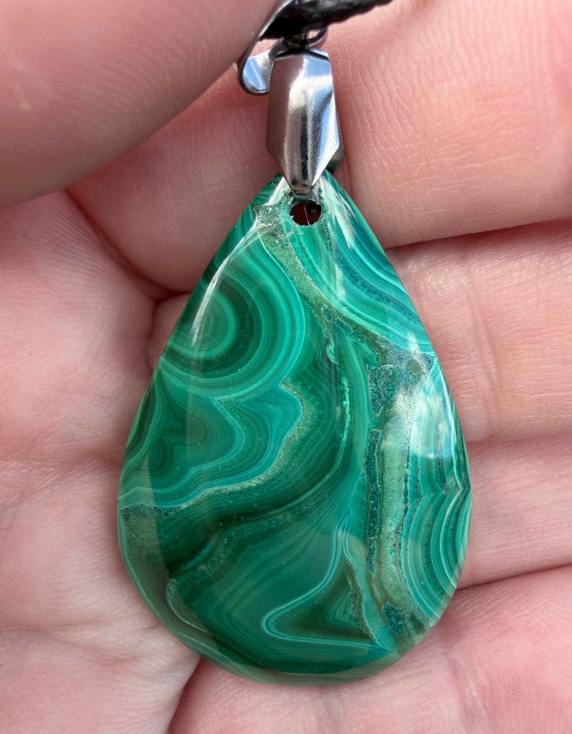 This stunning Malachite teardrop pendant features rich green banding with beautiful natural Chrysocolla inclusions, giving this piece extra depth and unique character. A true one-of-a-kind crystal pendant.