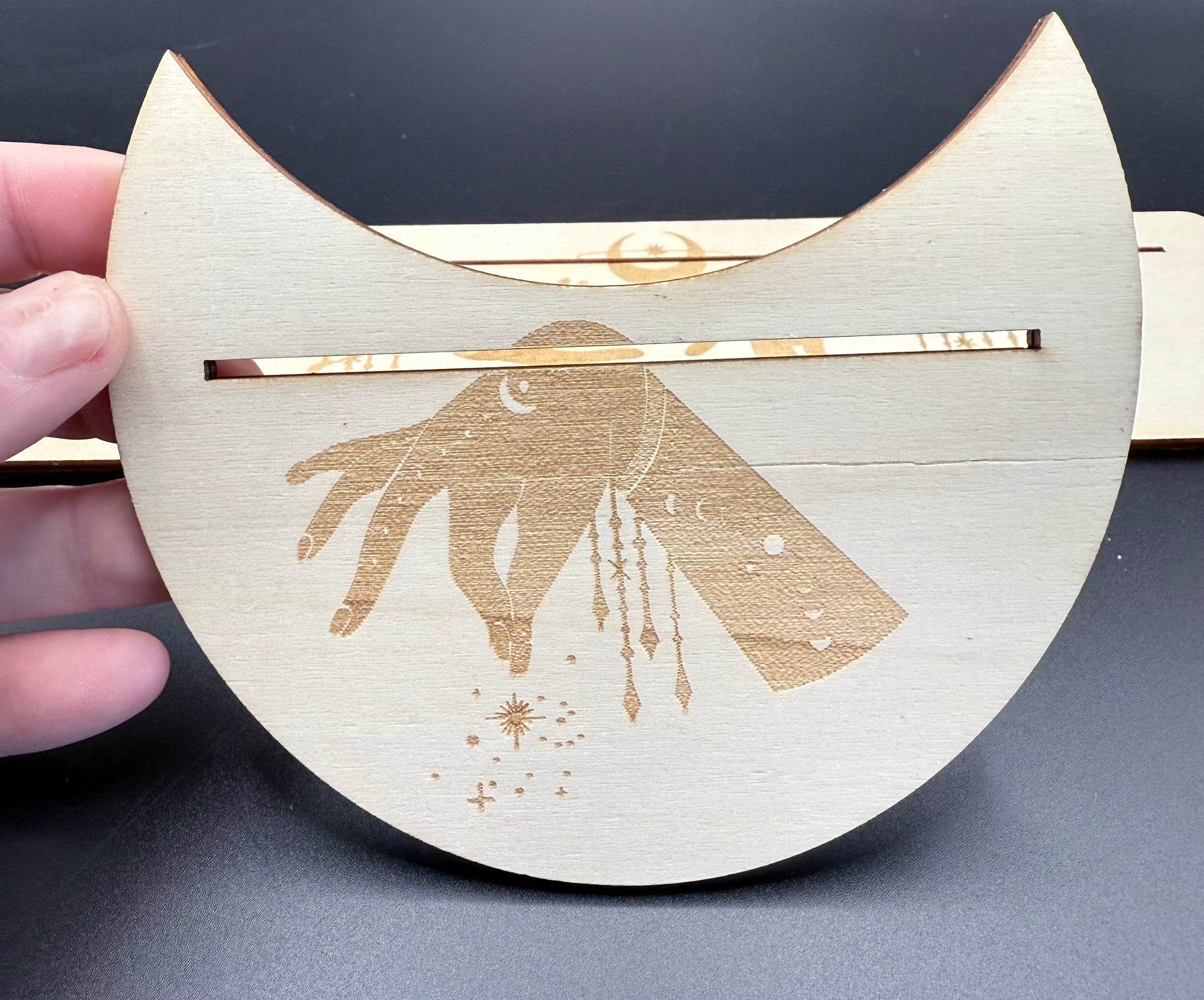 • Crescent Moon Stand – A graceful hand reaching out with starry trails and moon phases, ideal for crystal grids, altar décor, or card displays.