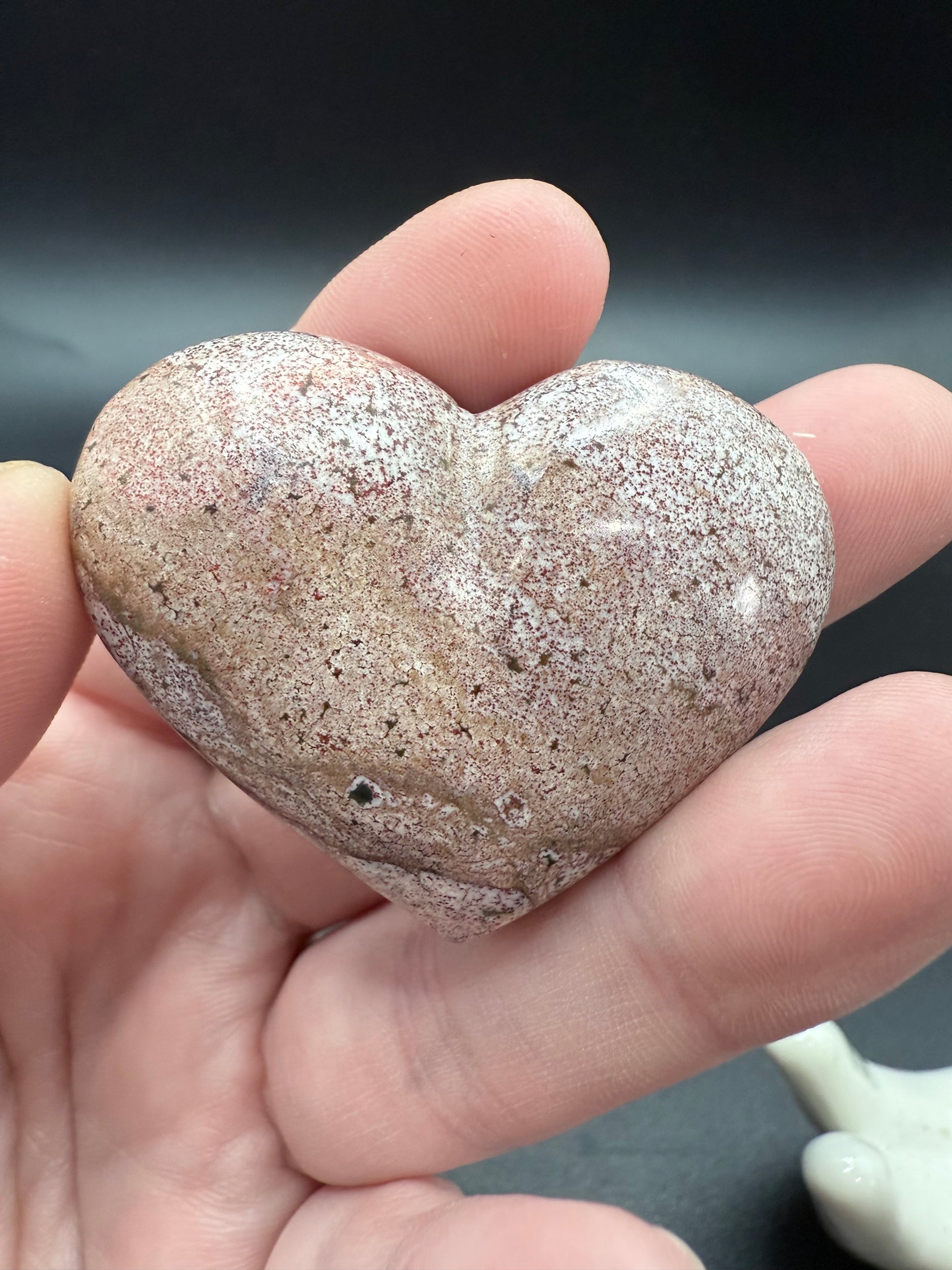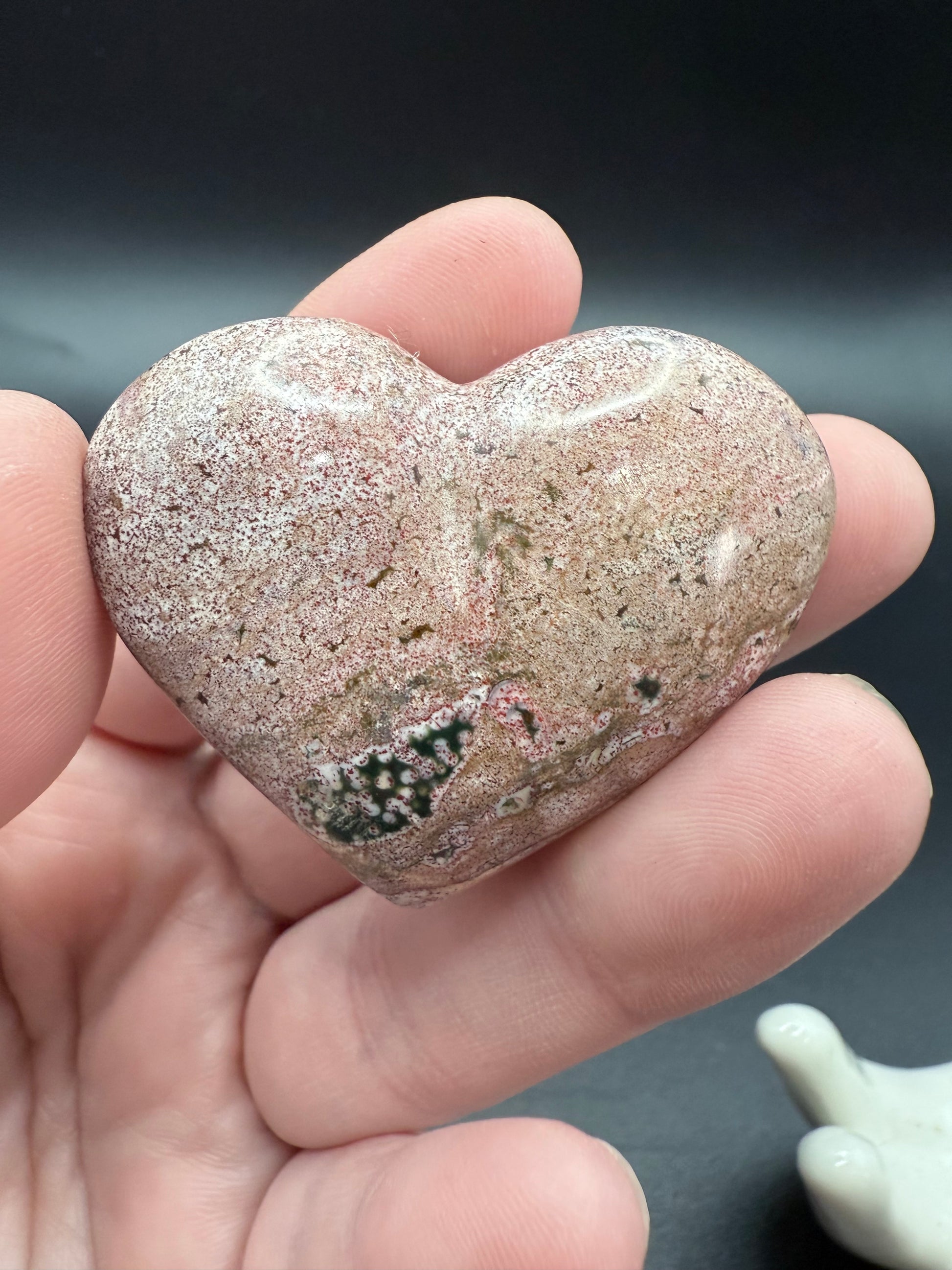 This unique heart carving is made from genuine Ocean Jasper, displaying soft beige and pink tones with natural mossy green accents. Each Ocean Jasper heart is one-of-a-kind, carrying soothing and joyful energy.