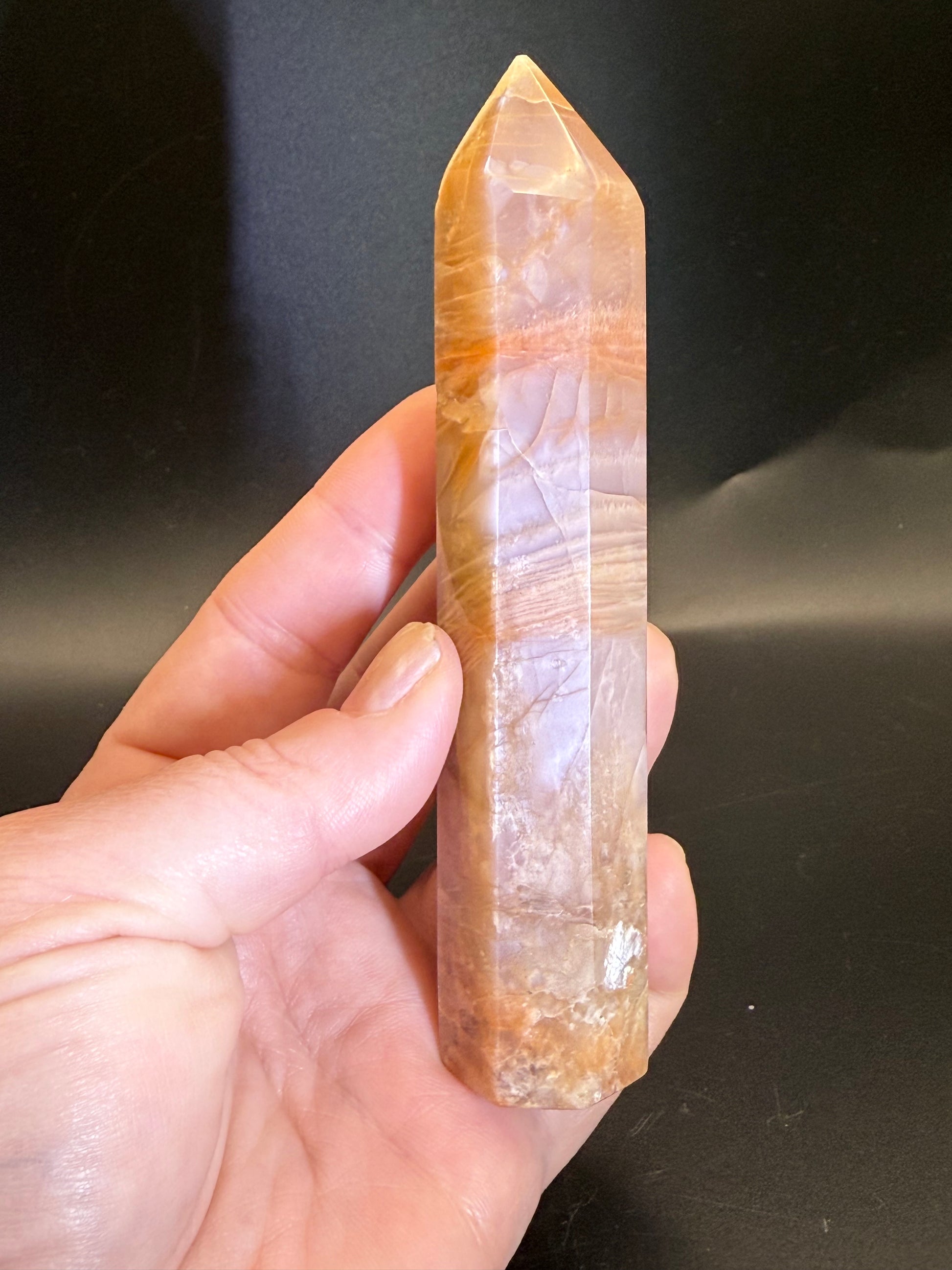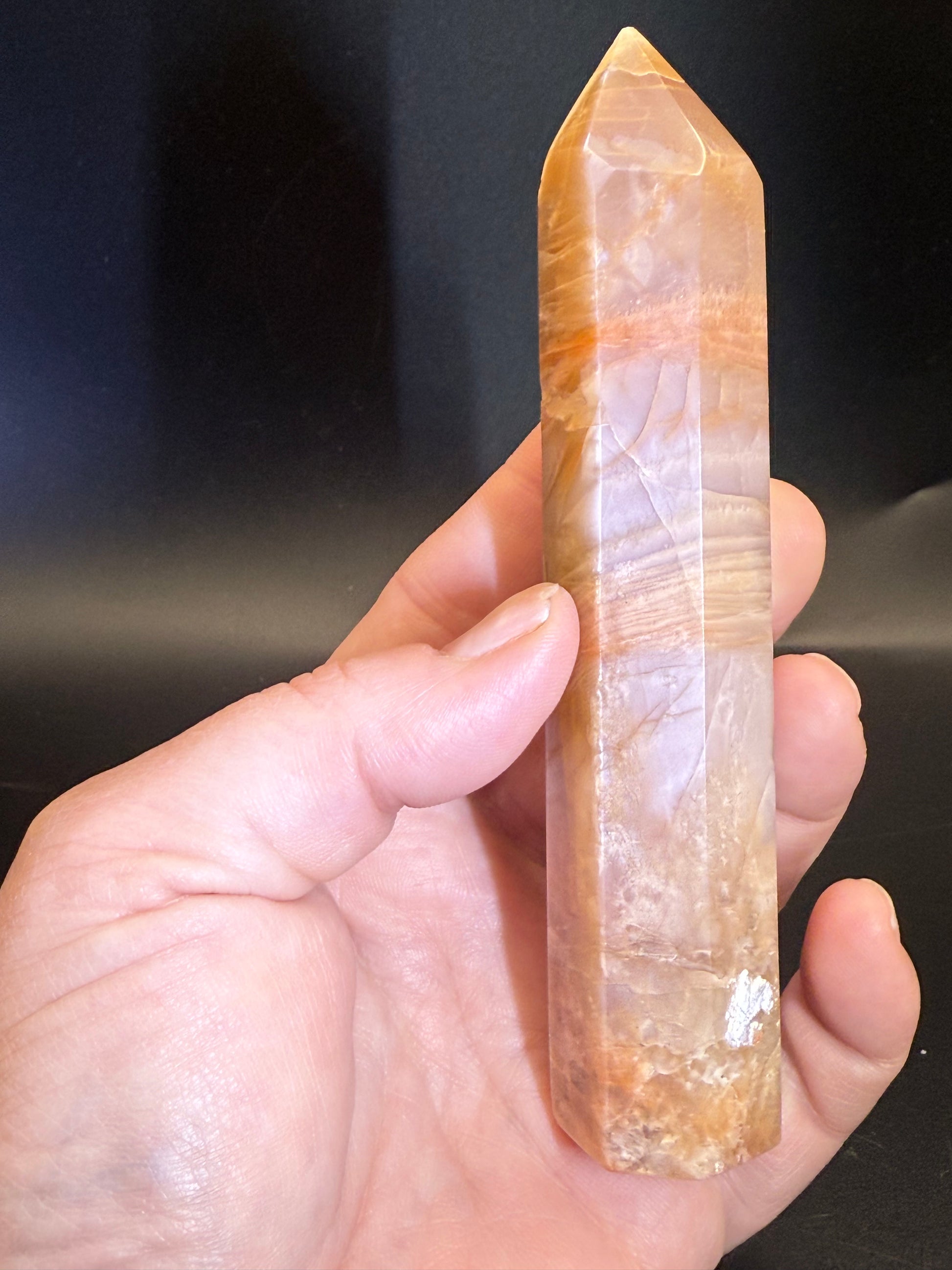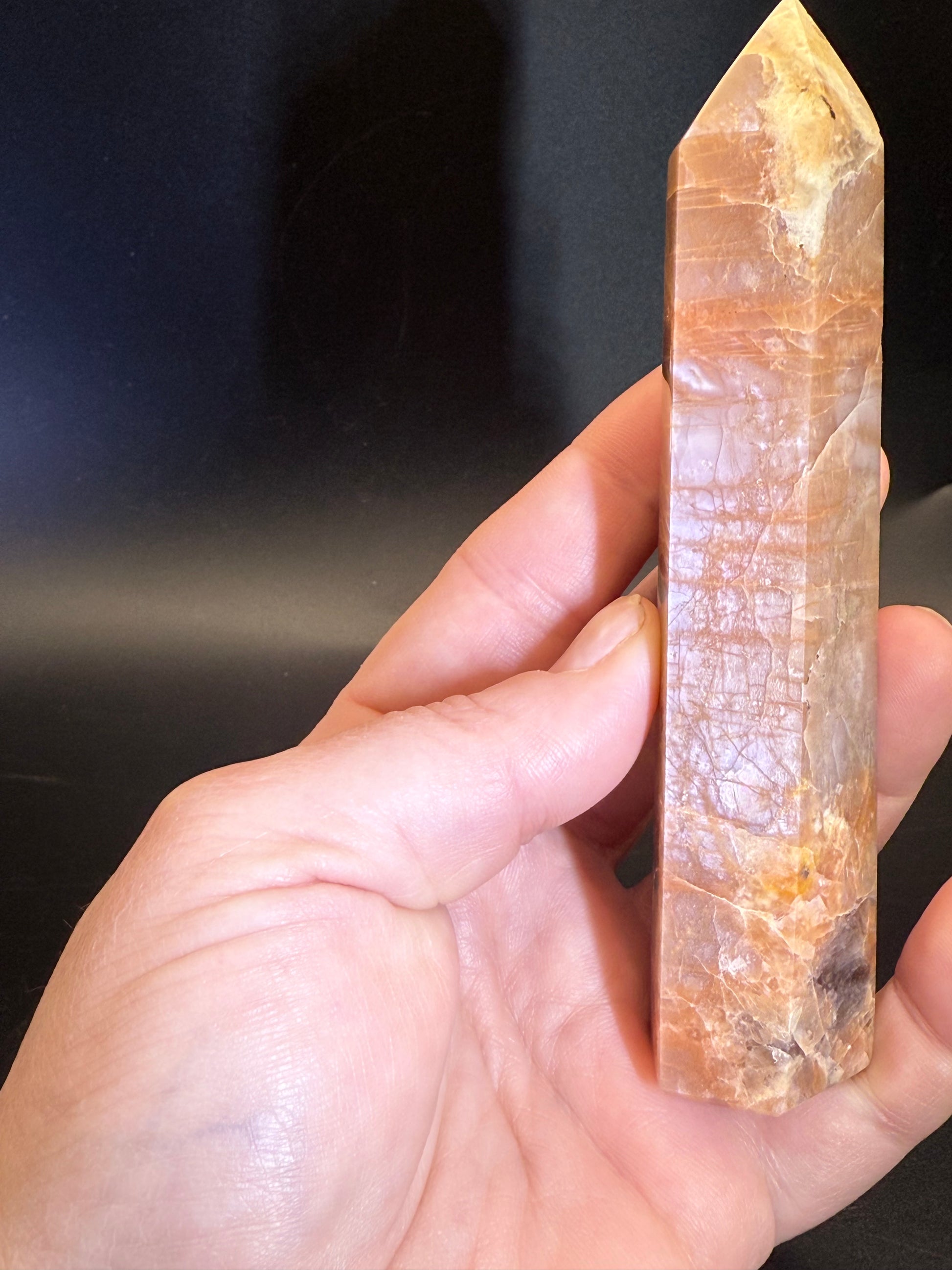 This elegant Peach Moonstone tower showcases warm peachy tones with delicate banding and a soft shimmer of blue flash when turned in the light. Its calming glow makes it a stunning center piece for any crystal collection.