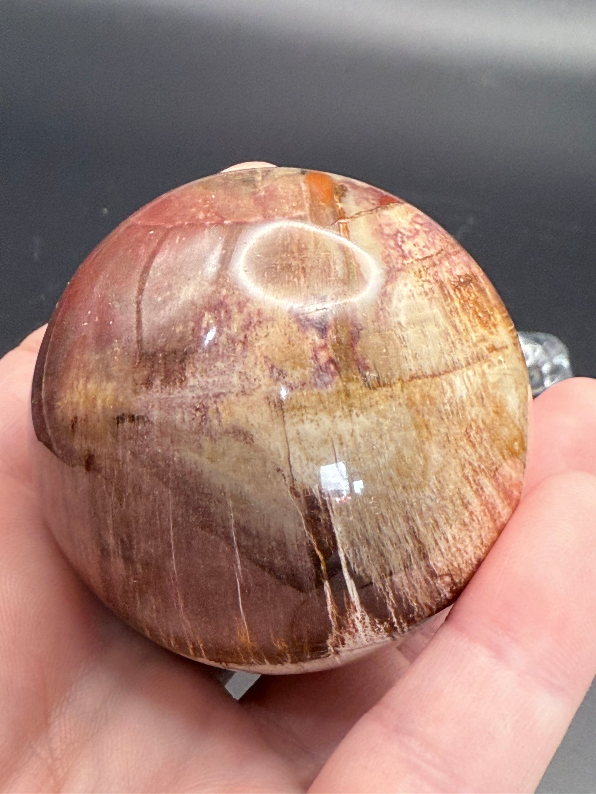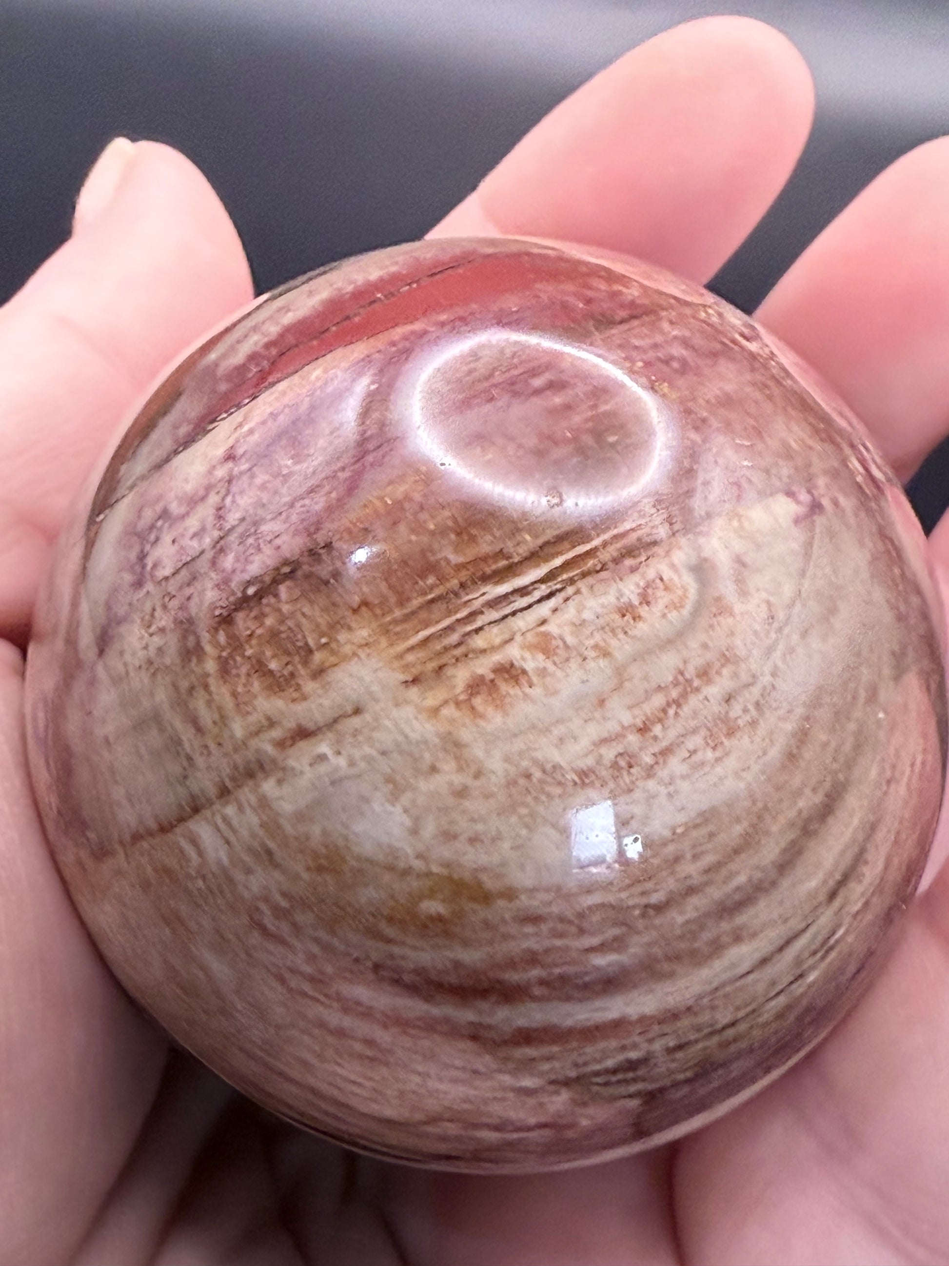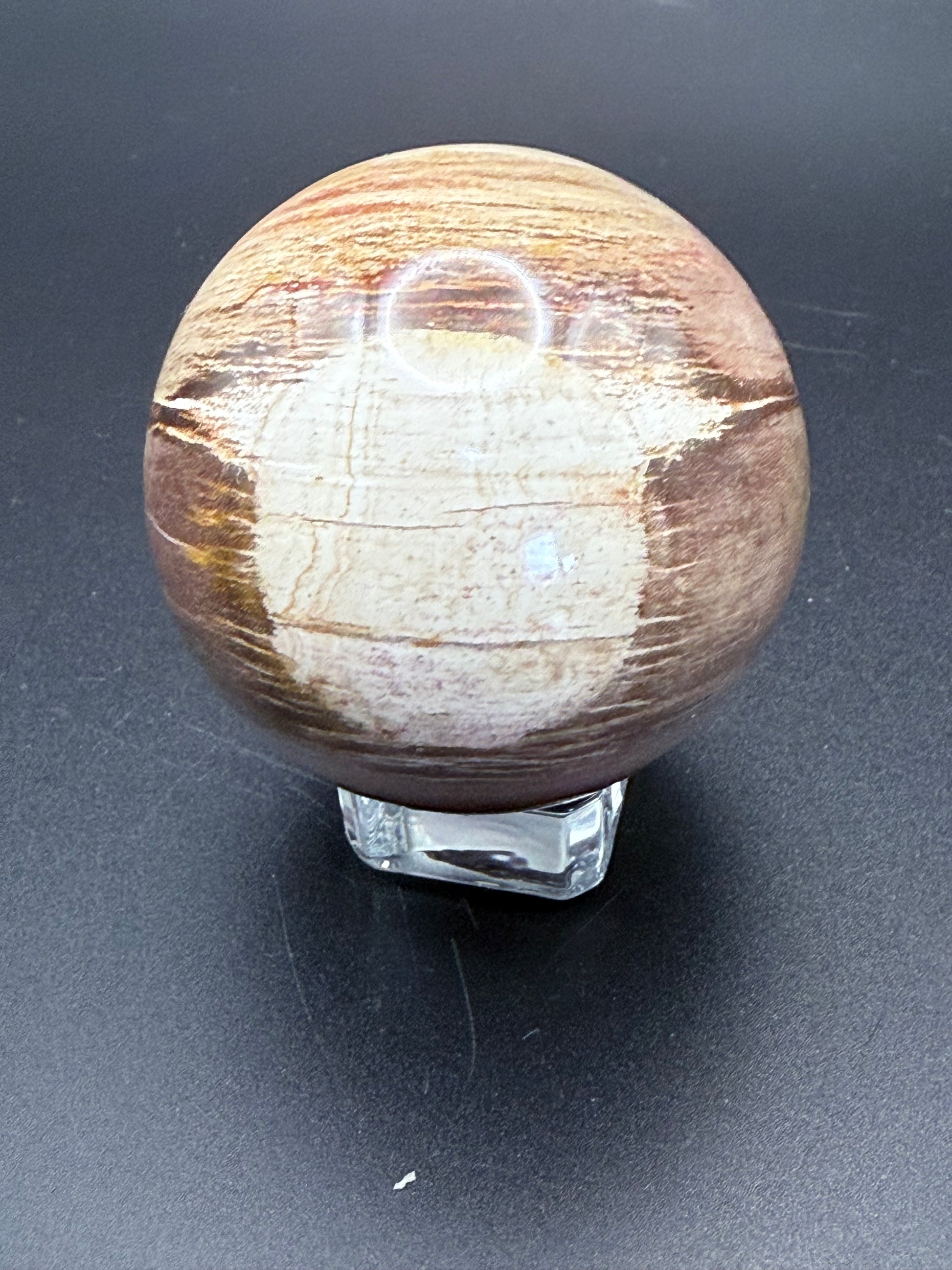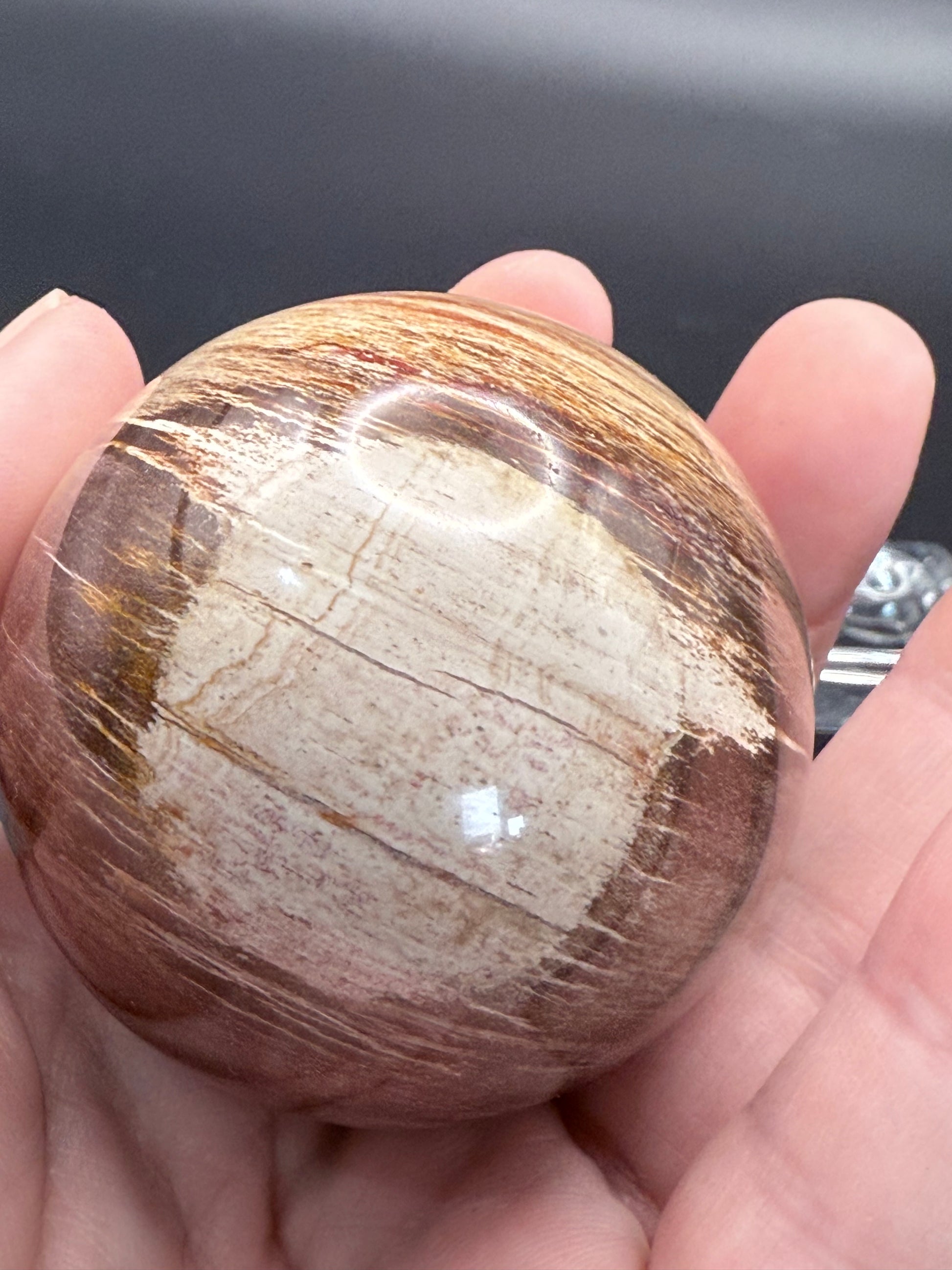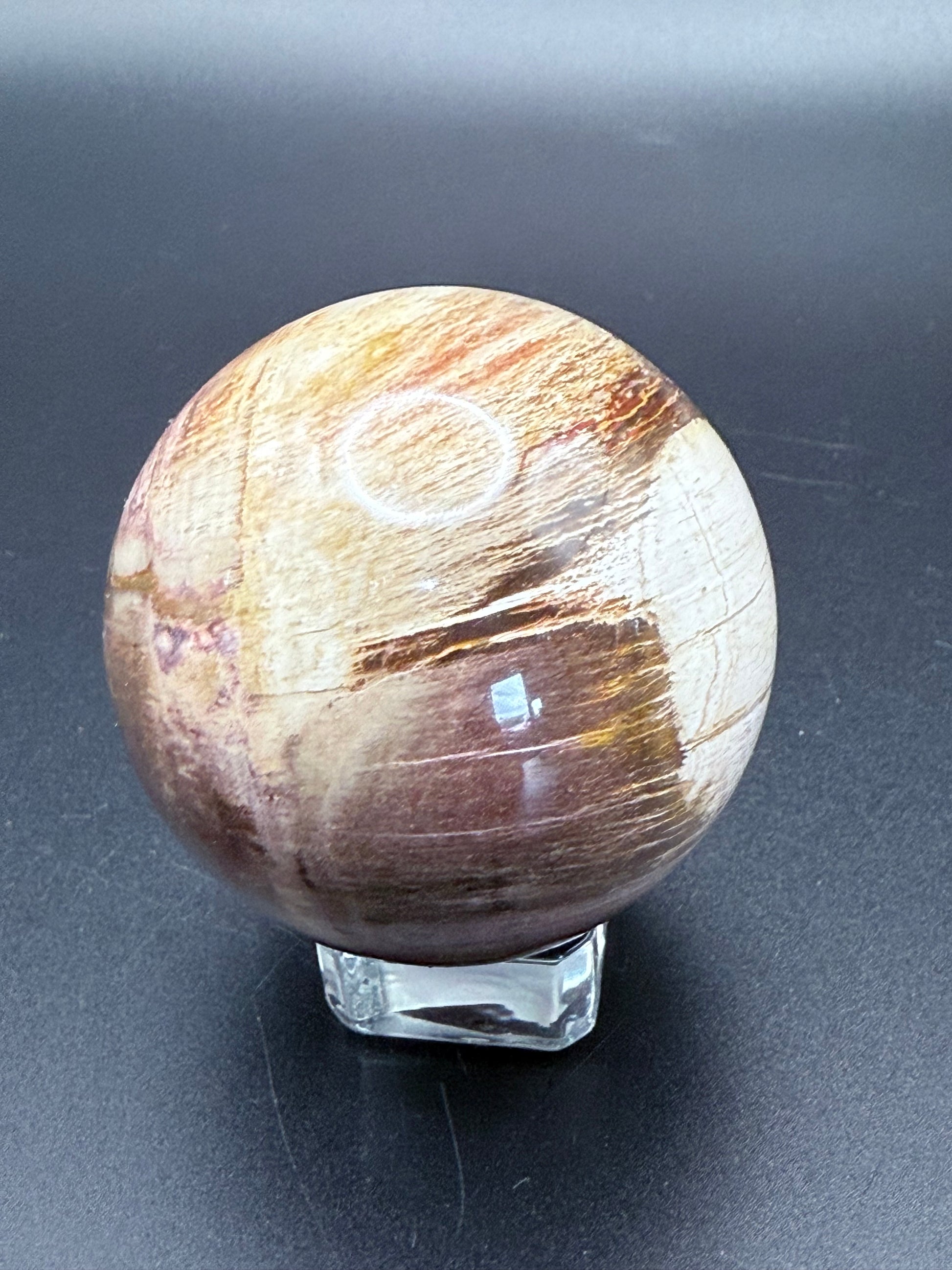 This captivating Petrified Wood sphere carries the ancient energy of the Earth, formed over millions of years as organic wood transformed into stone. Its earthy tones and natural grain patterns tell a story of time, strength, and transformation.