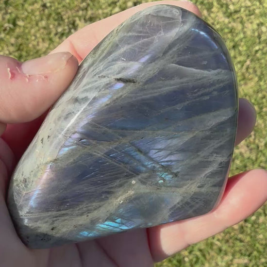 This stunning Labradorite freeform weighs 245g and measures 7 Ć 7cm. It shines with gorgeous deep blue and violet flash, accented by natural striations that give it extra depth and character šš. Compact yet powerful, this piece makes a perfect pocket-sized display or altar crystal.