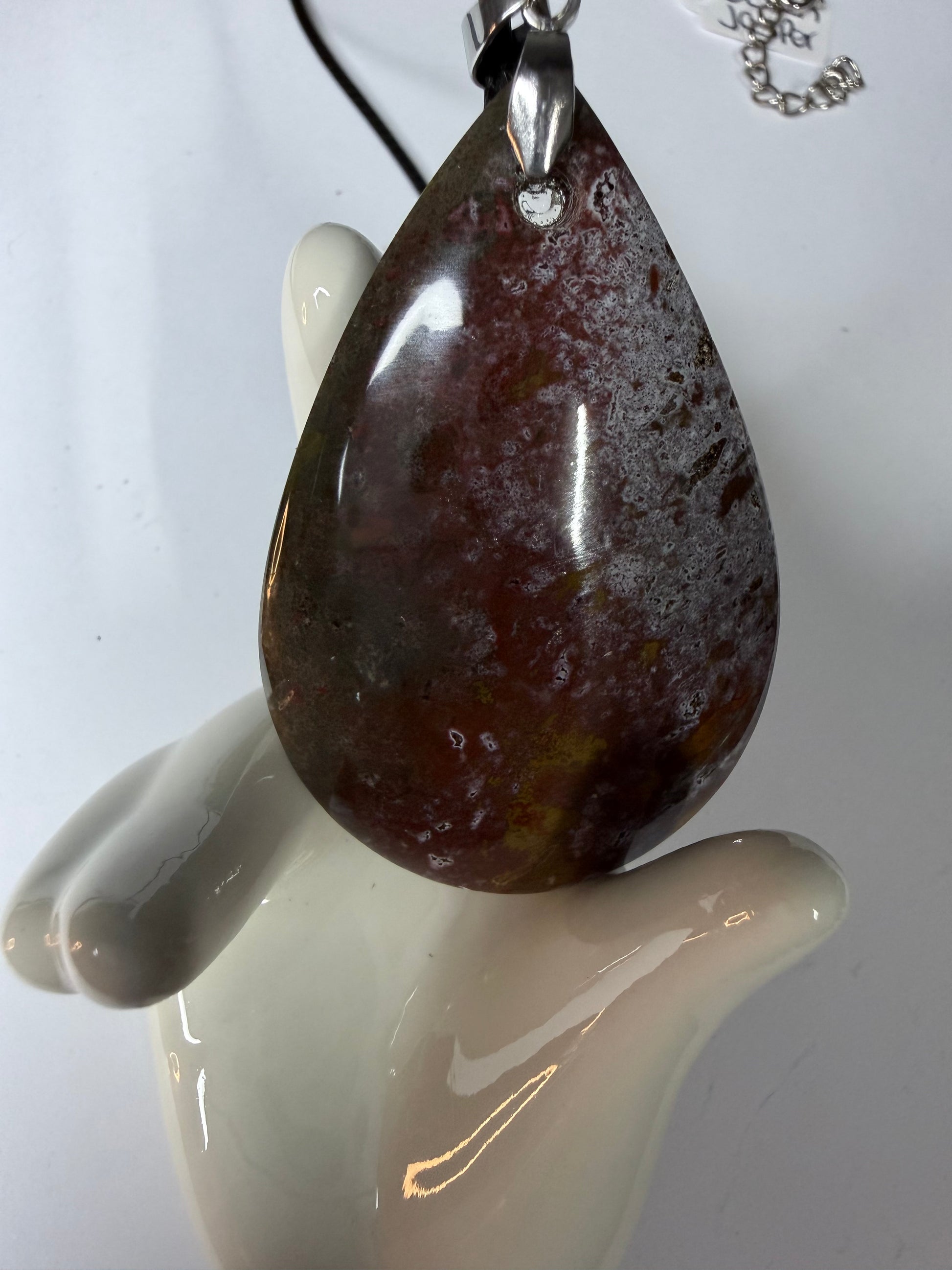 This polished Poppy Jasper pendant displays natural red, gold, and moss-green patterns formed from mineral inclusions and brecciated stone layers. Each piece is one-of-a-kind with unique earthy markings and warm tones.