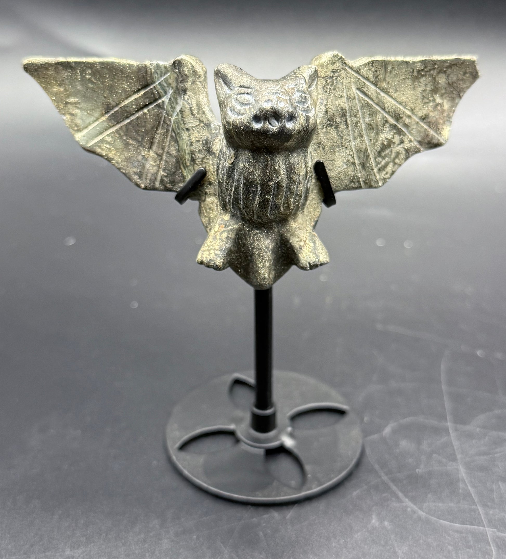 This striking bat carving is crafted from glittering Pyrite, also known as Fool’s Gold. With its metallic golden shimmer and detailed wings, this bat makes a bold statement, whether displayed on its sturdy black stand or held in hand.