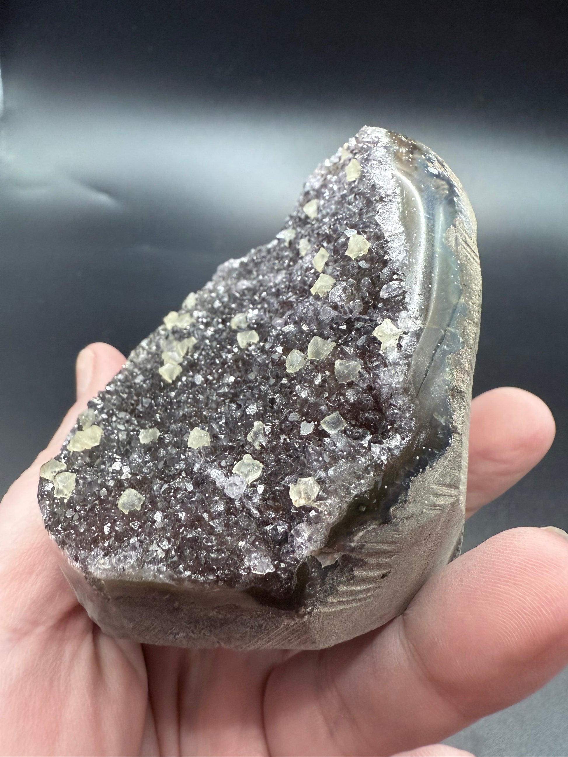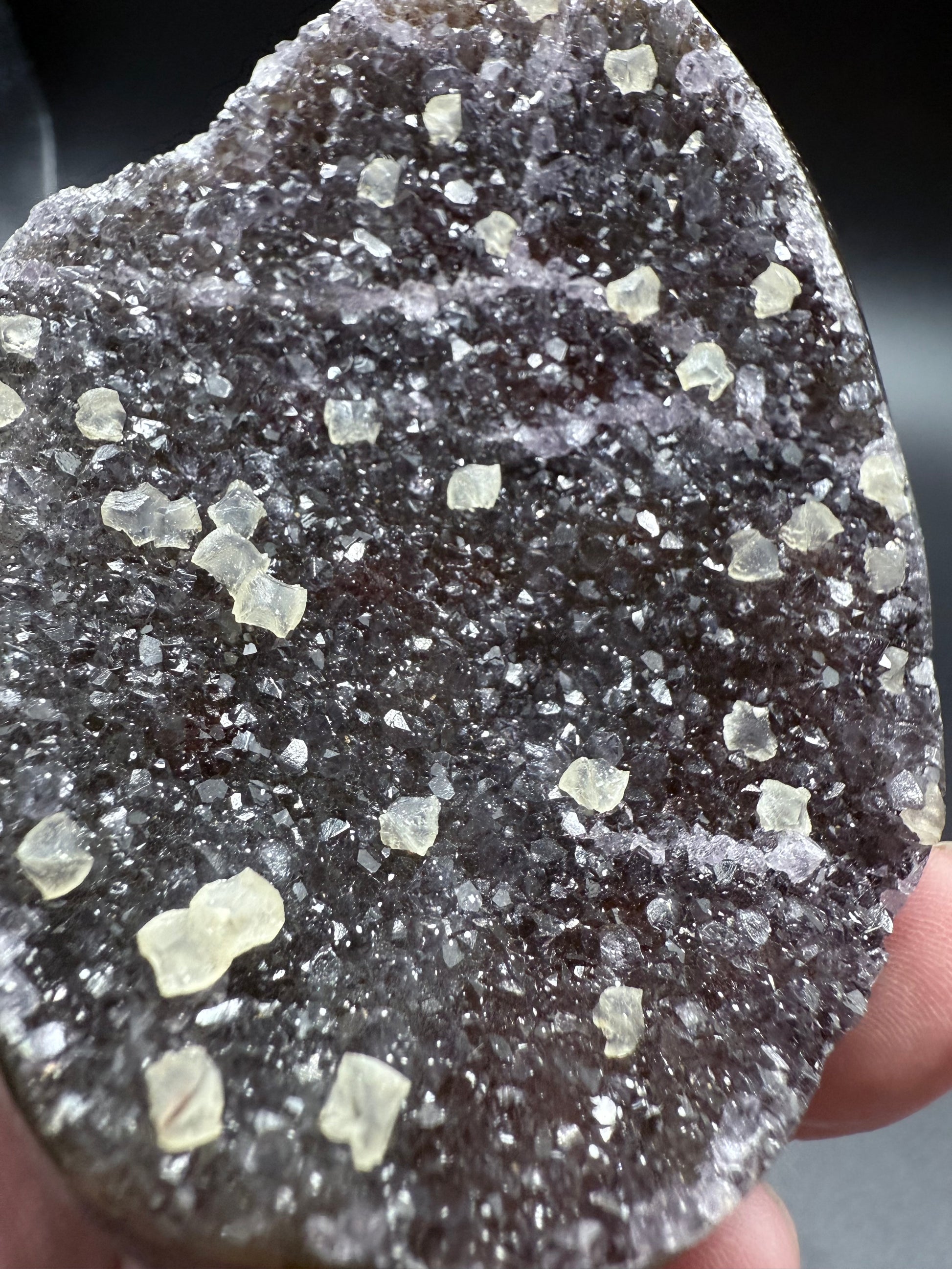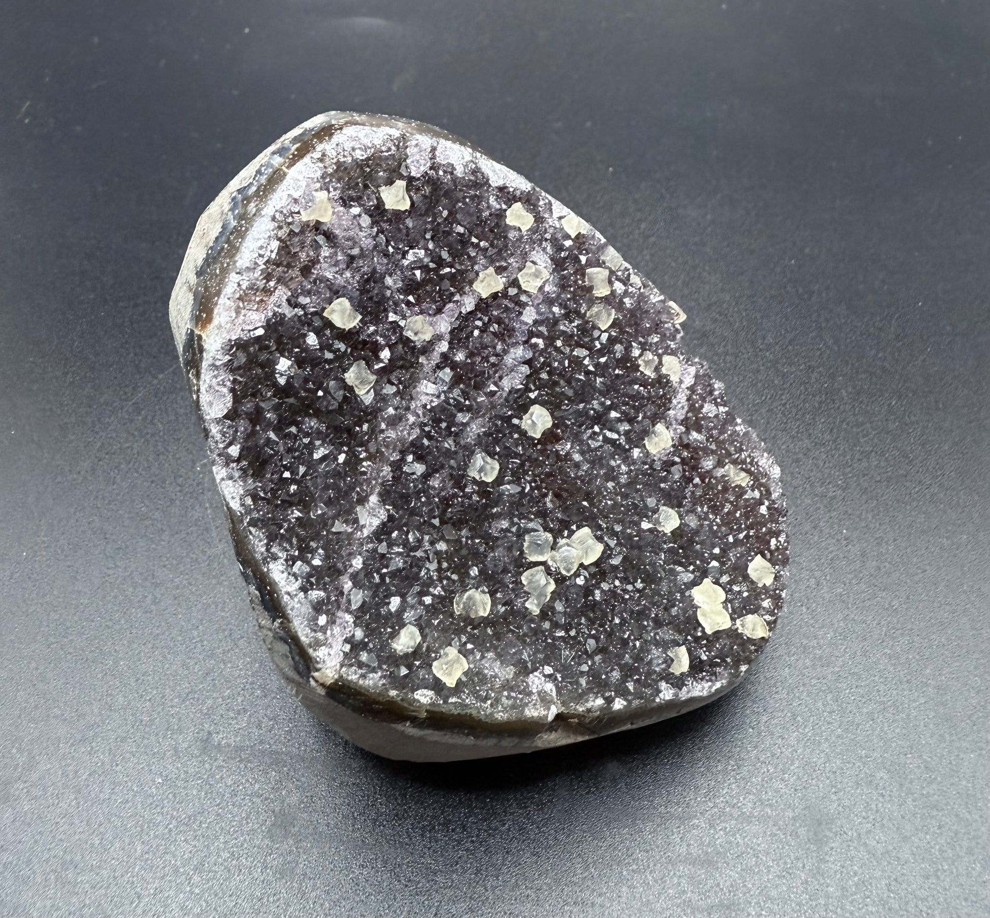 This rare formation showcases deep red-toned amethyst with striking calcite cube inclusions scattered across the surface. The contrast between the fiery amethyst and soft yellow calcite makes it a standout collector’s piece.