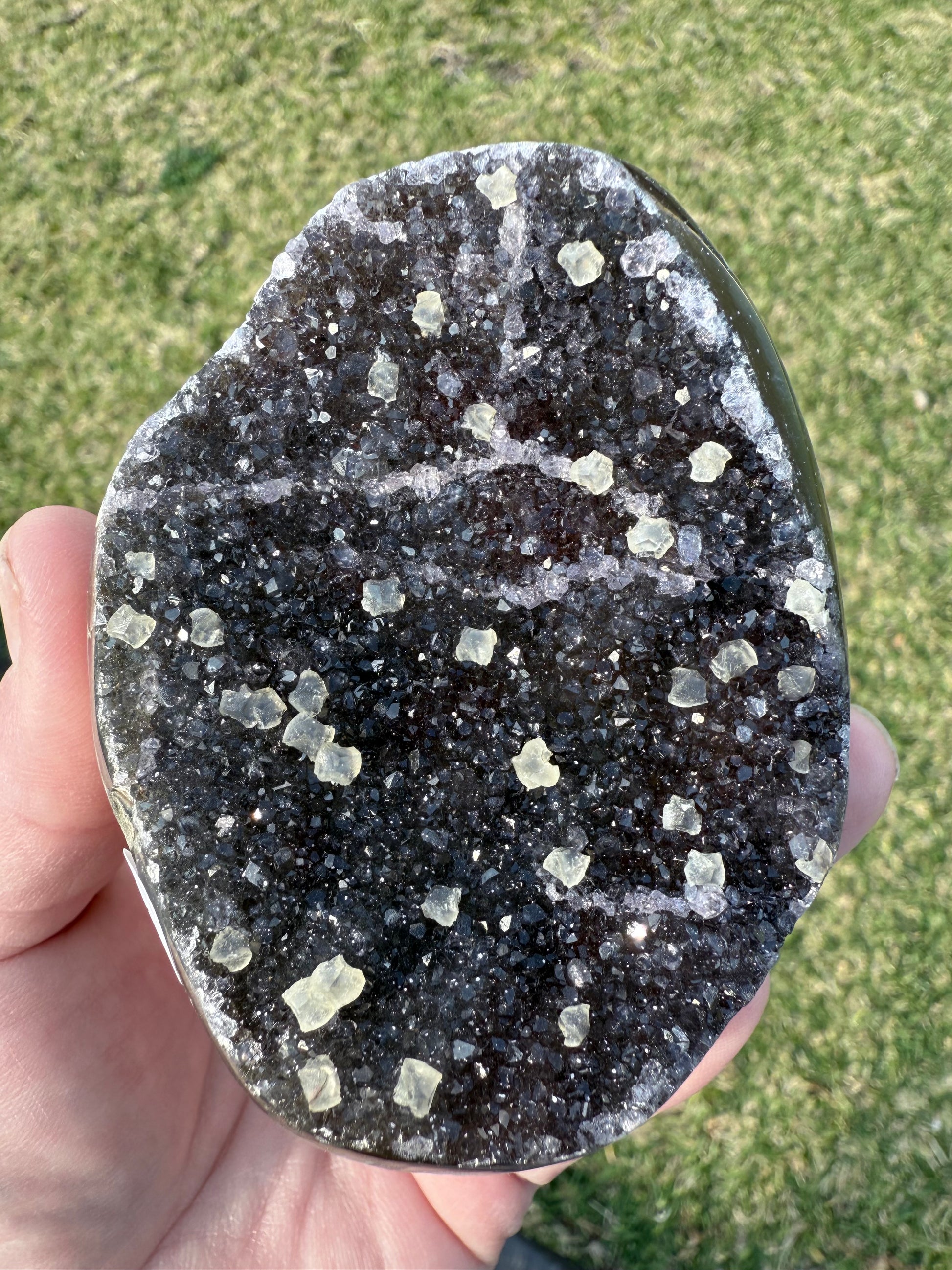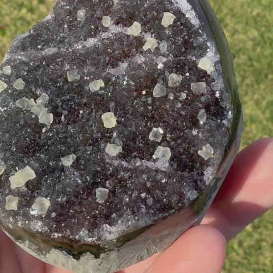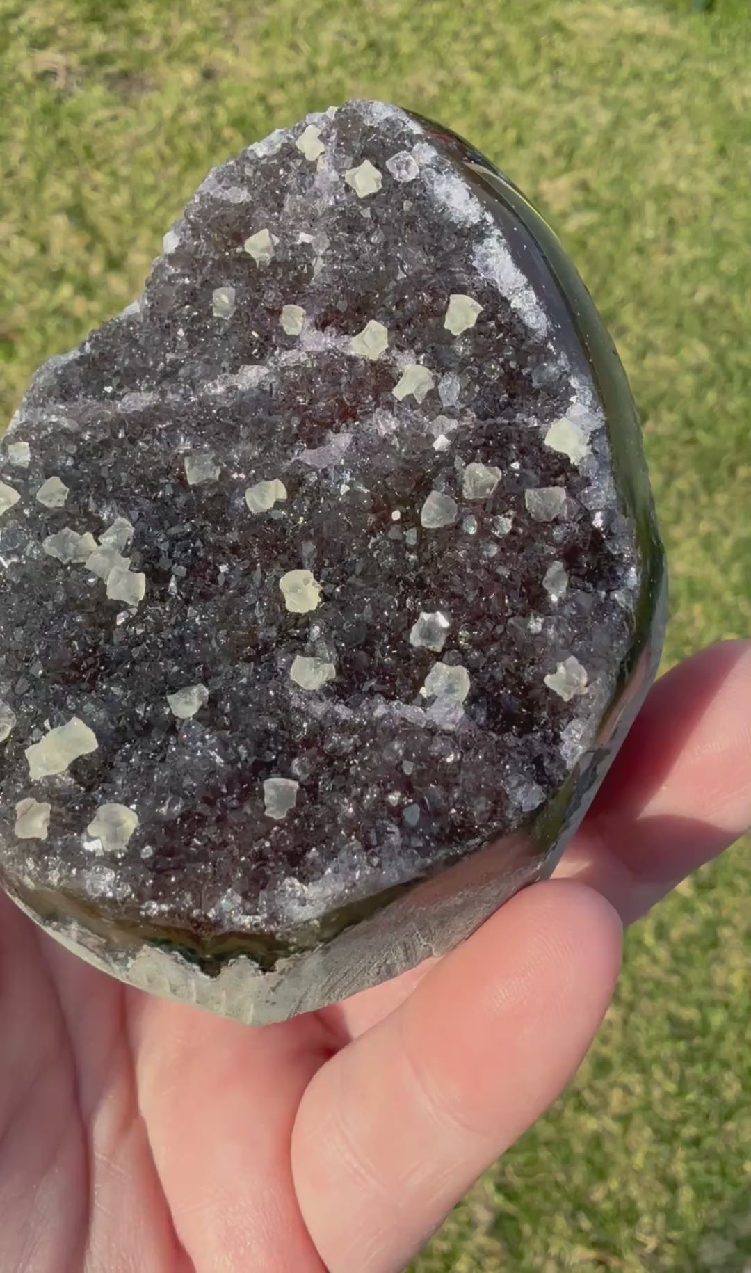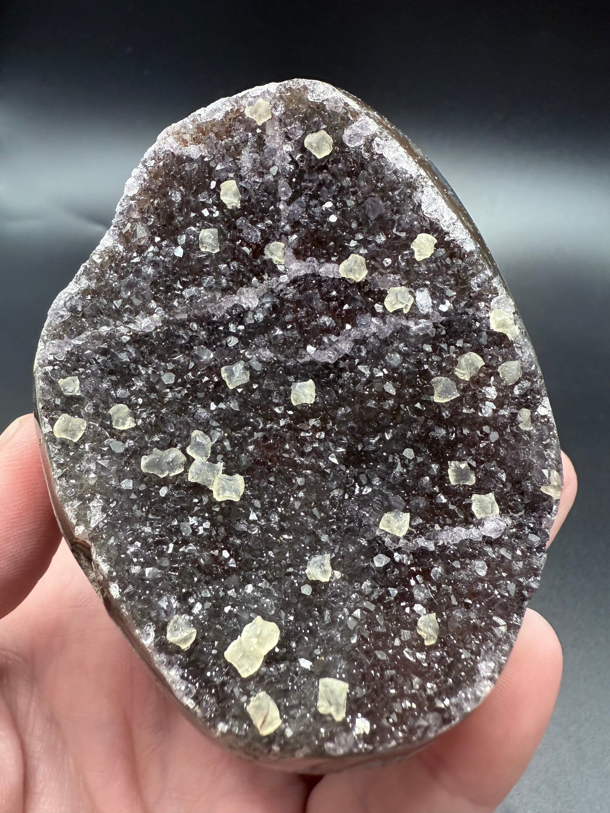 This rare formation showcases deep red-toned amethyst with striking calcite cube inclusions scattered across the surface. The contrast between the fiery amethyst and soft yellow calcite makes it a standout collector’s piece.