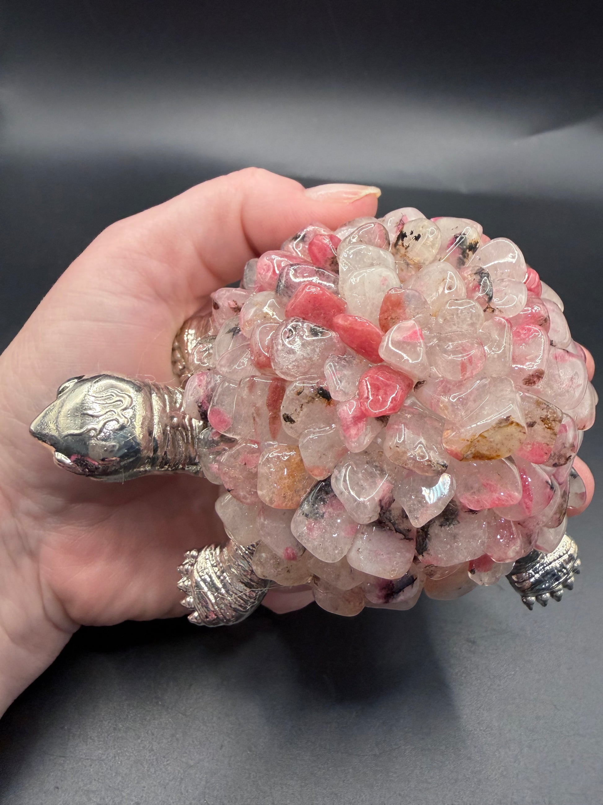 This beautiful Rhodonite Crystal Turtle Lamp is a unique statement piece, combining the gentle, heart-healing energy of Rhodonite with the symbolic wisdom and protection of the turtle.
