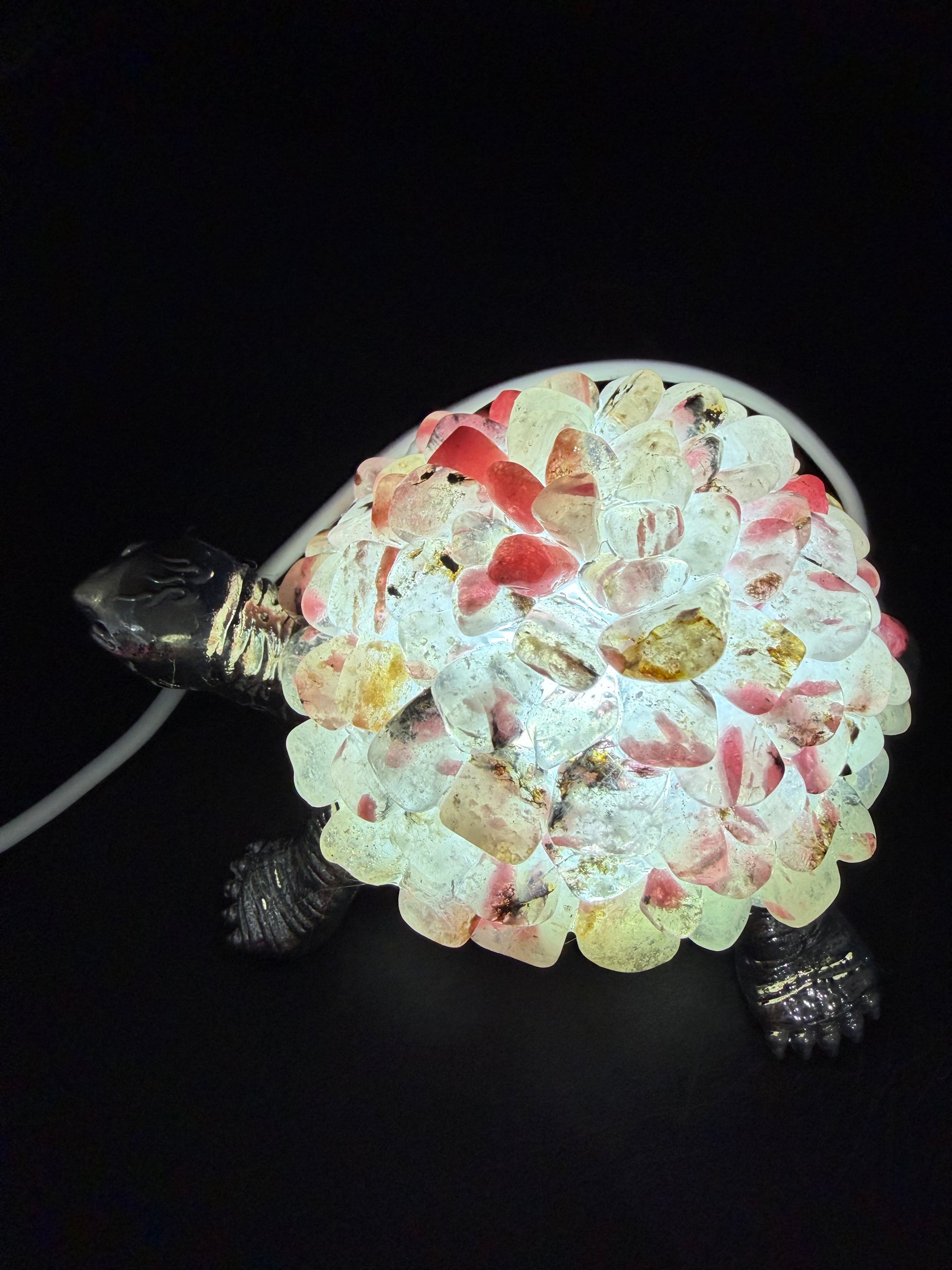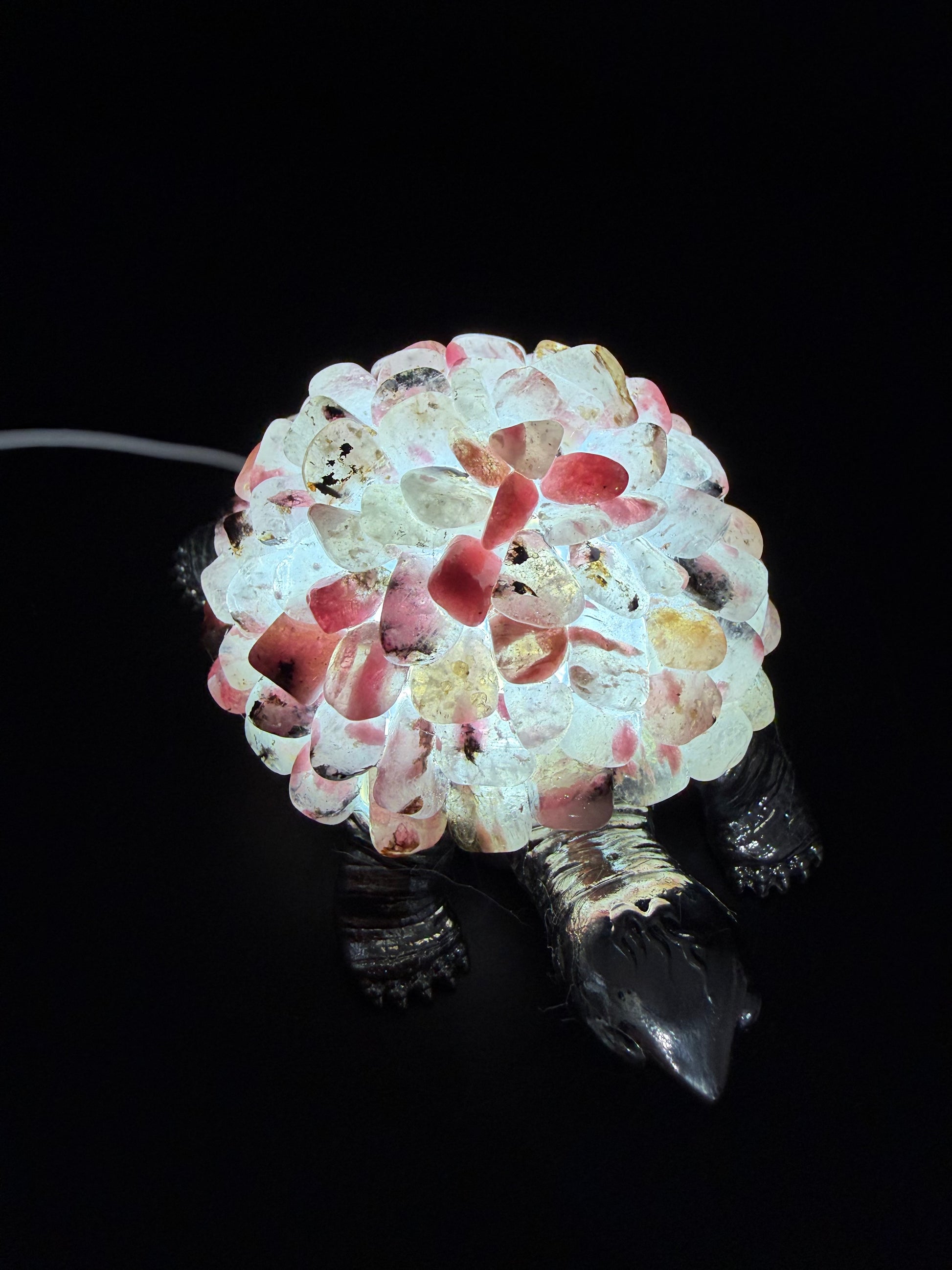 Handcrafted with polished natural Rhodonite crystal chips, each turtle is one of a kind, featuring soft pink tones with natural black veining. When illuminated, the crystal shell glows warmly, creating a calming and soothing ambience perfect for bedrooms, meditation spaces, or bedside tables.