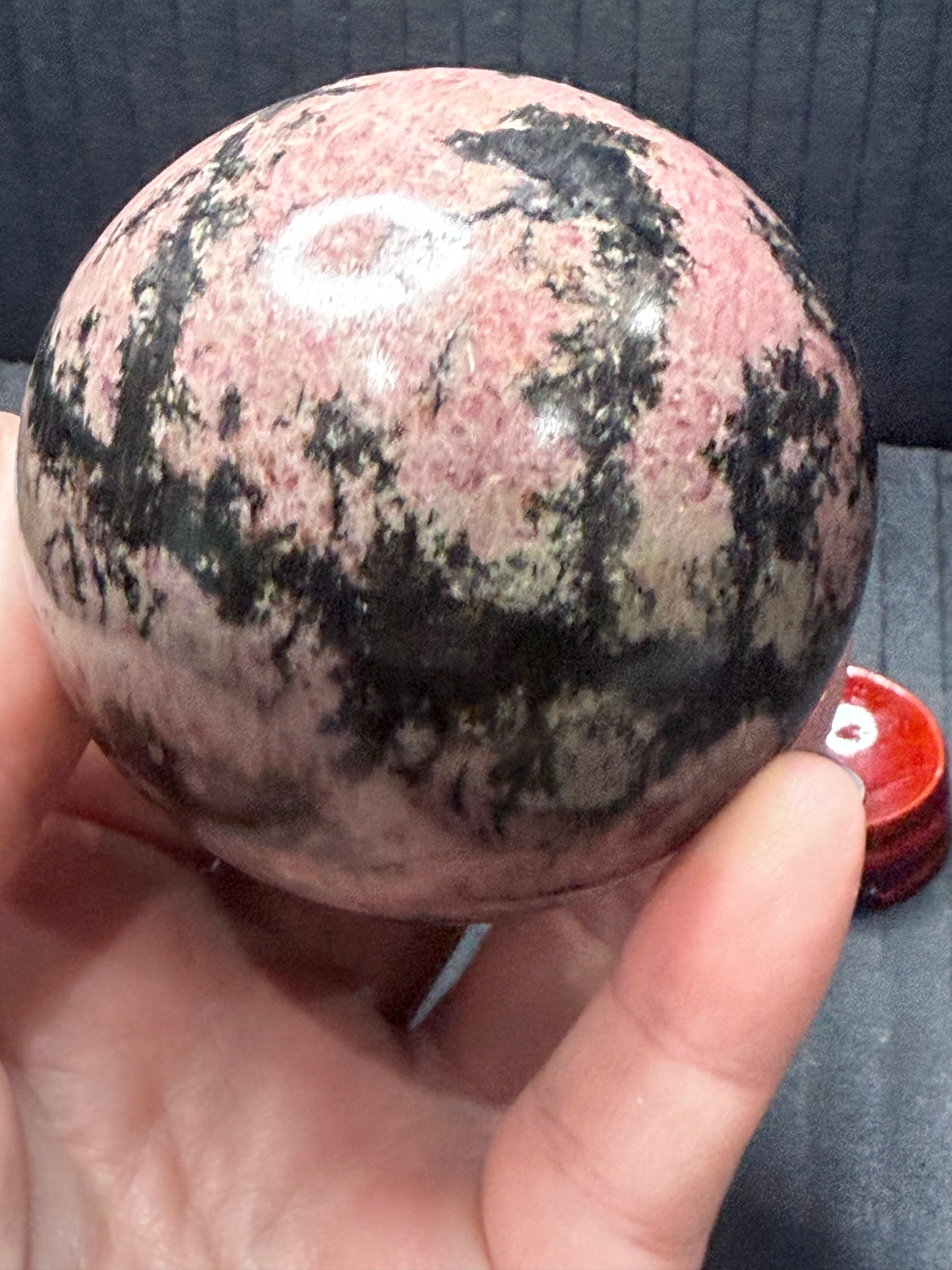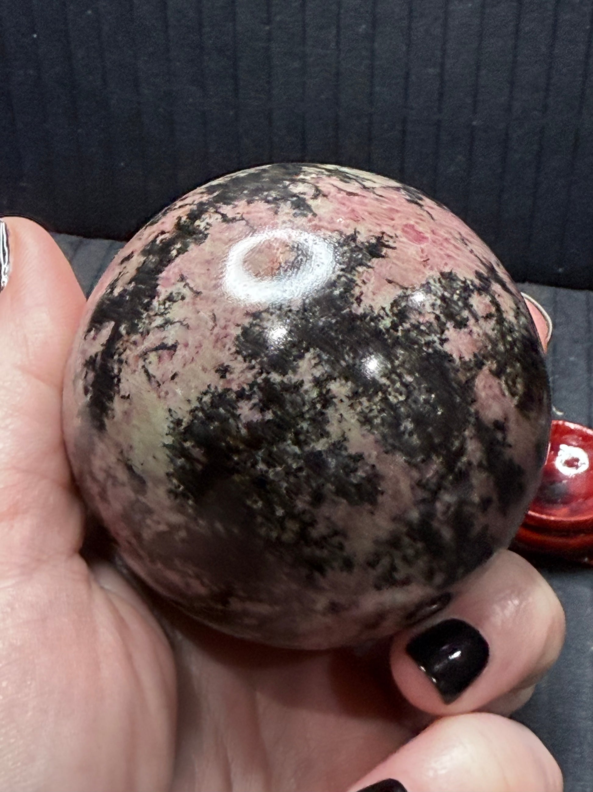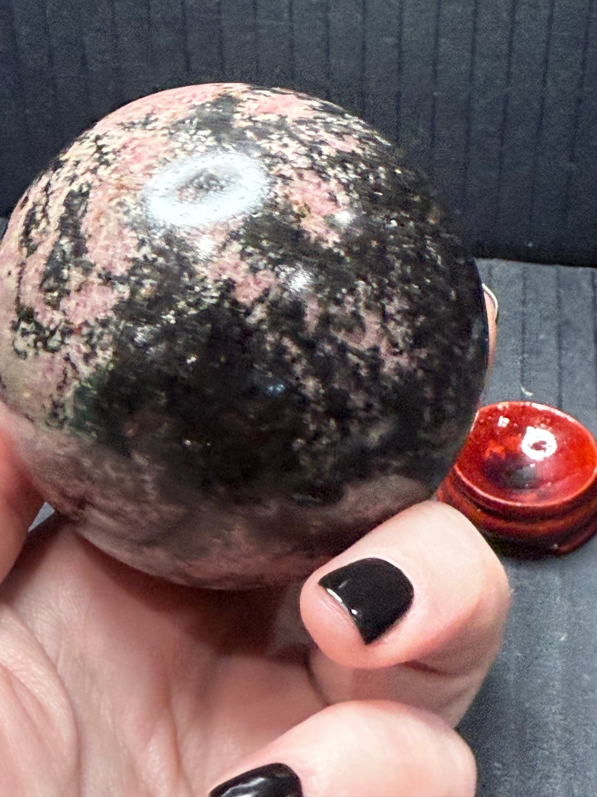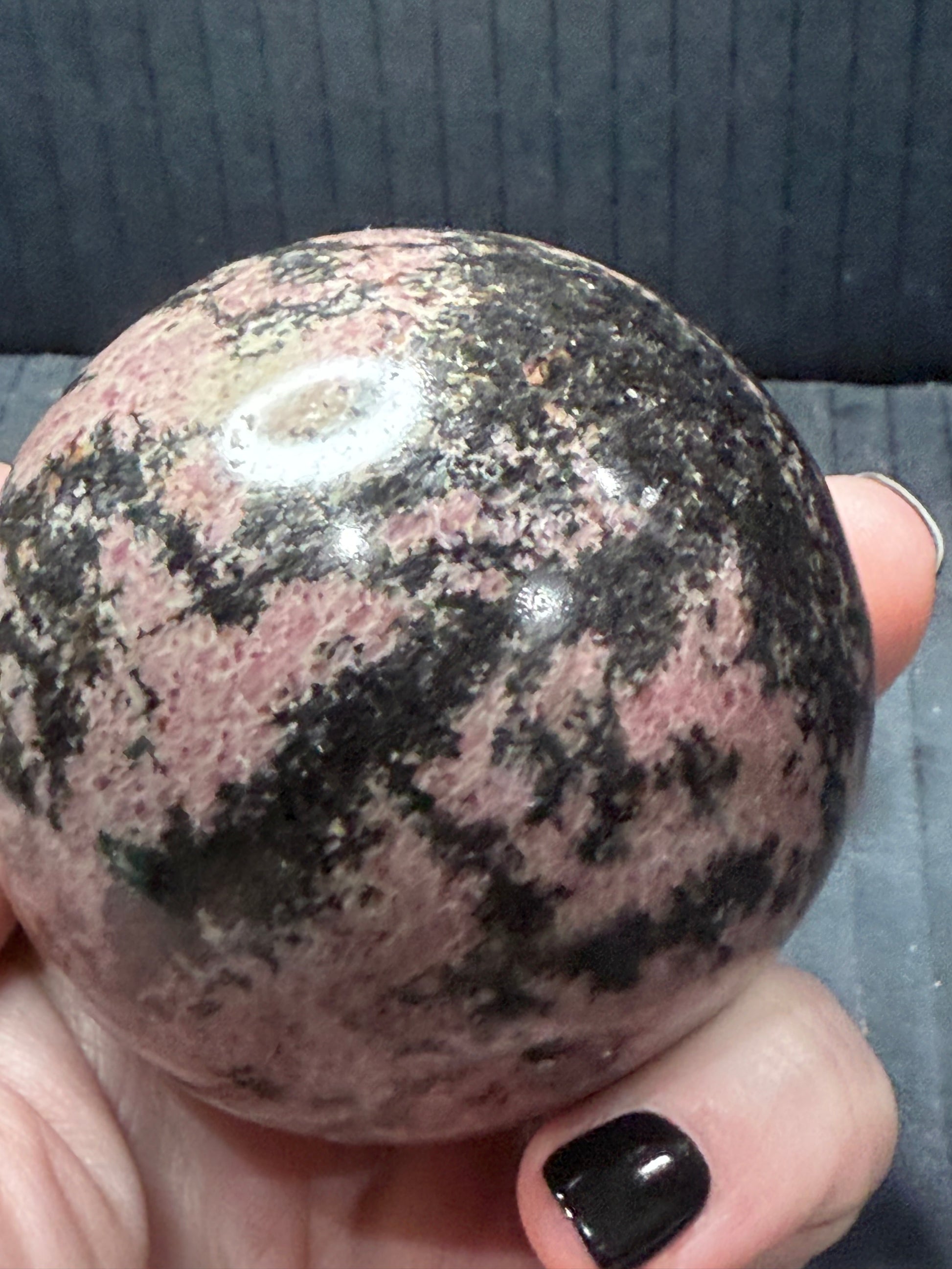 Radiating gentle yet powerful energy, this Rhodonite sphere promotes emotional healing, compassion, and balance. Its beautiful pink hues with black veining symbolize love and forgiveness, making it a perfect tool for heart-centered meditation and harmony.