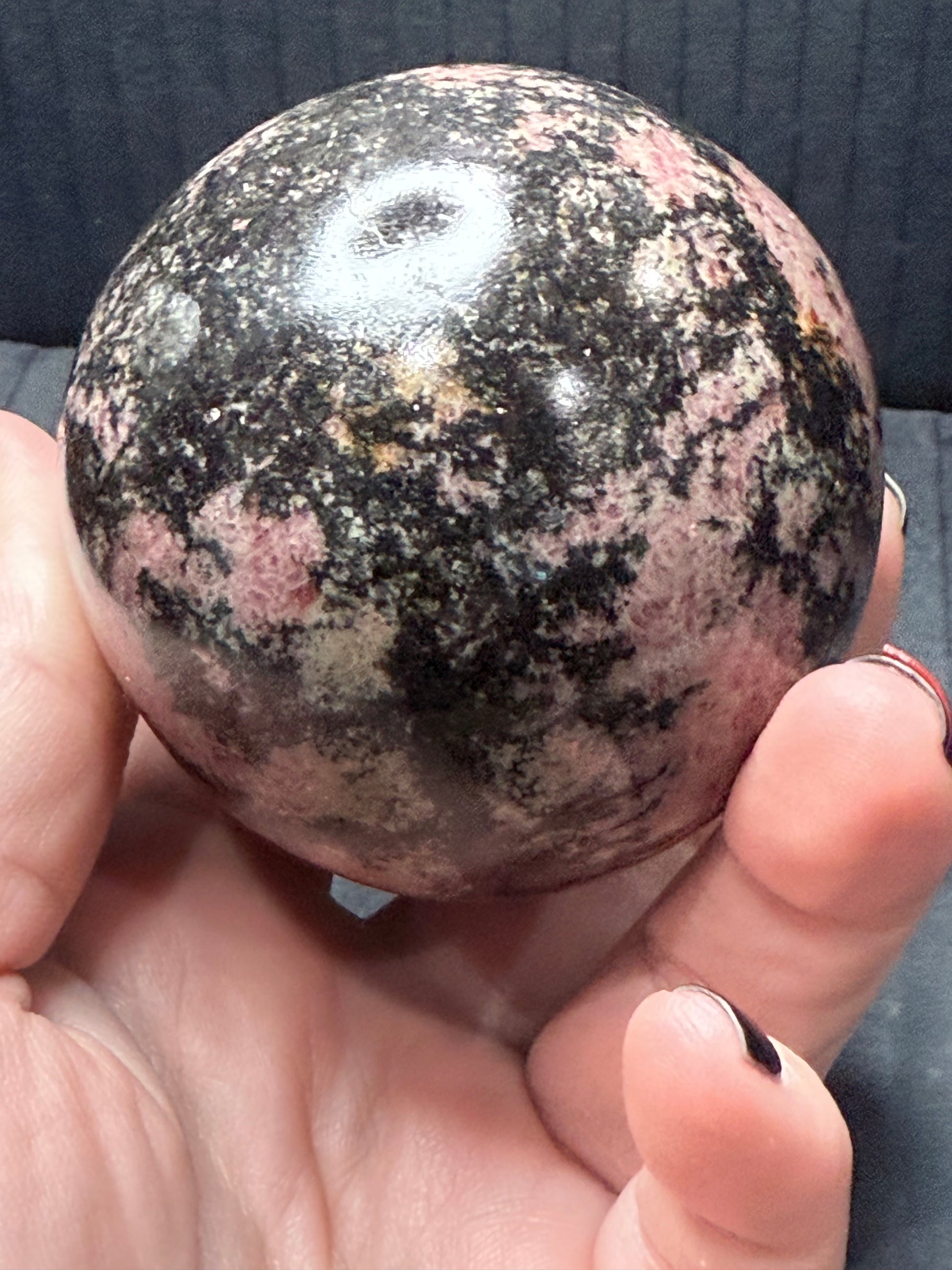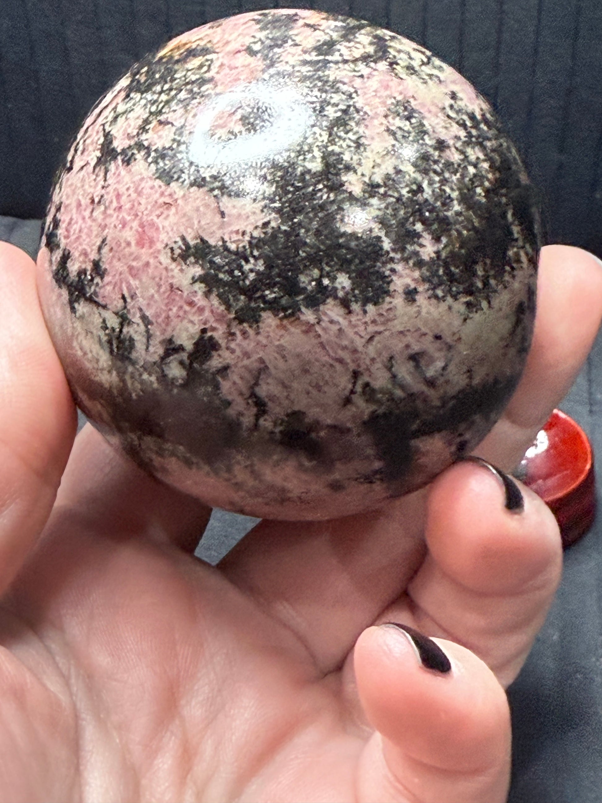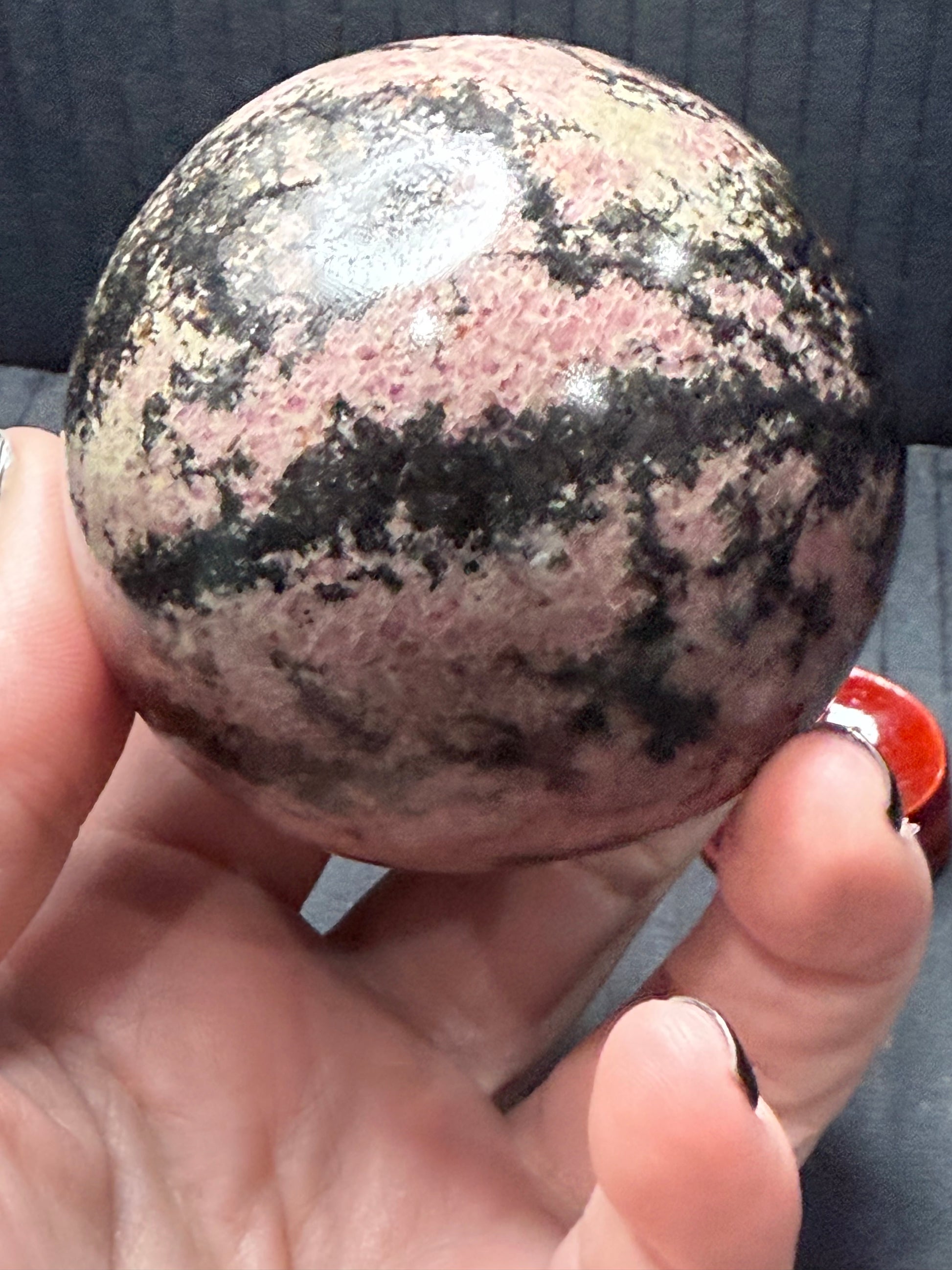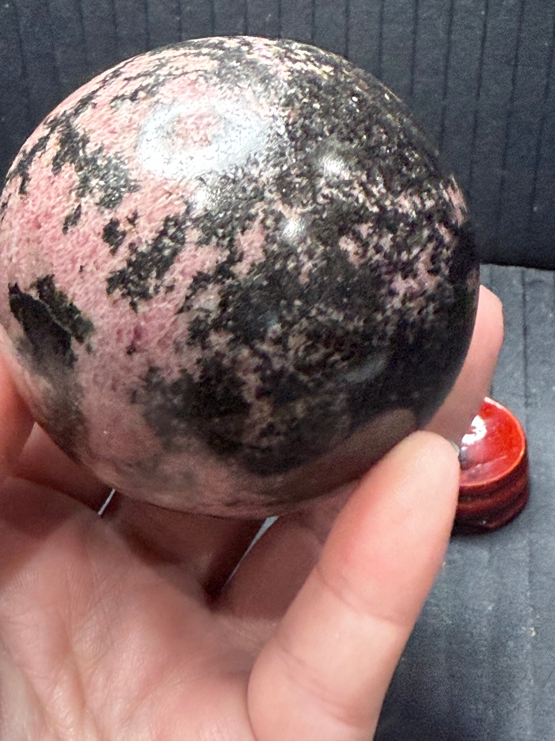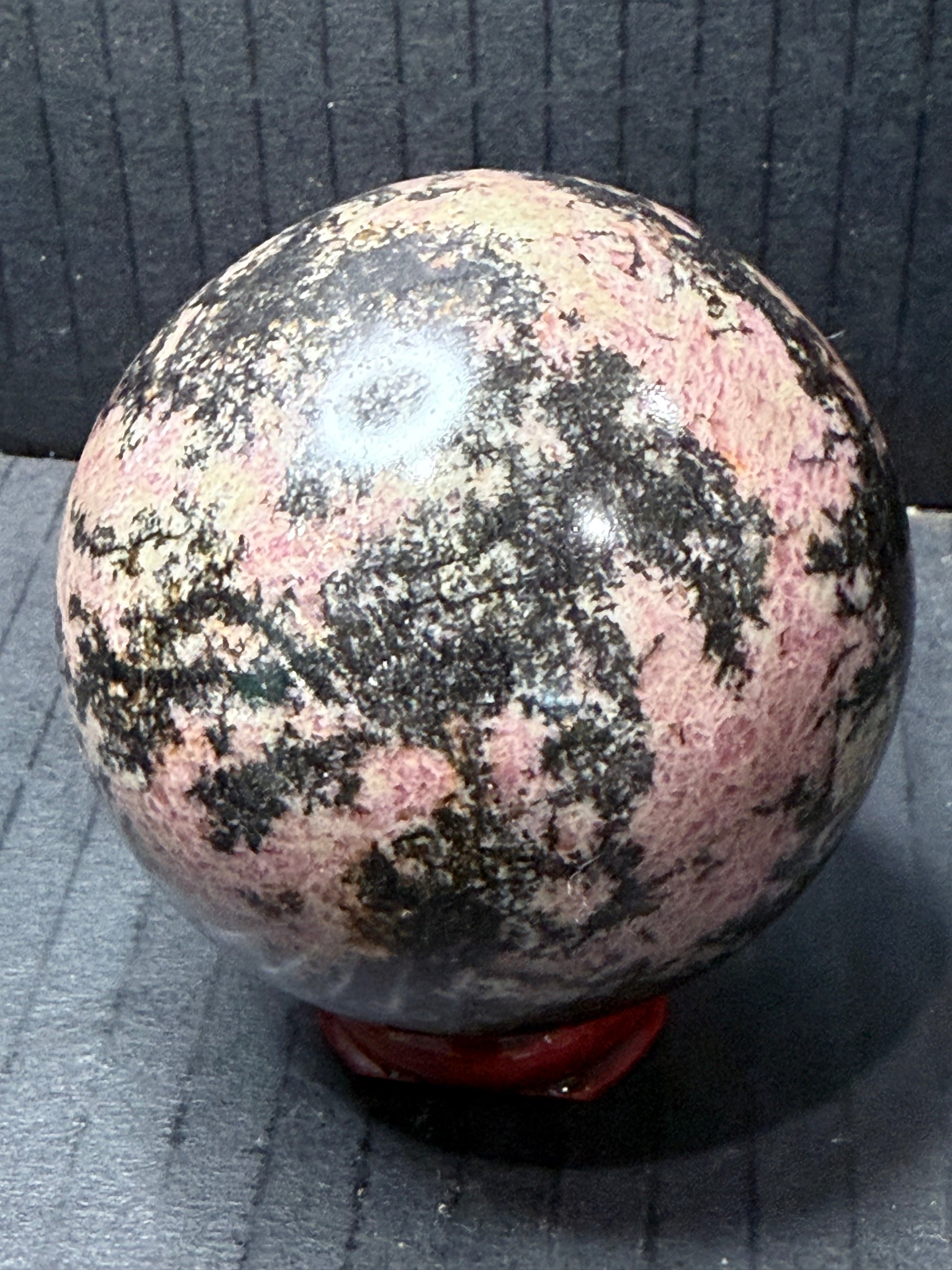 Radiating gentle yet powerful energy, this Rhodonite sphere promotes emotional healing, compassion, and balance. Its beautiful pink hues with black veining symbolize love and forgiveness, making it a perfect tool for heart-centered meditation and harmony.