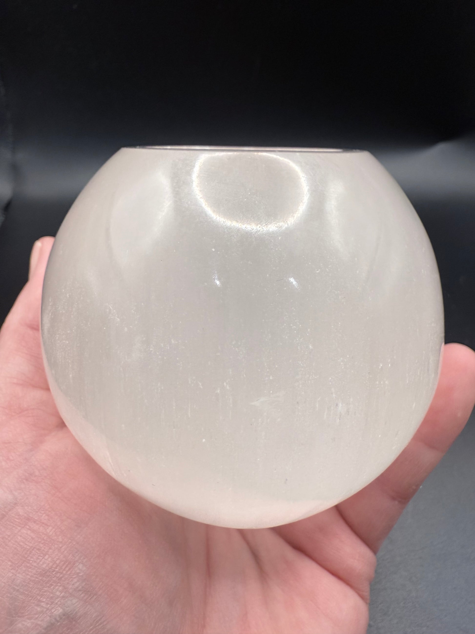 Add calming, cleansing energy to your space with this smooth Selenite sphere candle holder. When lit, it casts a soft, ethereal glow, highlighting the natural beauty of the crystal.