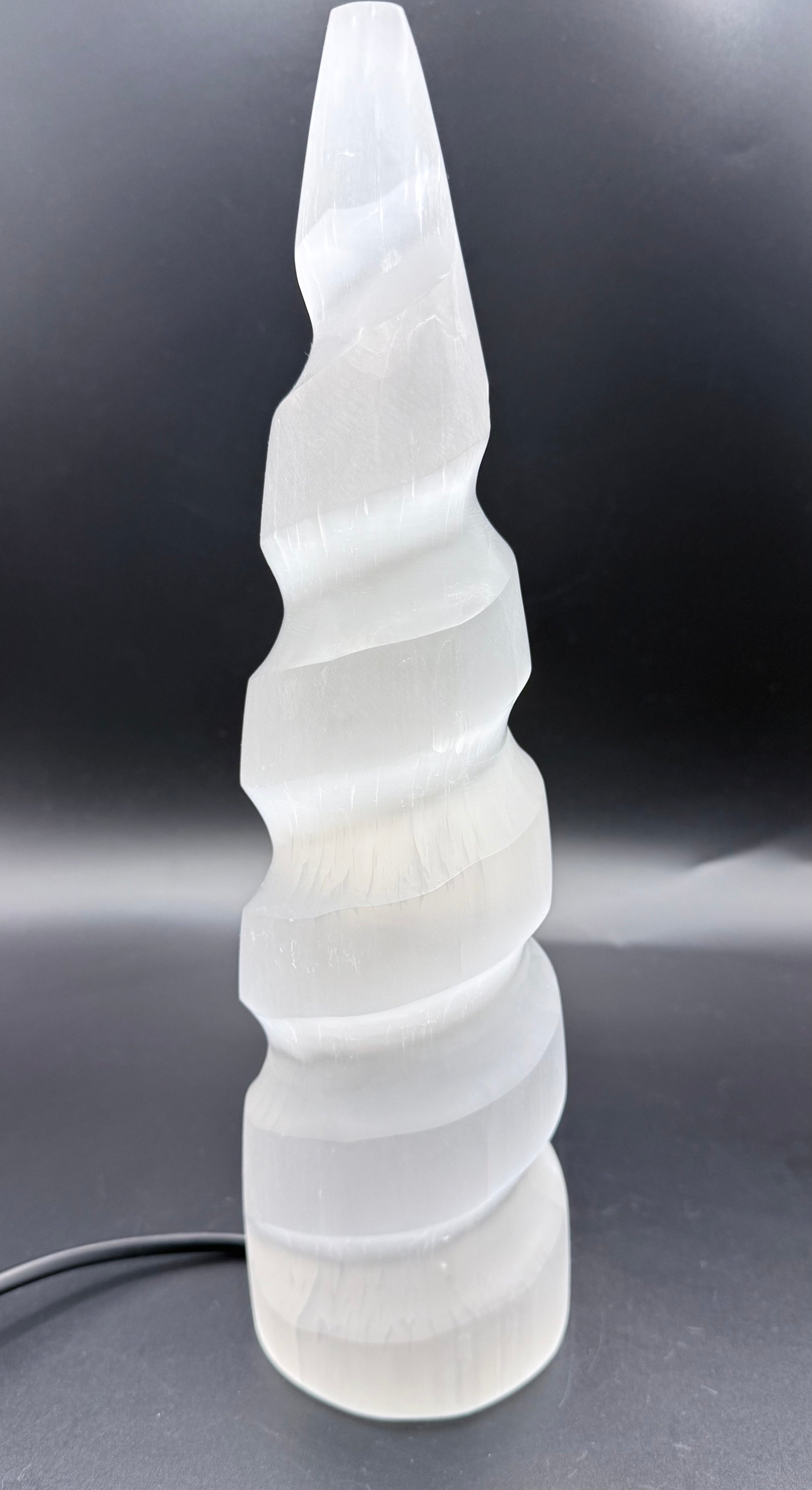 Illuminate your space with the peaceful glow of this stunning Selenite Spiral Lamp. Each piece is hand-carved from natural selenite, featuring a beautiful twisting tower design that radiates calm and cleansing energy. When lit, it emits a soft white light that brings serenity and harmony to any room.