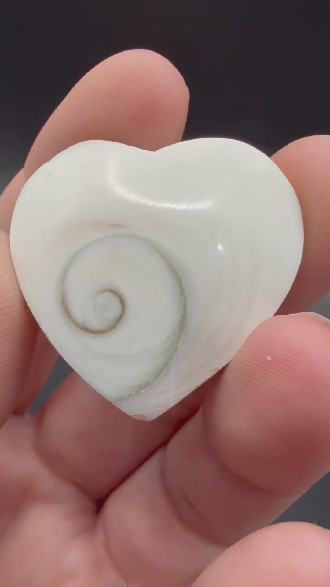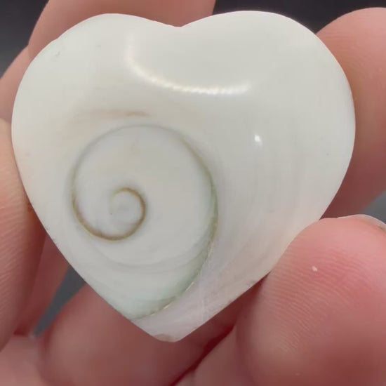 Lovely carved Shiva Eye shell in heart shape. One side shows the natural spiral, the other soft creamy tones.