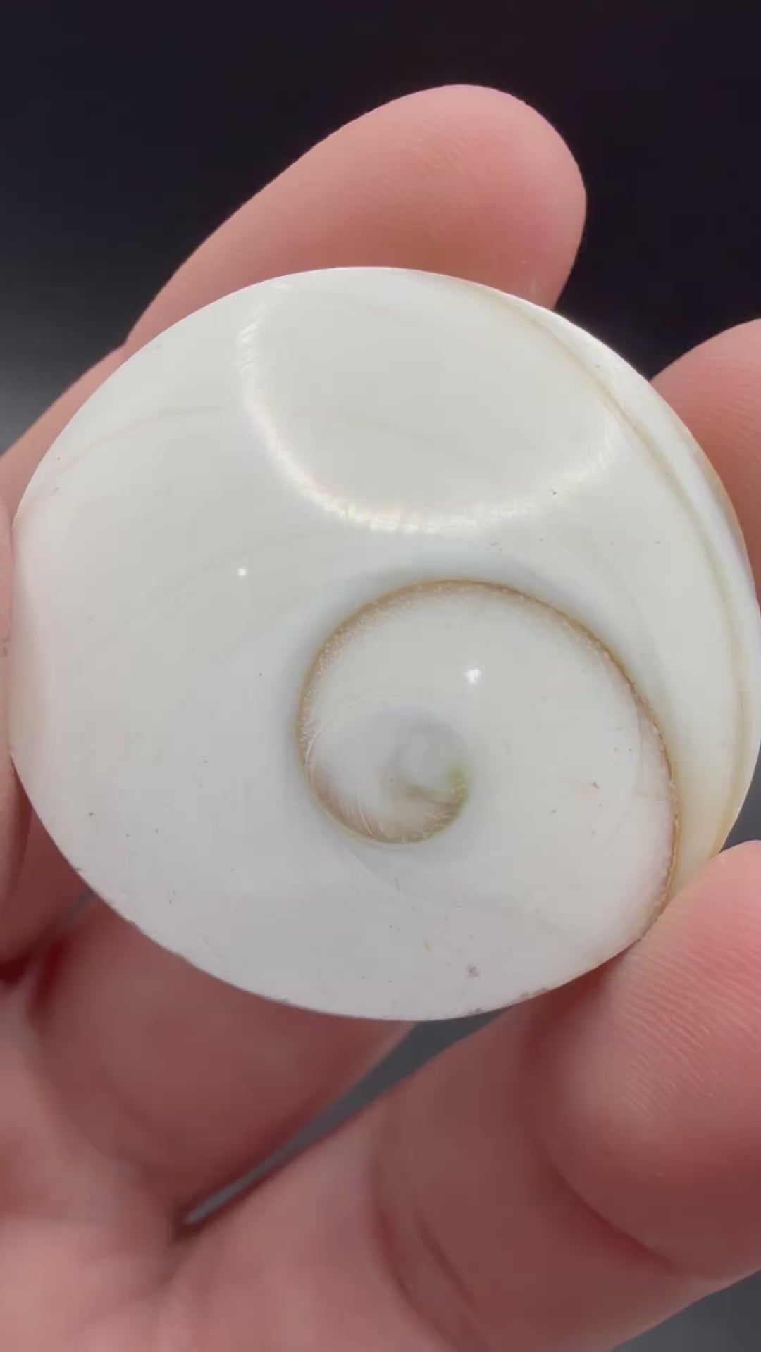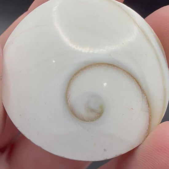 Polished Shiva Eye shell in classic round form. Spiral side is clear with soft banding on reverse.