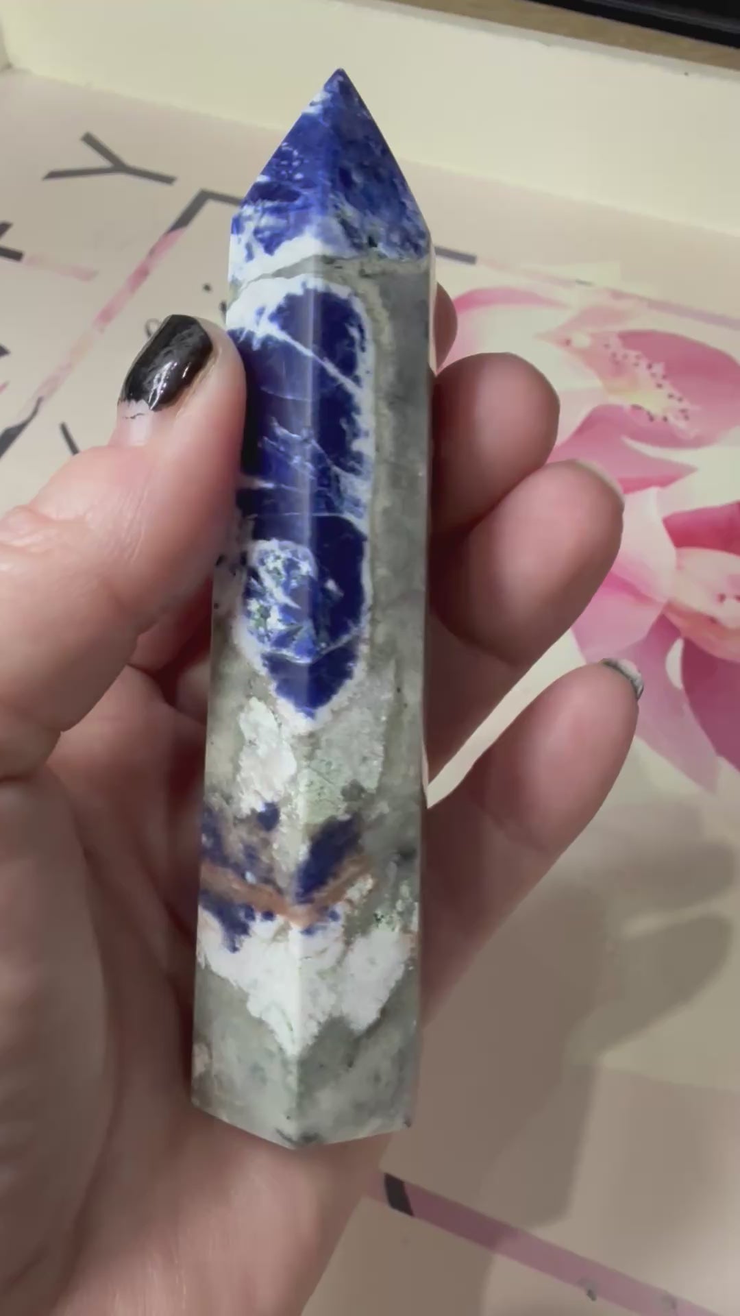 Sodalite! š It's a beautiful blue crystal, often with white streaks or flecks, known for its calming and soothing energy. Sodalite is believed to promote: