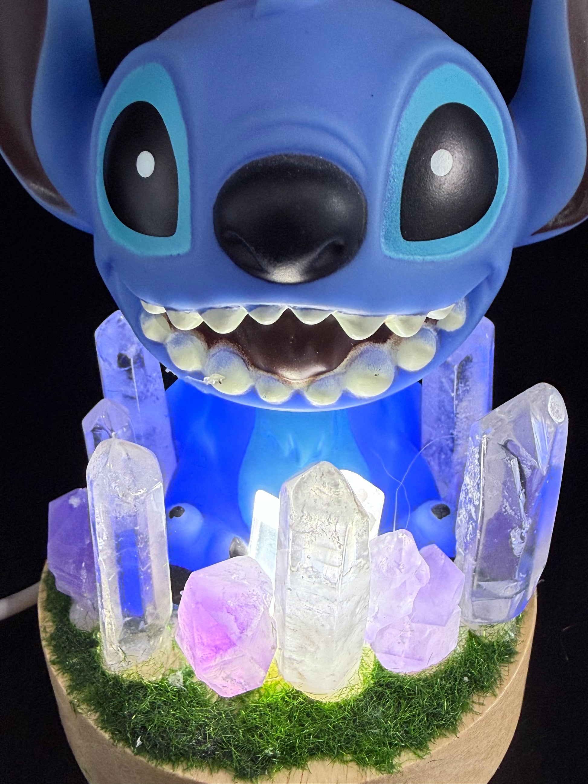Bring joy and light to your space with this Stitch Crystal Light Bobble Head — a playful creation that combines your favourite cheeky alien with the healing energy of real crystals.