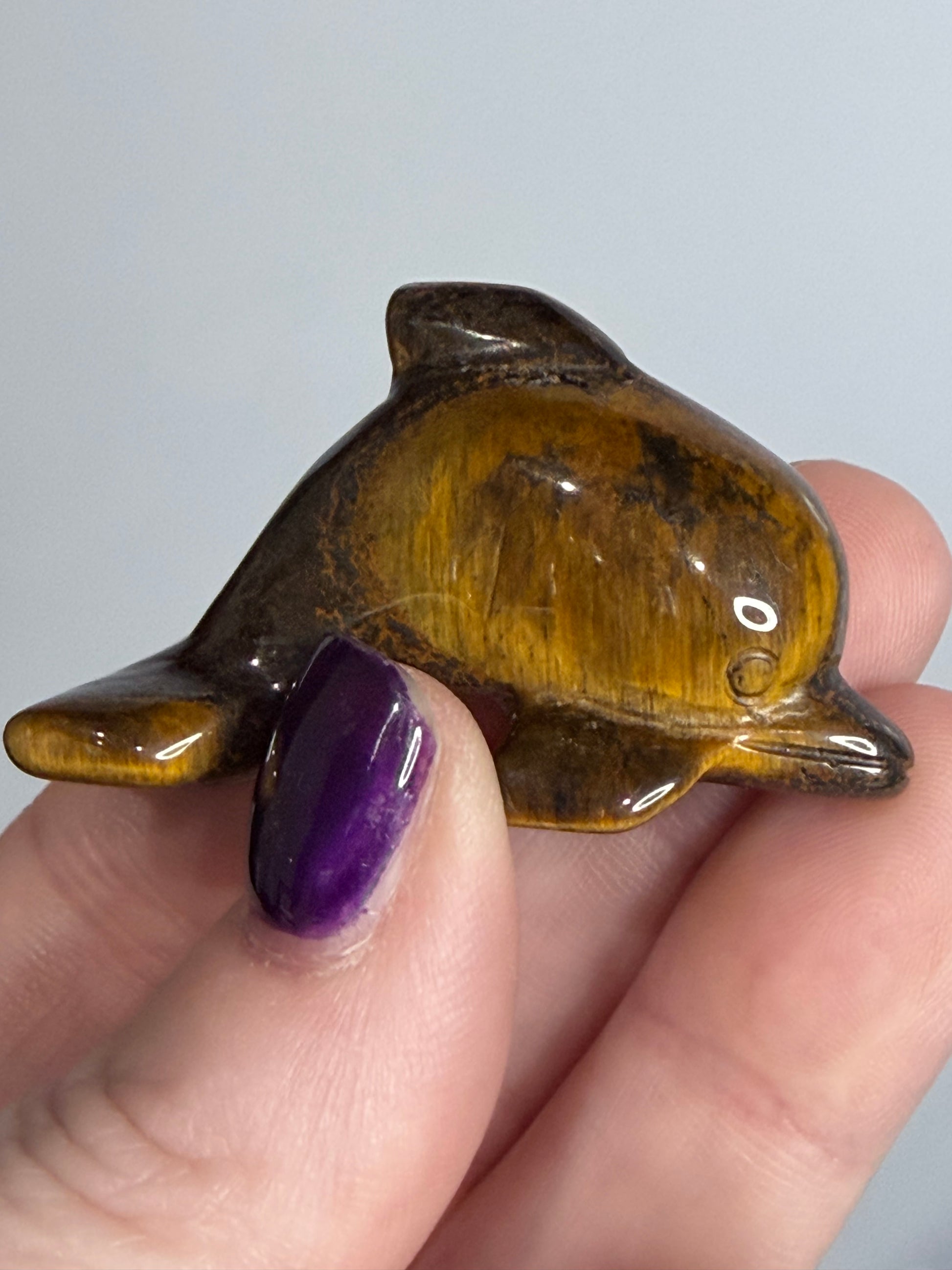 This charming Tiger’s Eye Dolphin carving features warm golden-brown tones with natural silky shimmer throughout the stone. Despite its smaller size, this piece still displays beautiful banding and a smooth, high-polish finish.