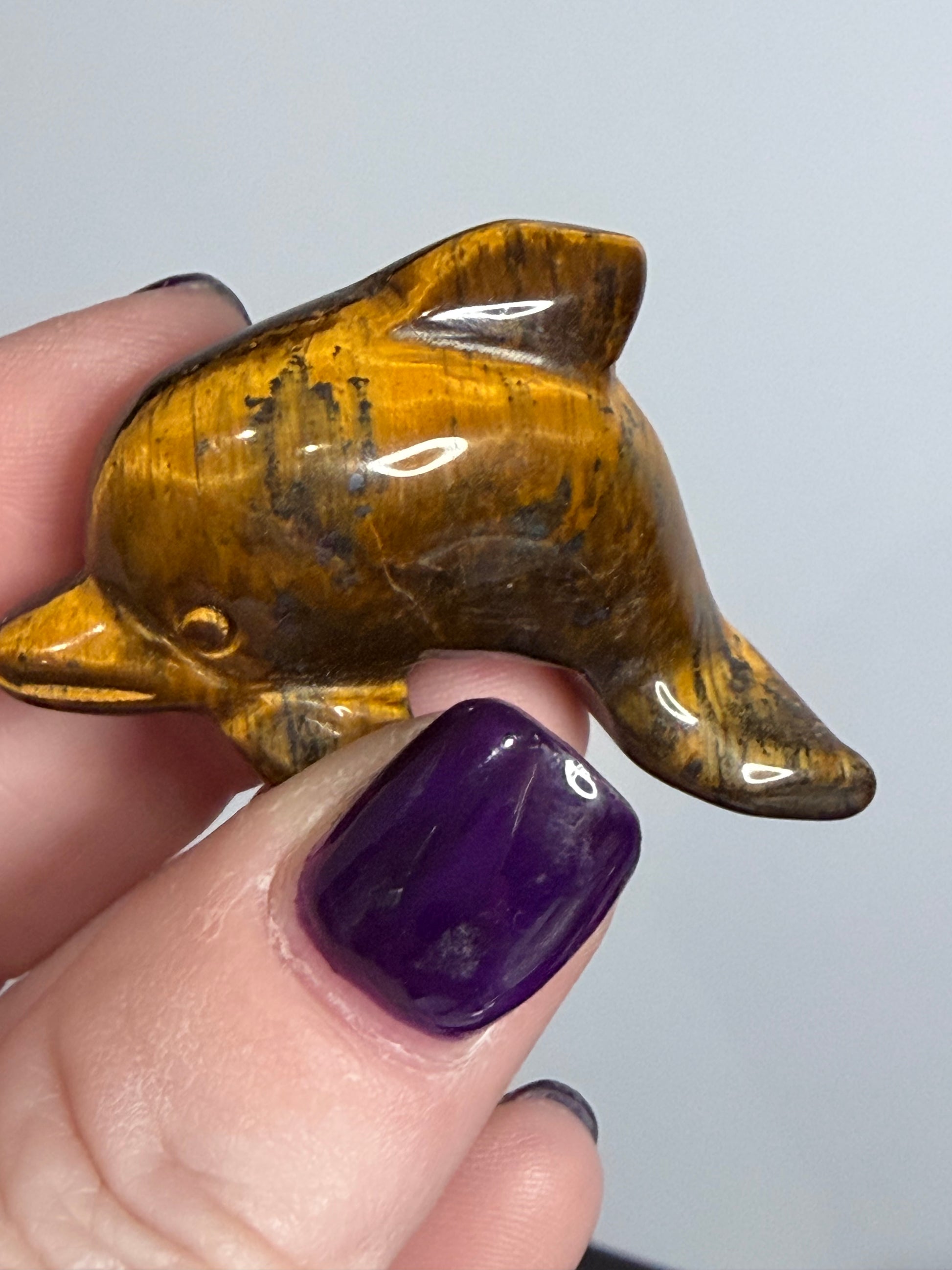 Dolphins symbolise joy, freedom, protection, and emotional balance, while Tiger’s Eye is known for encouraging confidence, courage, and grounding energy. Together, they create a supportive and uplifting carving that’s perfect to keep close or display in any space.
