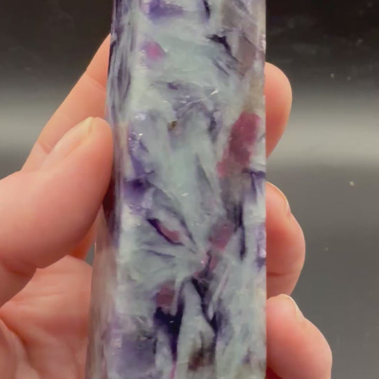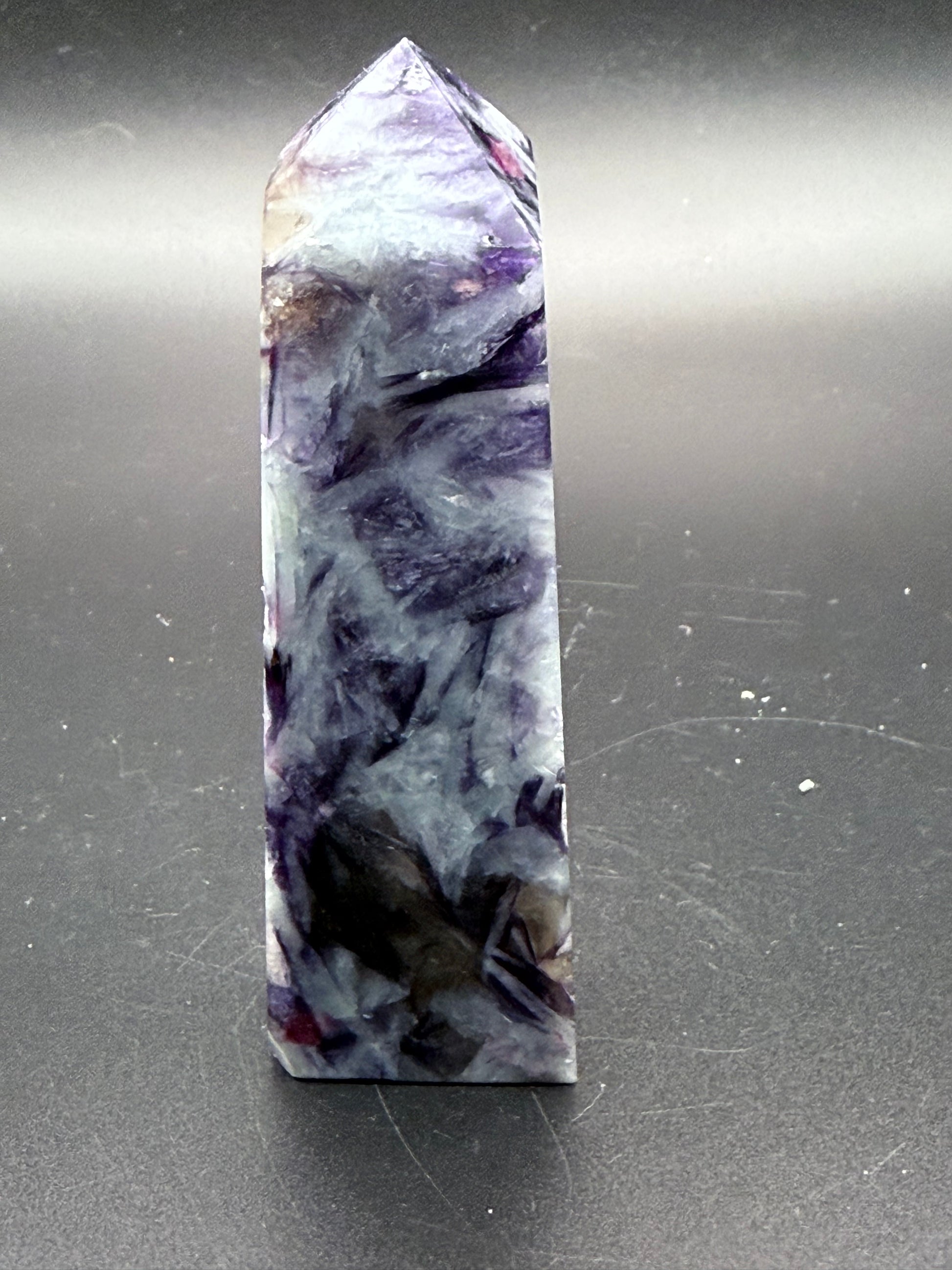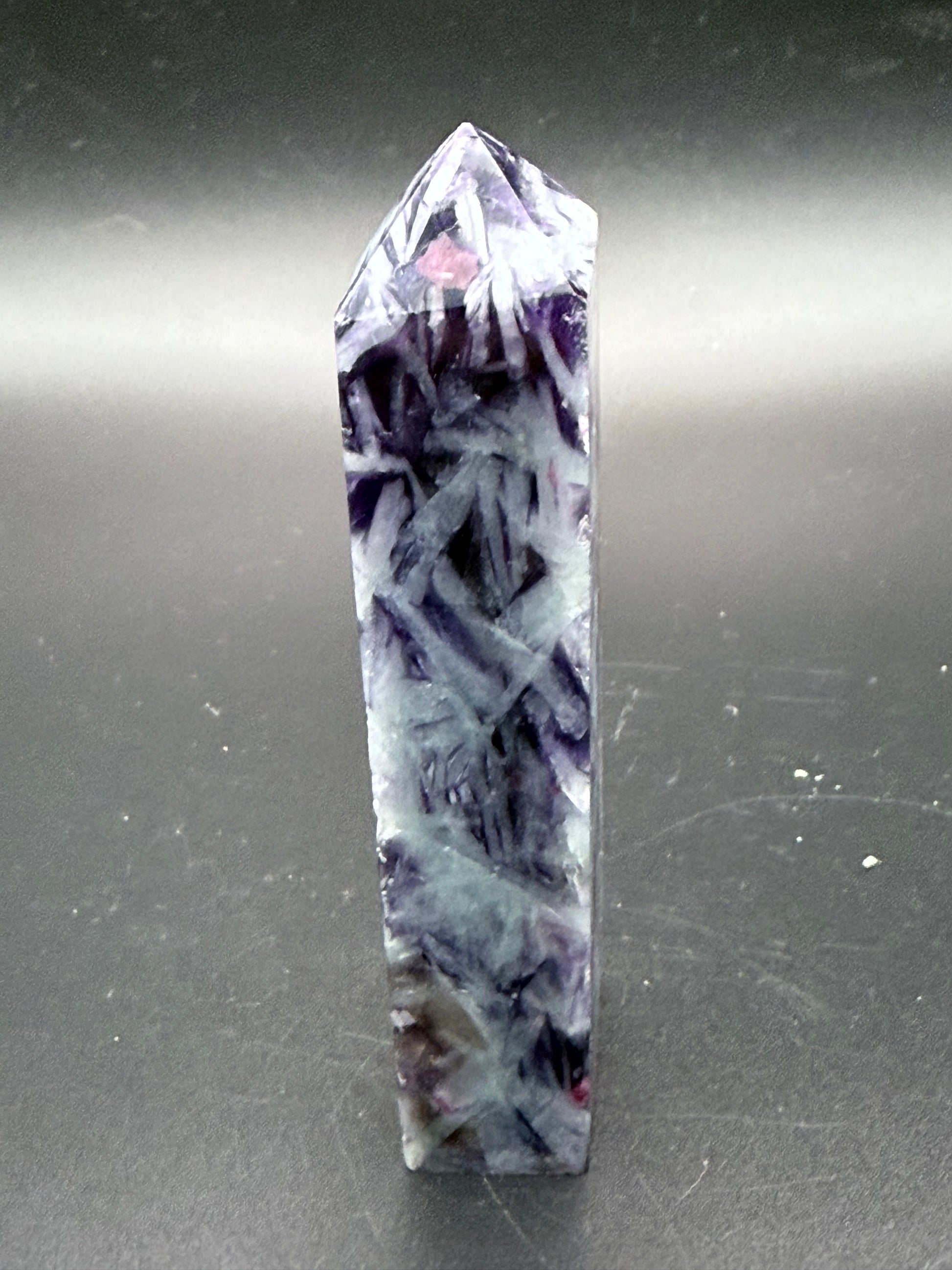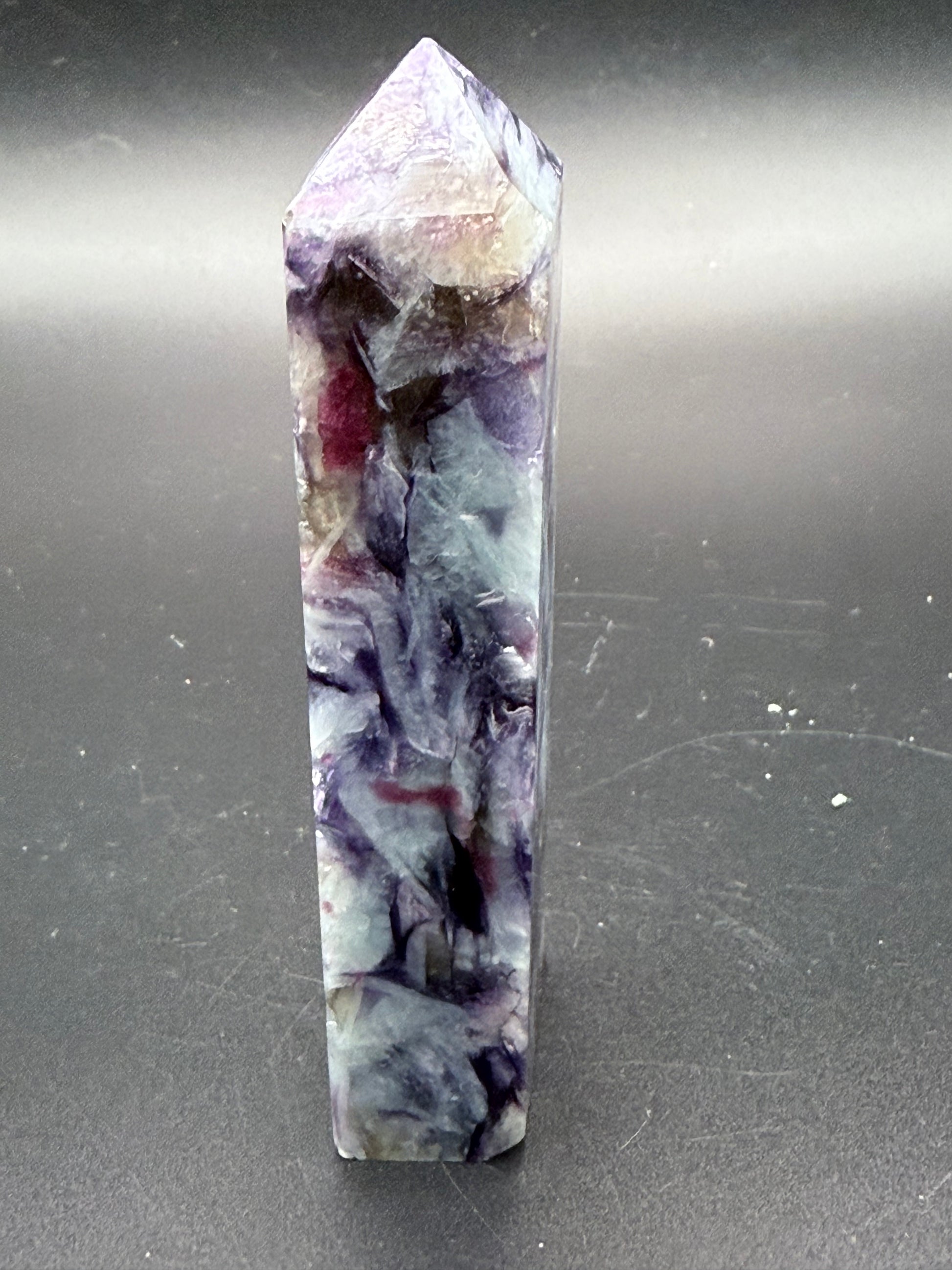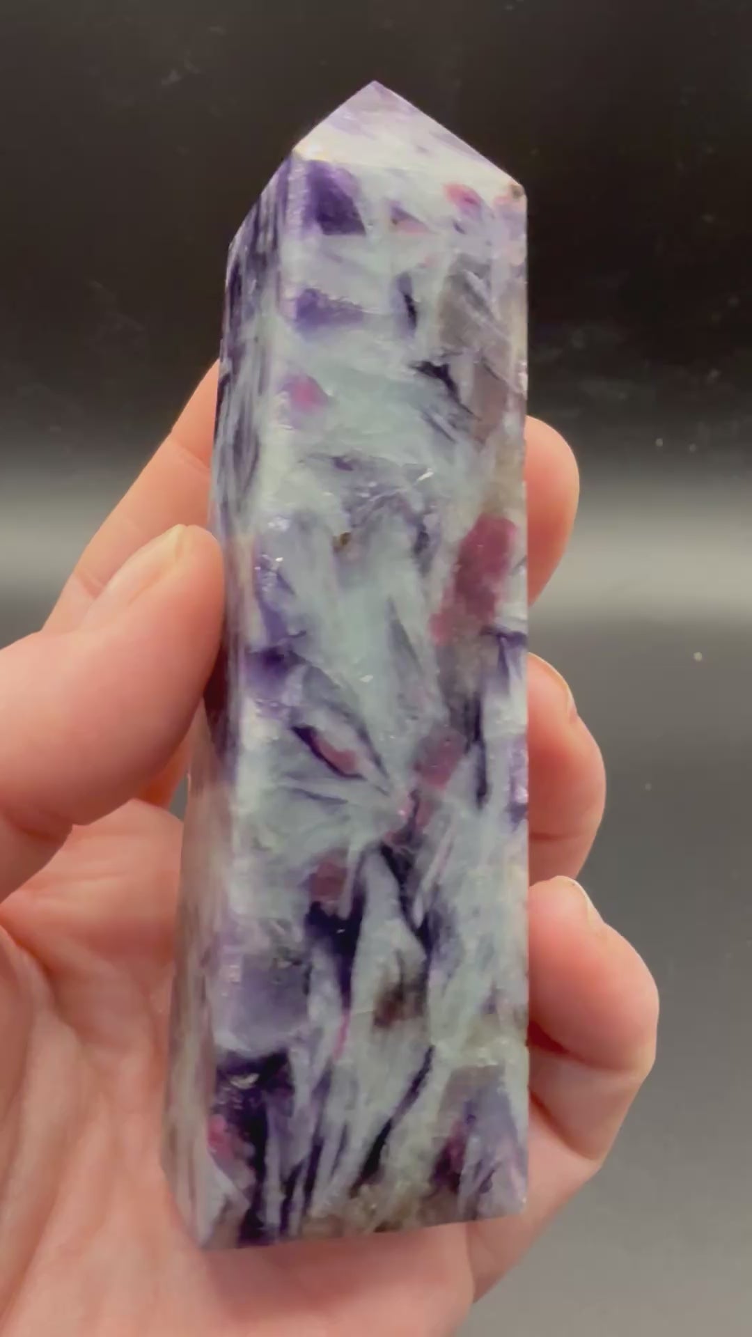 This is the second largest of three rare towers, showcasing a beautiful fusion of aquamarine, lepidolite, and sparkling mica. Aquamarine brings gentle, calming energy and encourages clear, heartfelt communication. Lepidolite is a stone of peace and balance, while mica adds a soft shimmer that reflects light and magic.