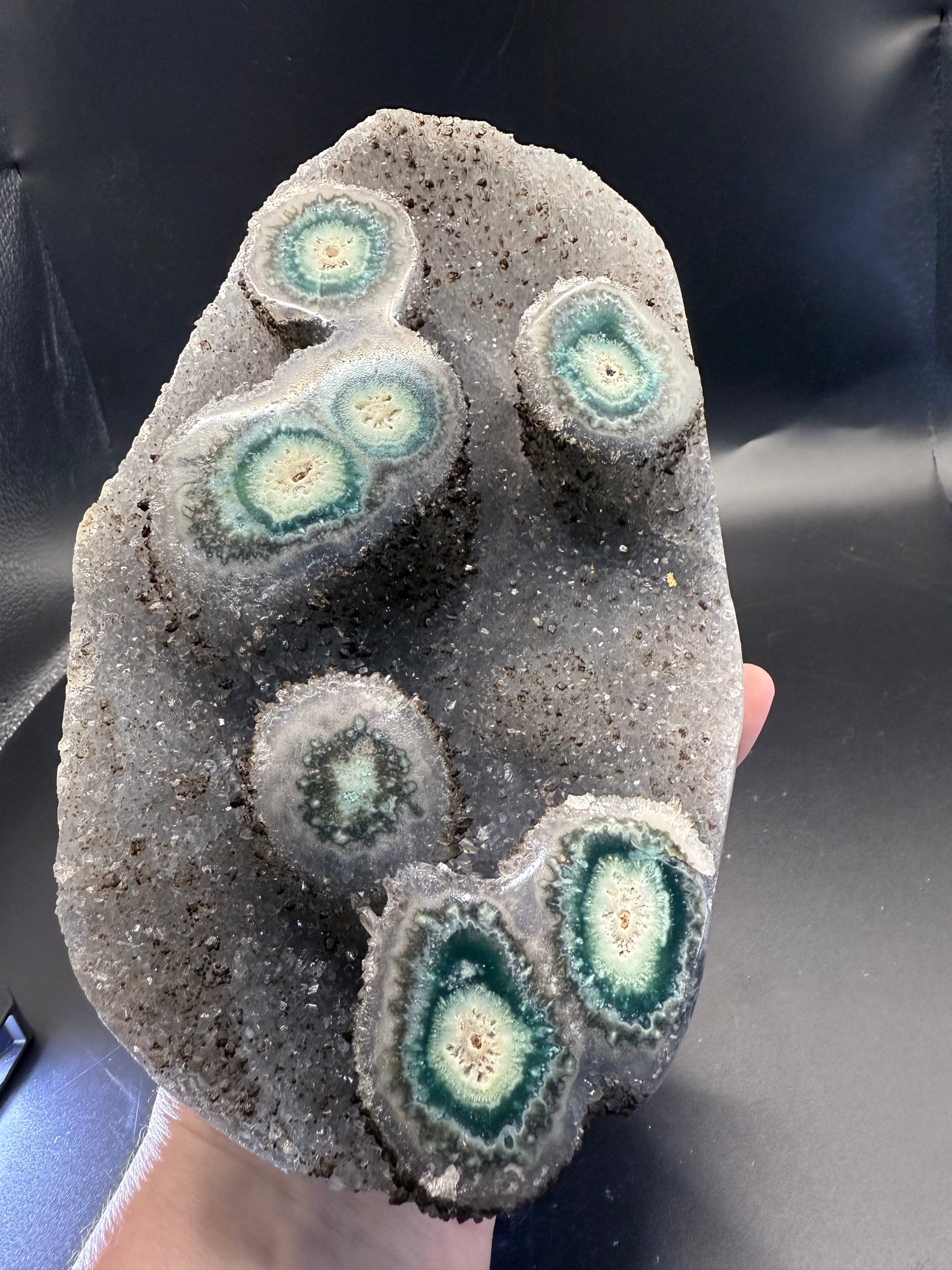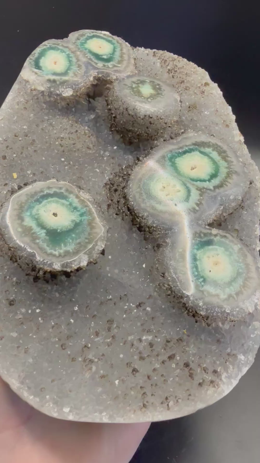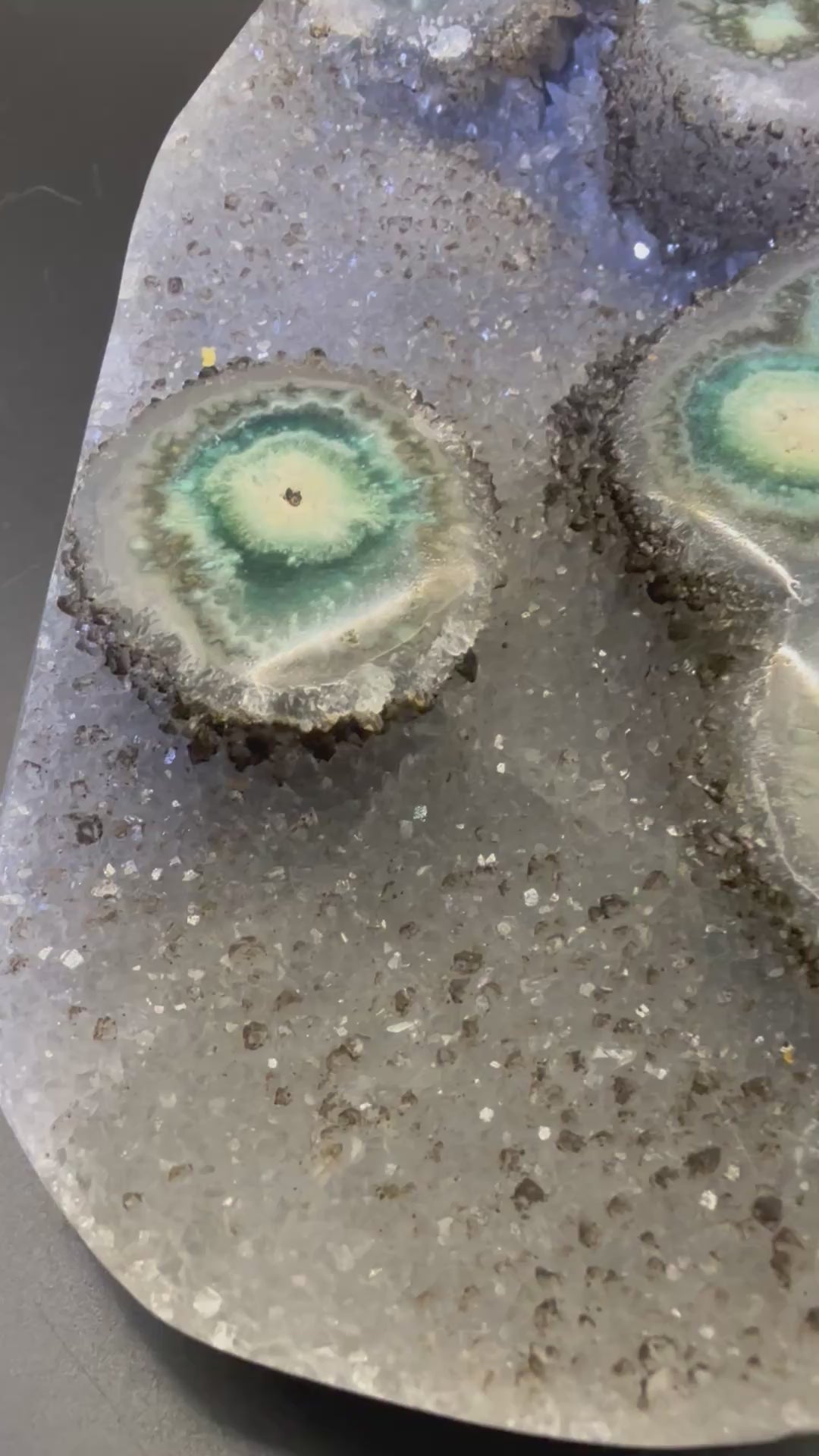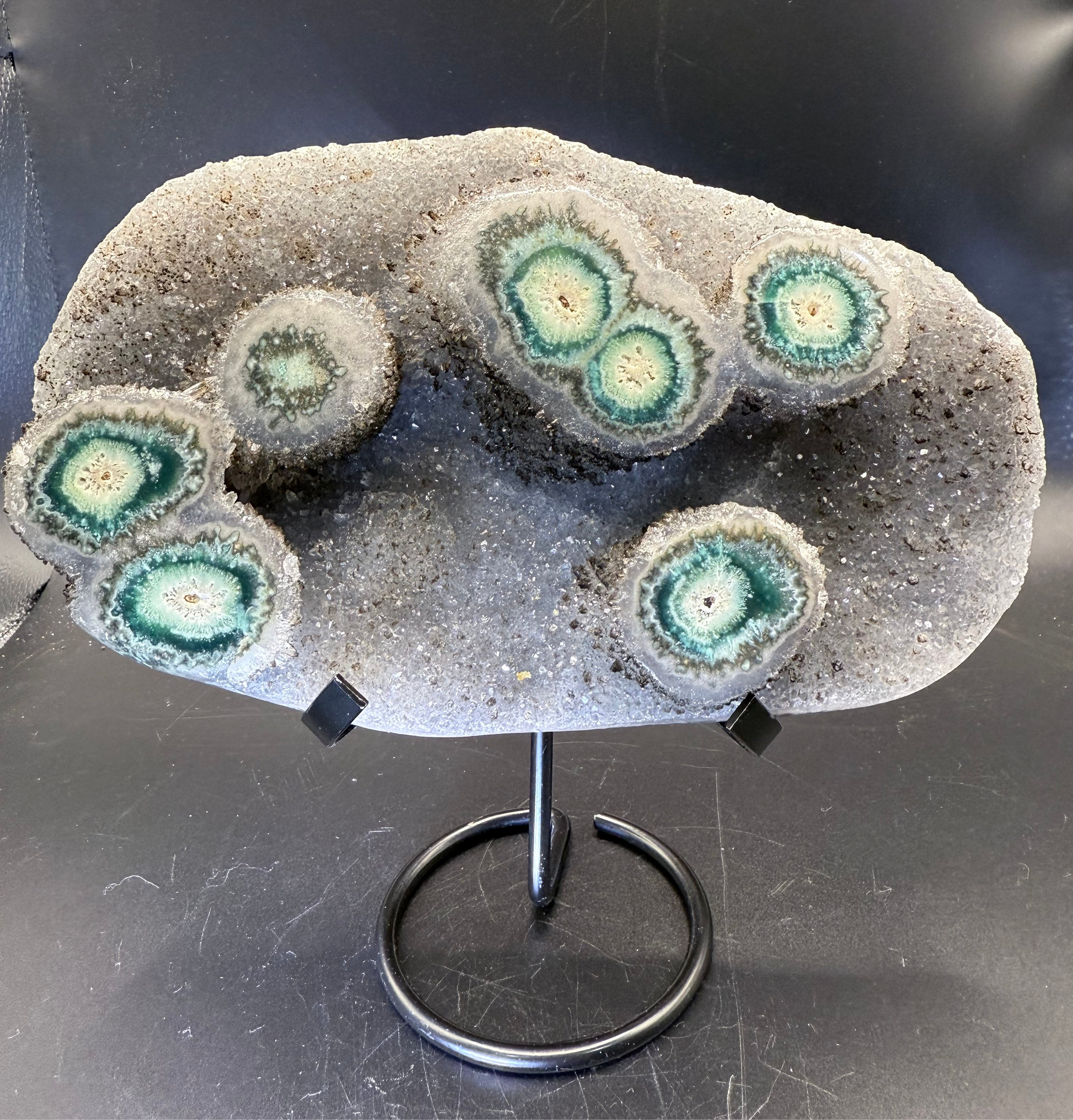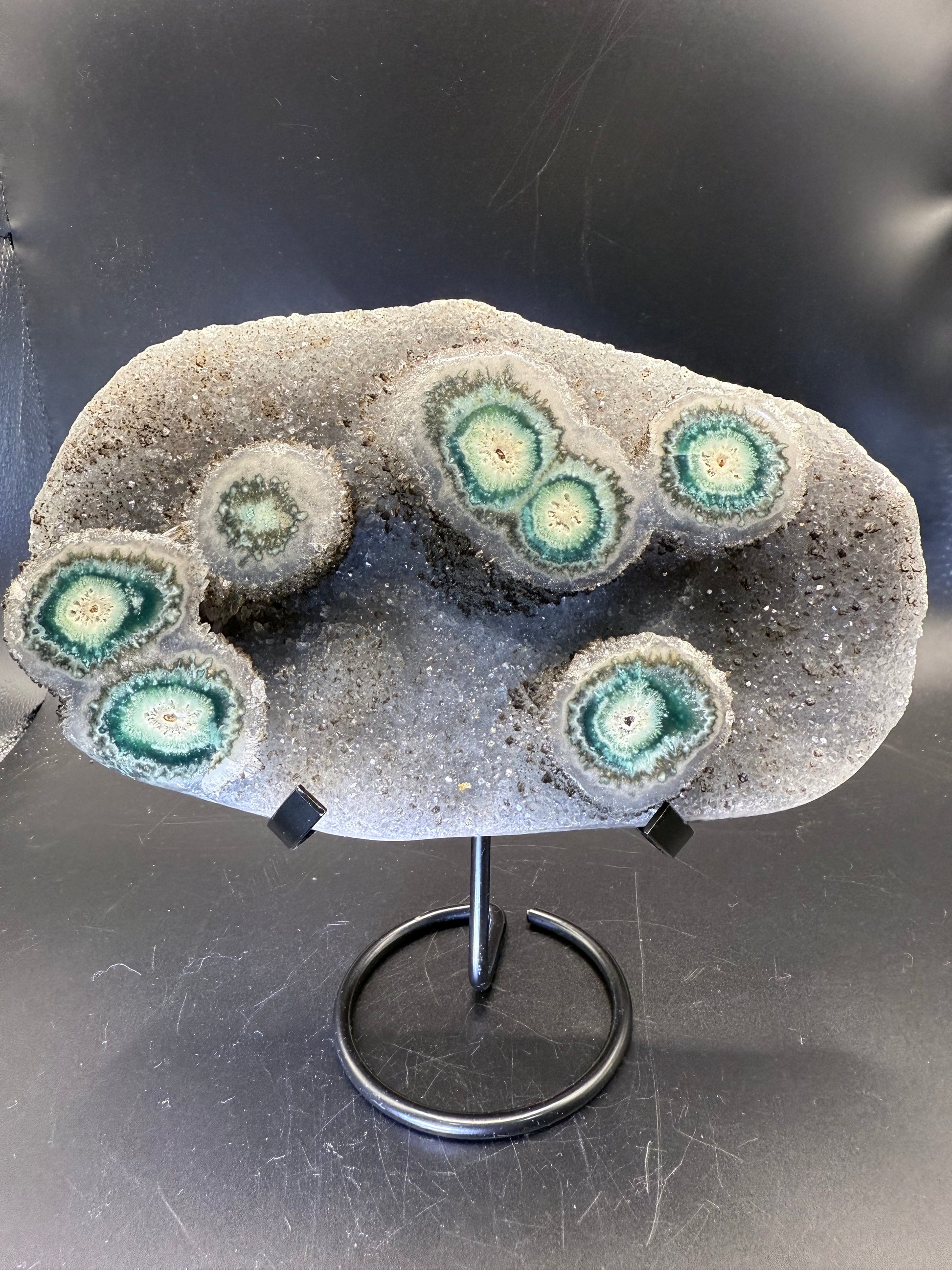 ๐ Appearance: A truly rare and unique formation, this Solar Amethyst Quartz displays natural โflowerโ patterns created by the growth rings of amethyst stalactites. Shades of green, white, and violet radiate from the center, surrounded by sparkling quartz druzy crystals. Elegantly mounted on a black display stand, itโs both a powerful healing crystal and a breathtaking dรฉcor piece.