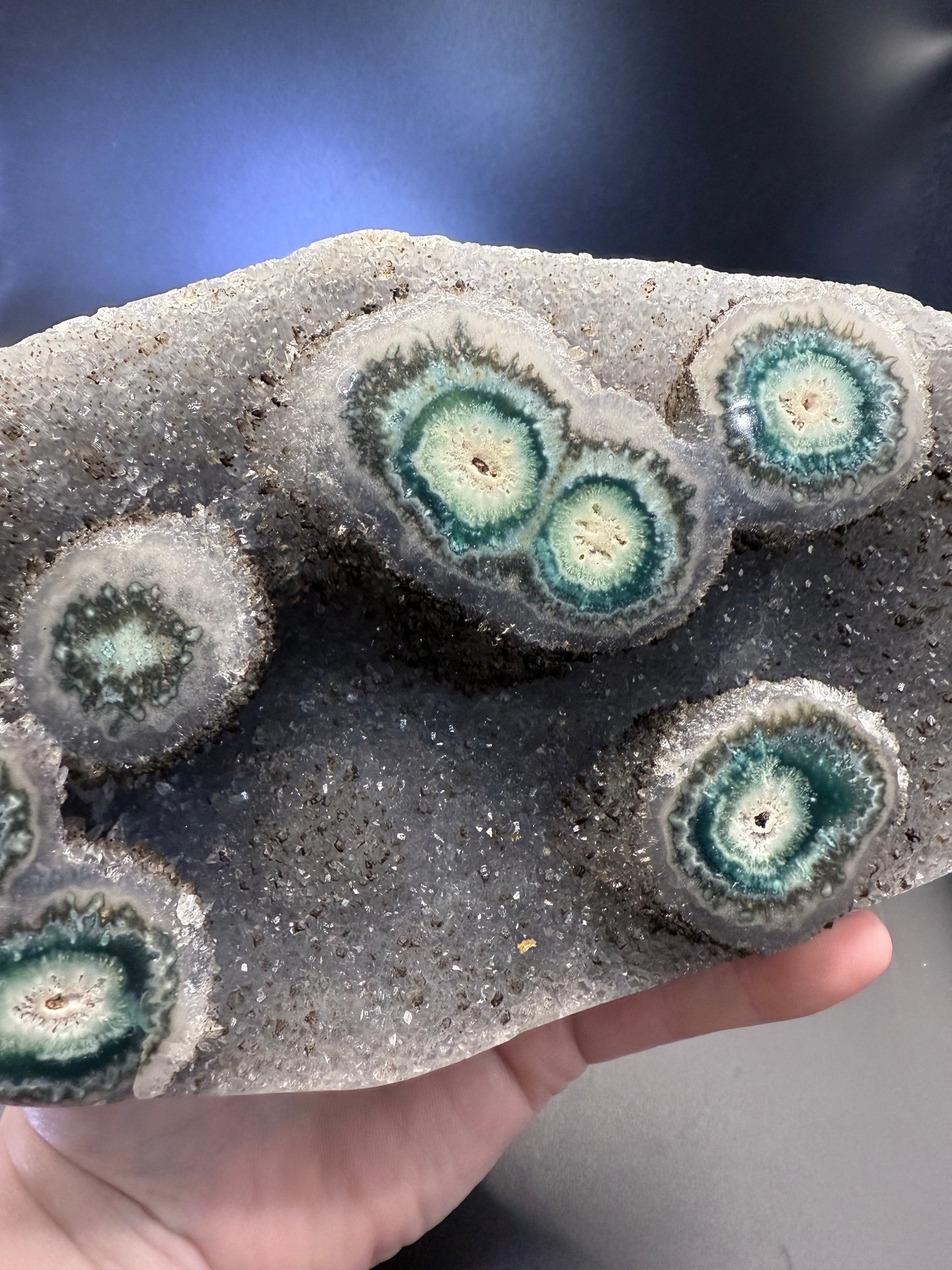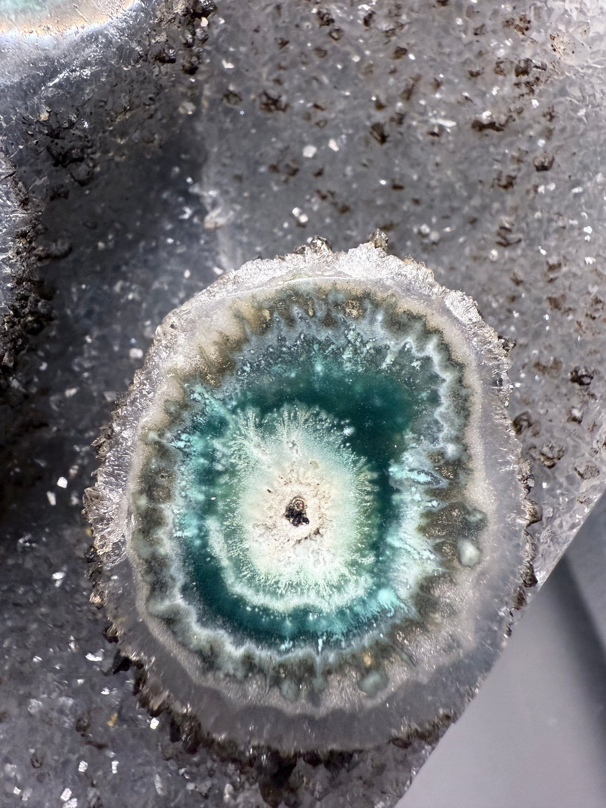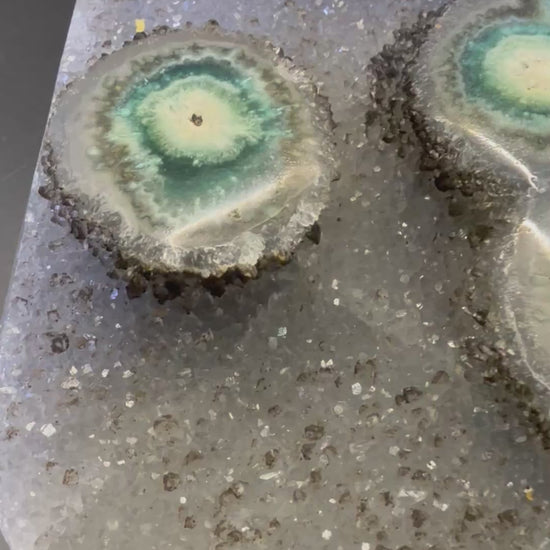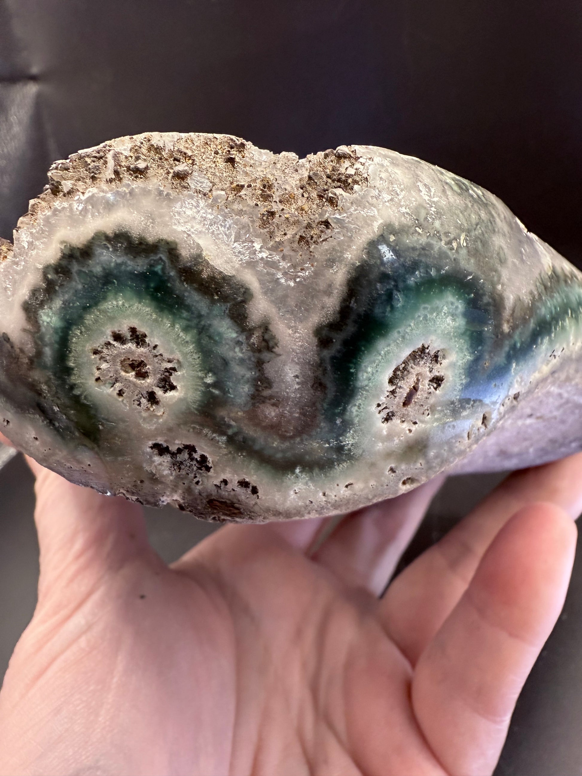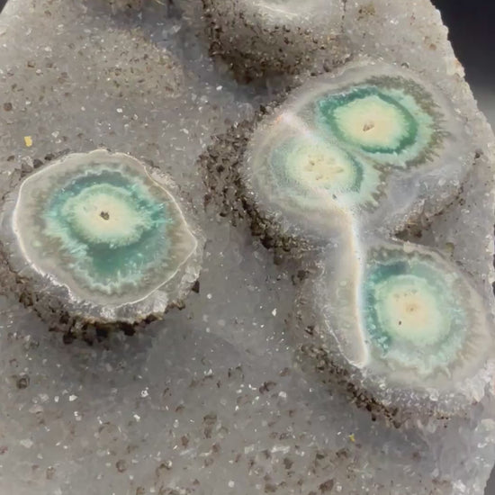 ๐ Appearance: A truly rare and unique formation, this Solar Amethyst Quartz displays natural โflowerโ patterns created by the growth rings of amethyst stalactites. Shades of green, white, and violet radiate from the center, surrounded by sparkling quartz druzy crystals. Elegantly mounted on a black display stand, itโs both a powerful healing crystal and a breathtaking dรฉcor piece.