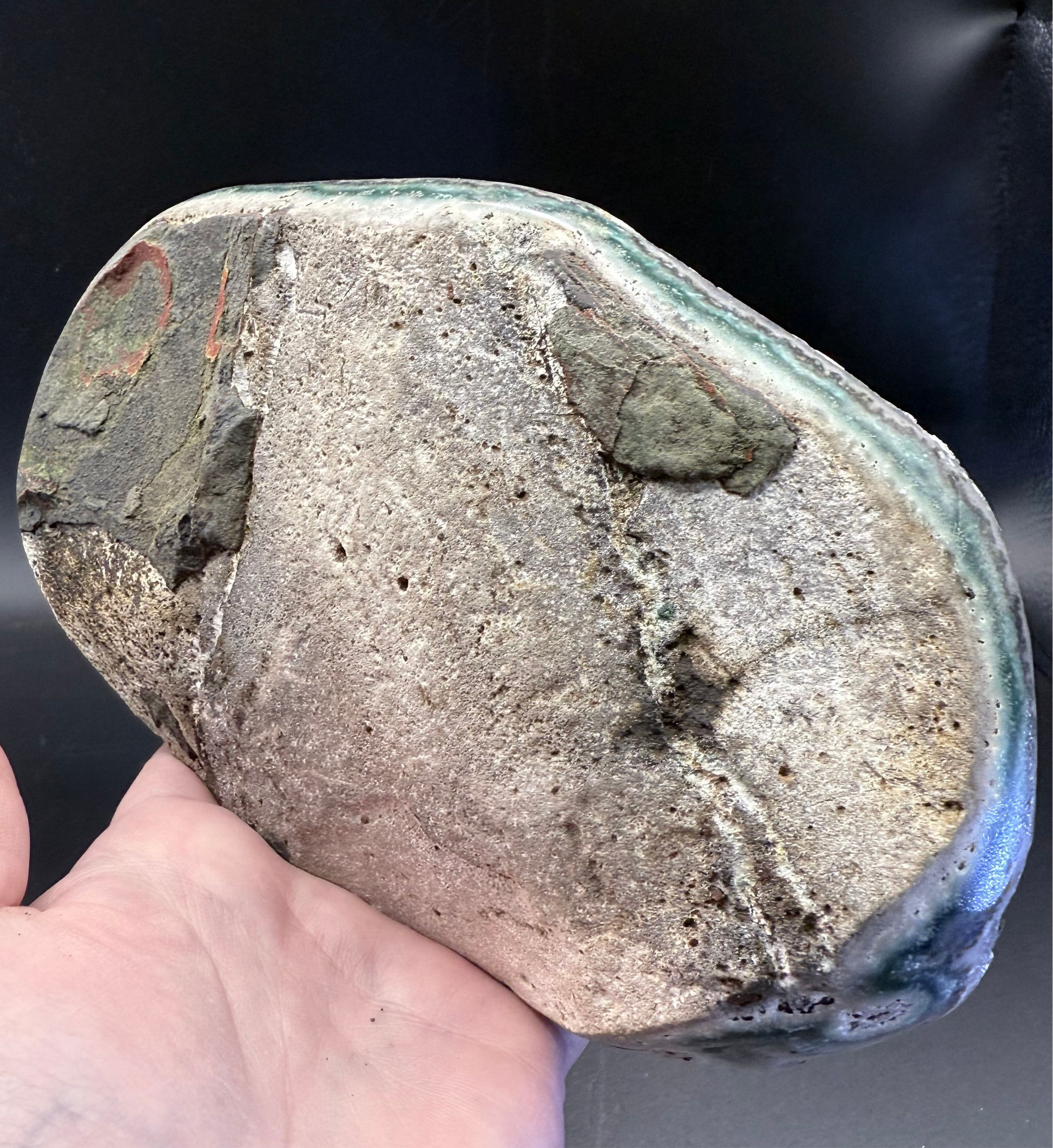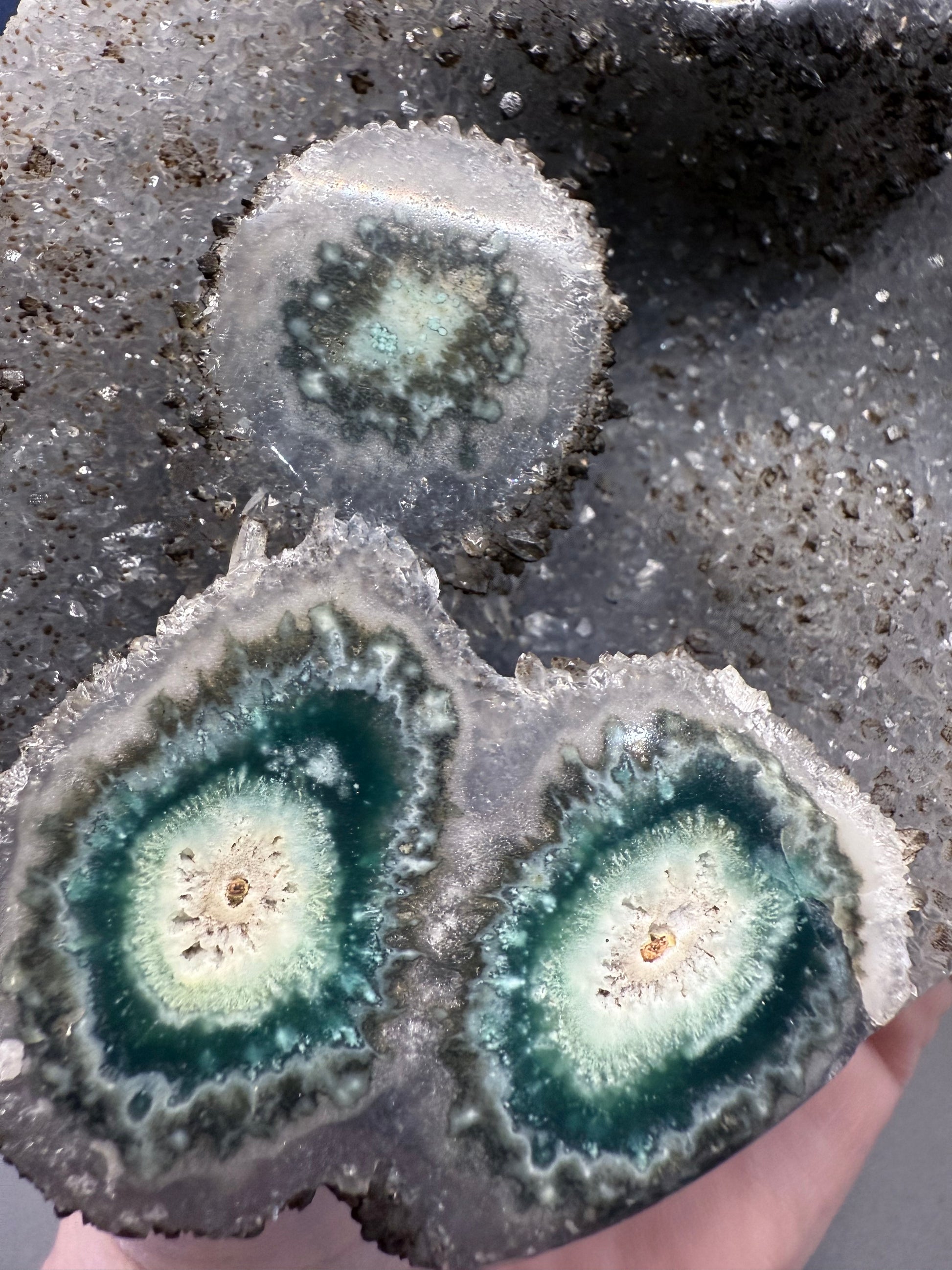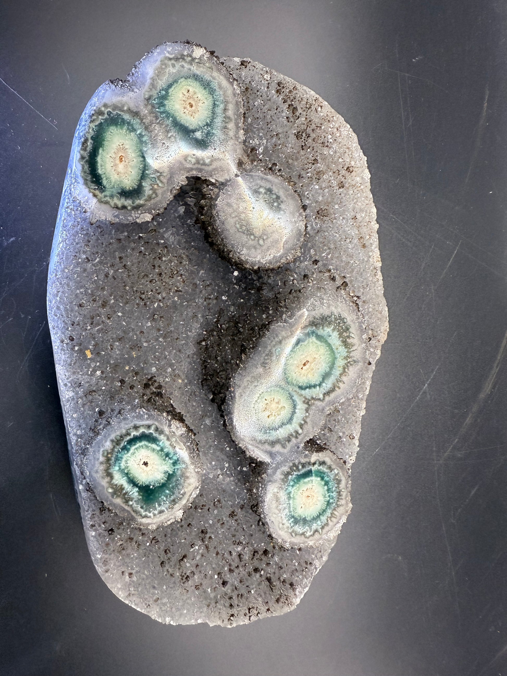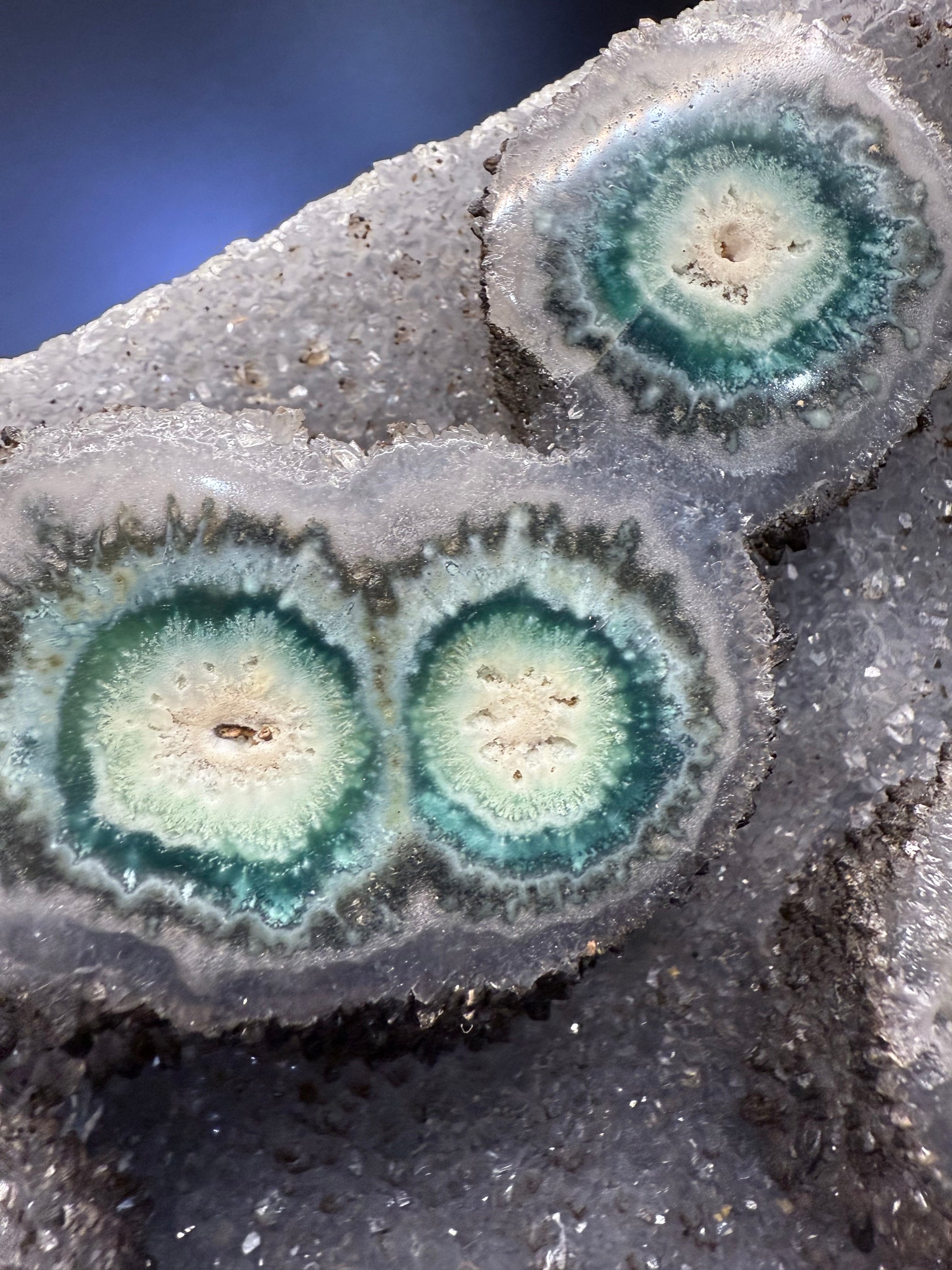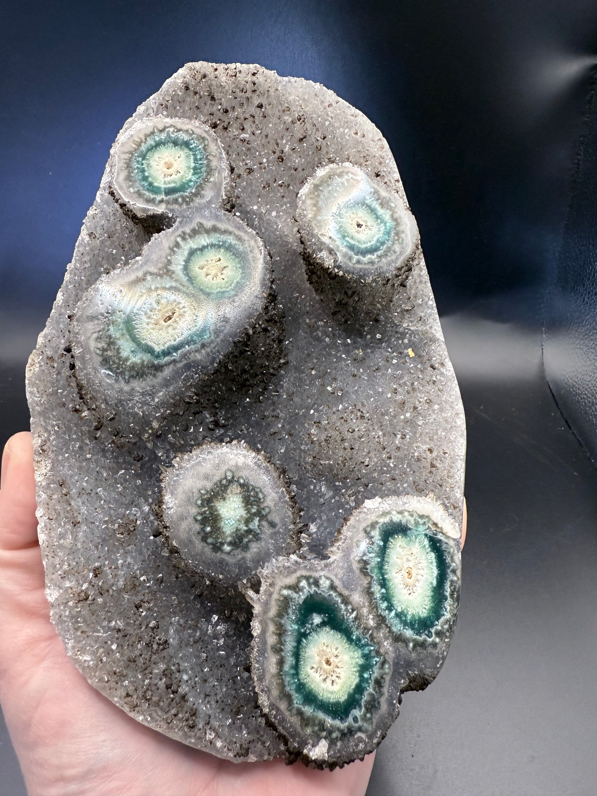 ๐ Appearance: A truly rare and unique formation, this Solar Amethyst Quartz displays natural โflowerโ patterns created by the growth rings of amethyst stalactites. Shades of green, white, and violet radiate from the center, surrounded by sparkling quartz druzy crystals. Elegantly mounted on a black display stand, itโs both a powerful healing crystal and a breathtaking dรฉcor piece.