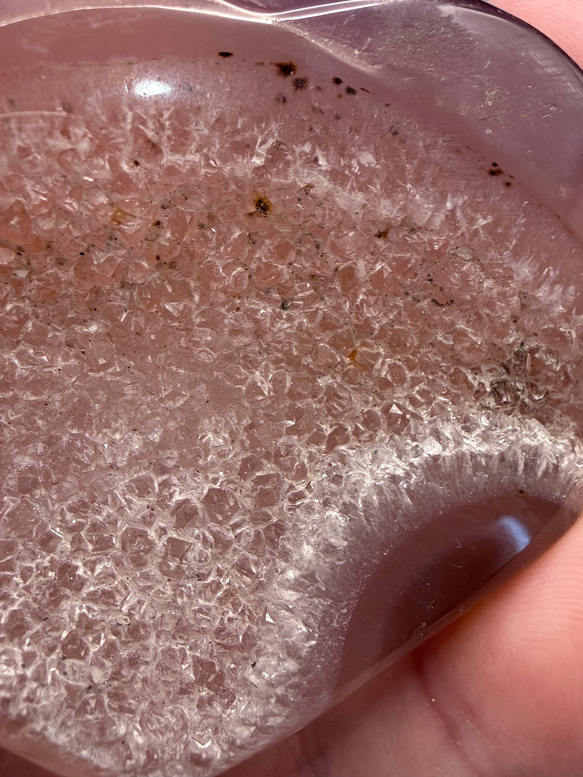 Pink Agate is known for its soothing, nurturing energy — perfect for grounding emotions, calming the mind, and encouraging self-love and gentle confidence. The druzy adds an extra touch of uplifting “high vibe” energy, making this a beautiful piece for a bedside table, desk, or crystal altar.