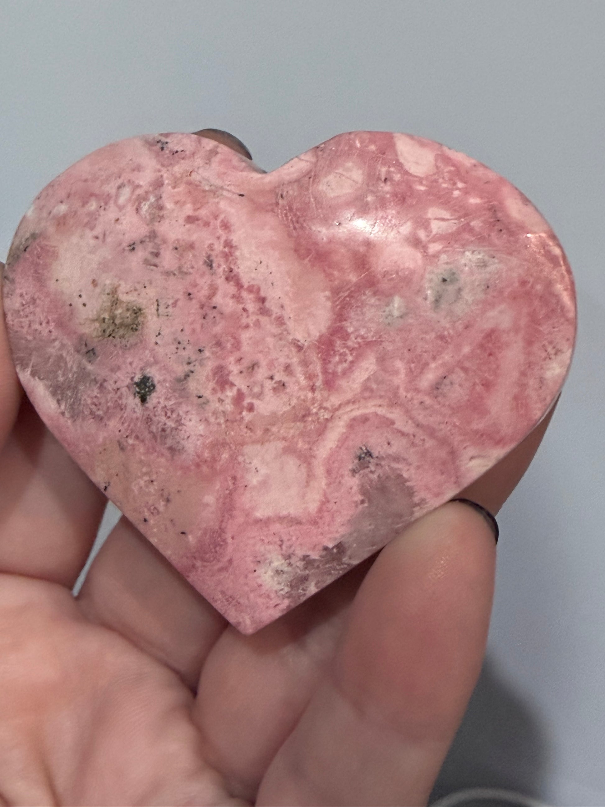 This stunning Pink Rhodonite heart from Peru features beautiful soft to vibrant pink tones with natural black manganese inclusions, creating striking contrast and character. Polished smooth, this piece showcases the classic marbled patterns Rhodonite is loved for.