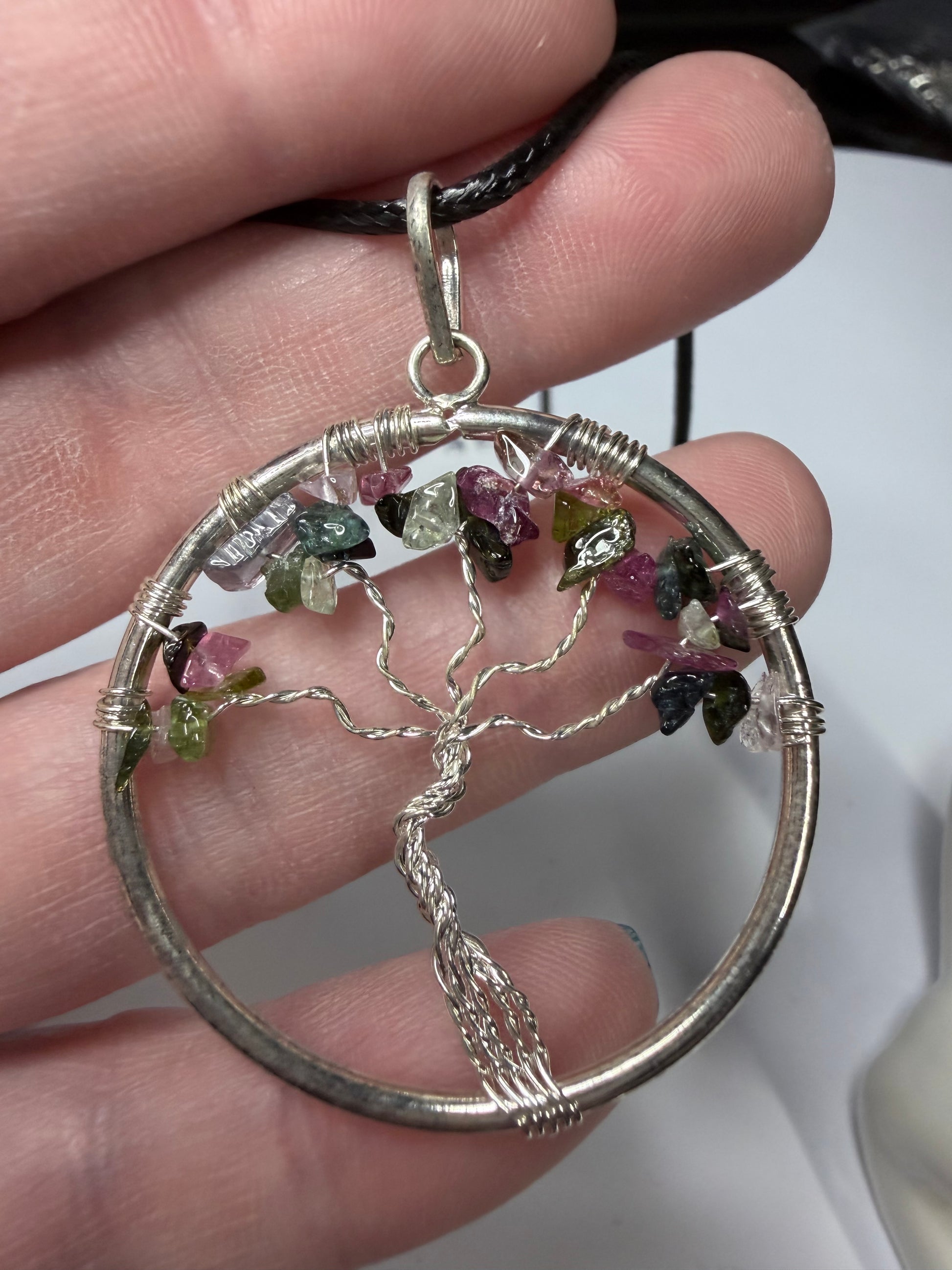 A stunning Tree of Life pendant handcrafted with natural multi-colour Tourmaline chips, symbolising growth, grounding, harmony and new beginnings. Each Tourmaline chip displays its own natural shade — from pink, olive and green, to golden tones and deep protective black — creating a beautiful spectrum of energy.