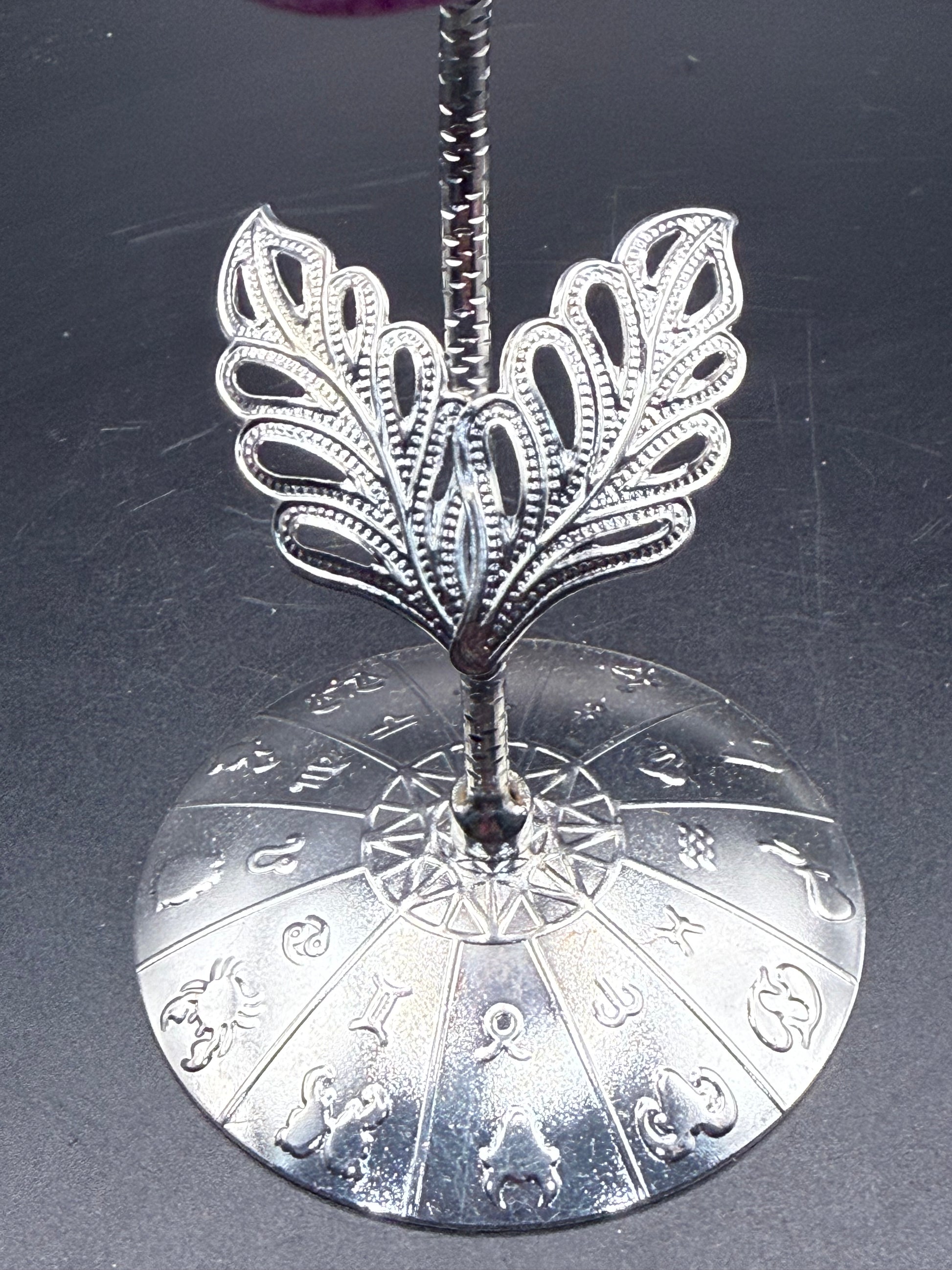 This exquisite Pink Ruby Rose is perched on an intricate silver zodiac stand, representing the union of cosmic energy and pure love.