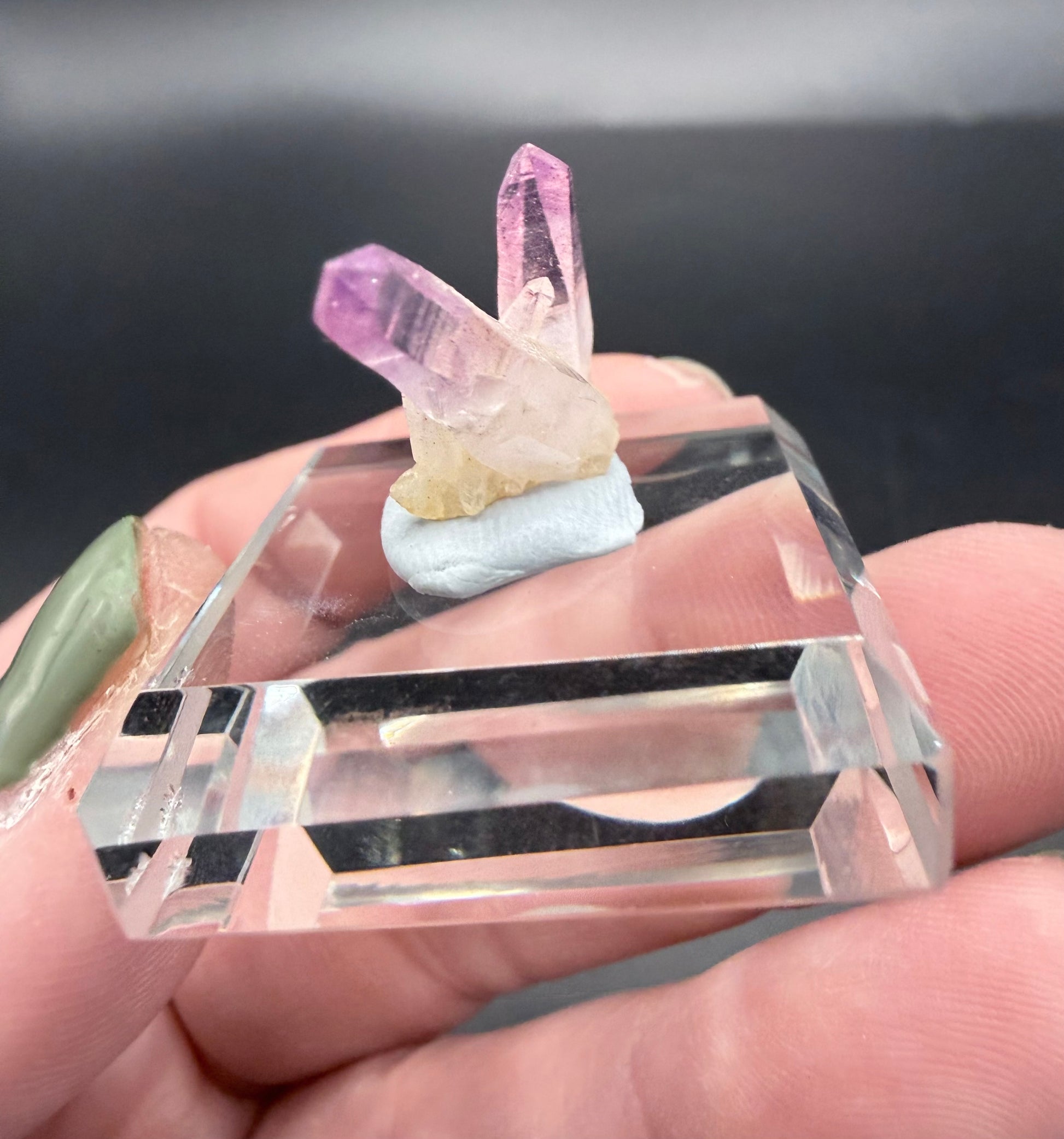 A stunning and elegant Vera Cruz Amethyst cluster featuring two beautifully terminated points with soft lilac-to-clear zoning and a golden matrix base. These gemmy crystals shimmer with high clarity and natural light refraction that catches every angle ā a perfect miniature masterpiece!