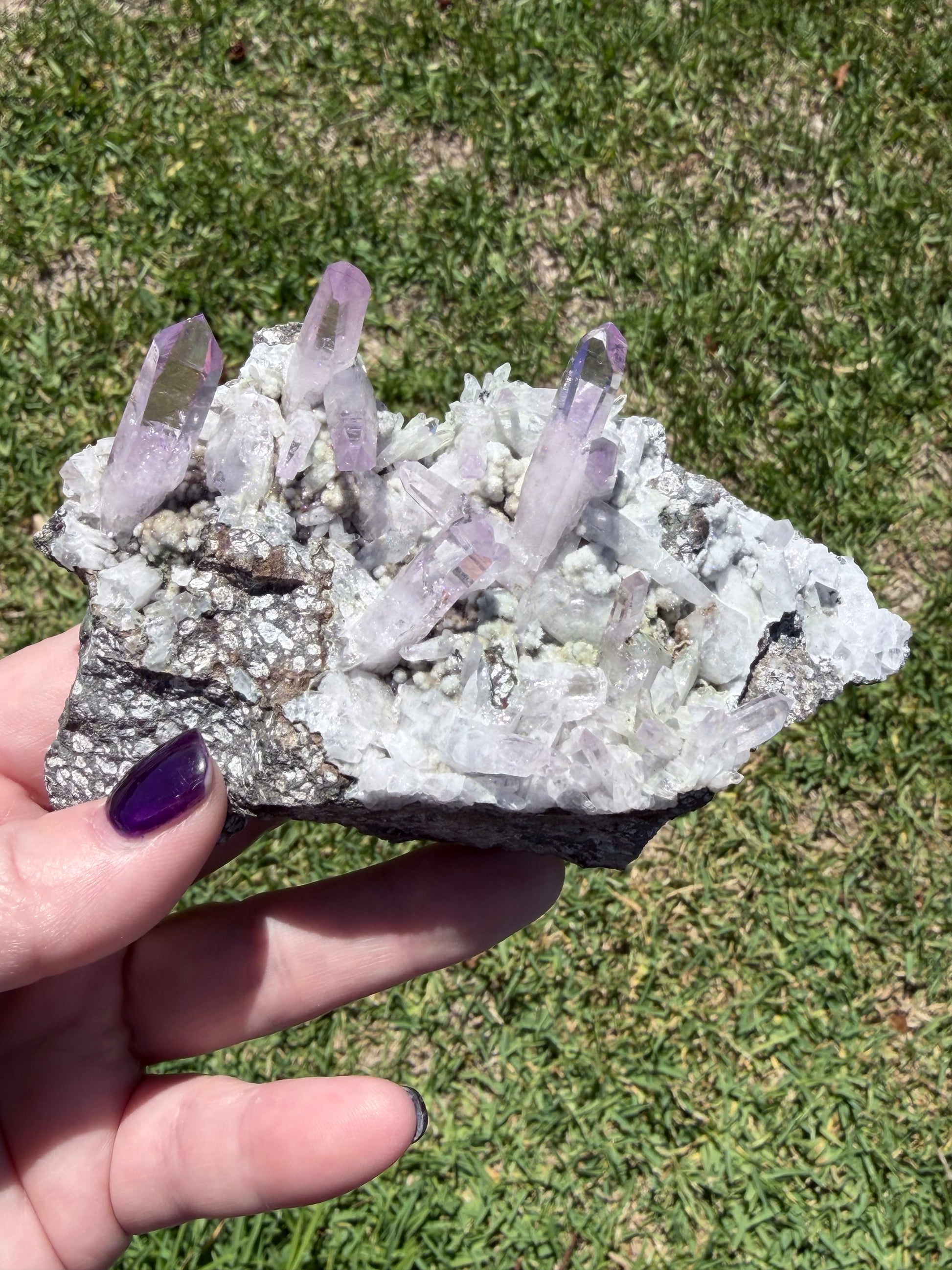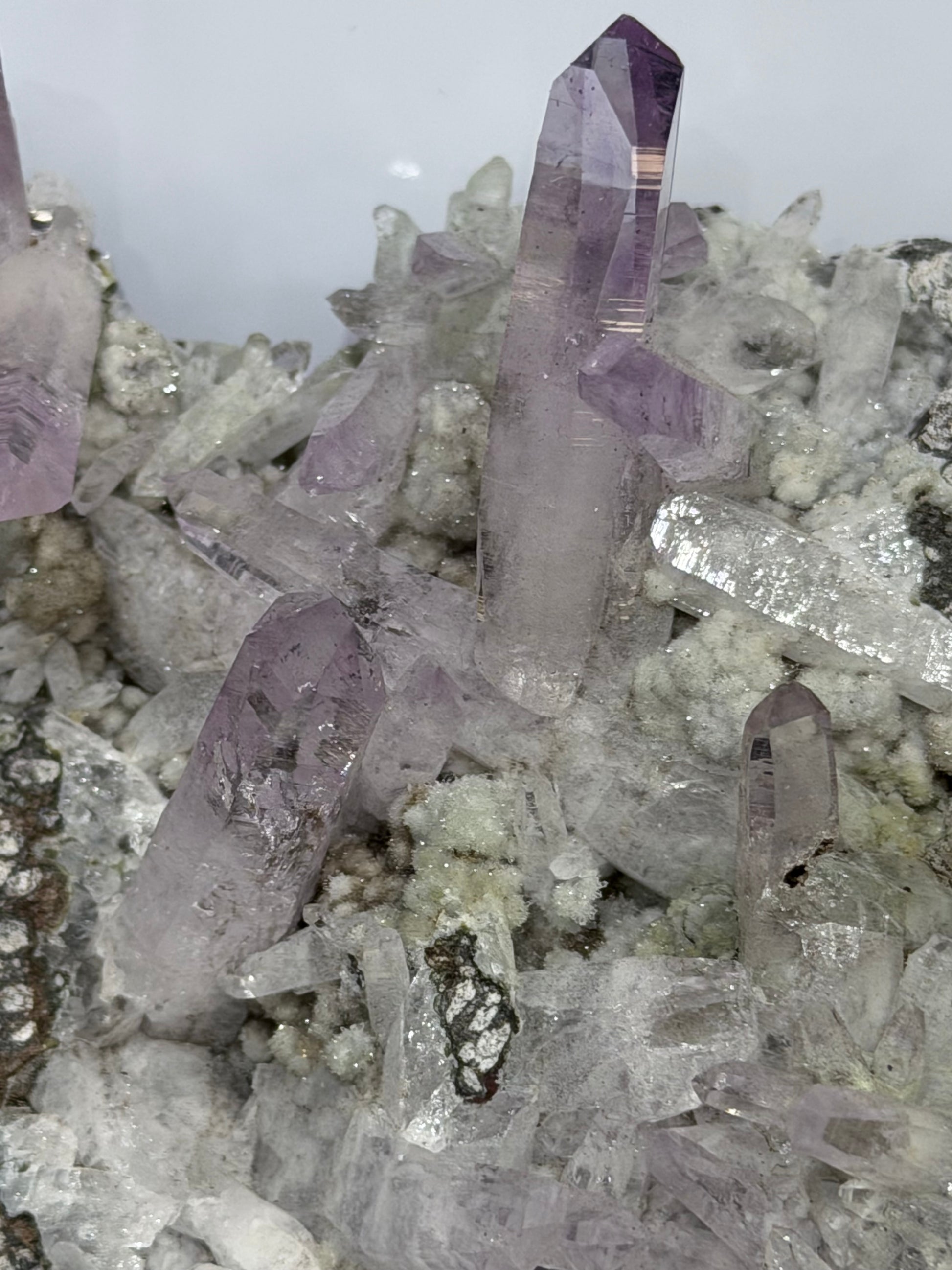 This genuine Vera Cruz Amethyst cluster is naturally attached to its original matrix and displays multiple slender, elongated crystal points with soft light-to-medium lavender colouring — a defining characteristic of true Vera Cruz material from Mexico.