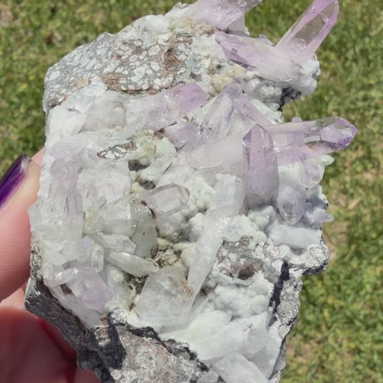Vera Cruz Amethyst forms in slender, elongated crystals with lighter lavender hues, unlike darker Brazilian amethyst. Its rarity, growth habit, and natural elegance make it a premium collector stone.