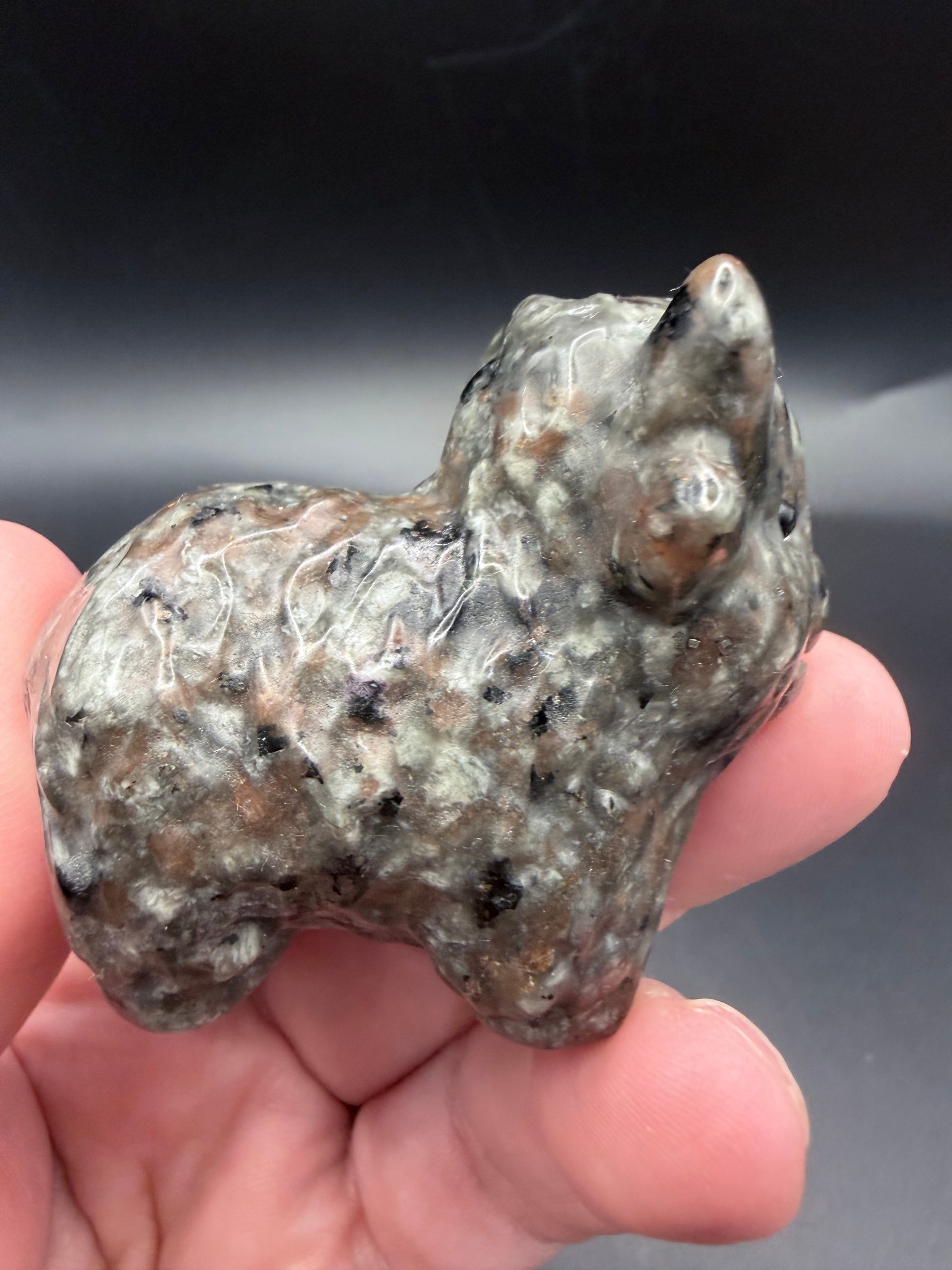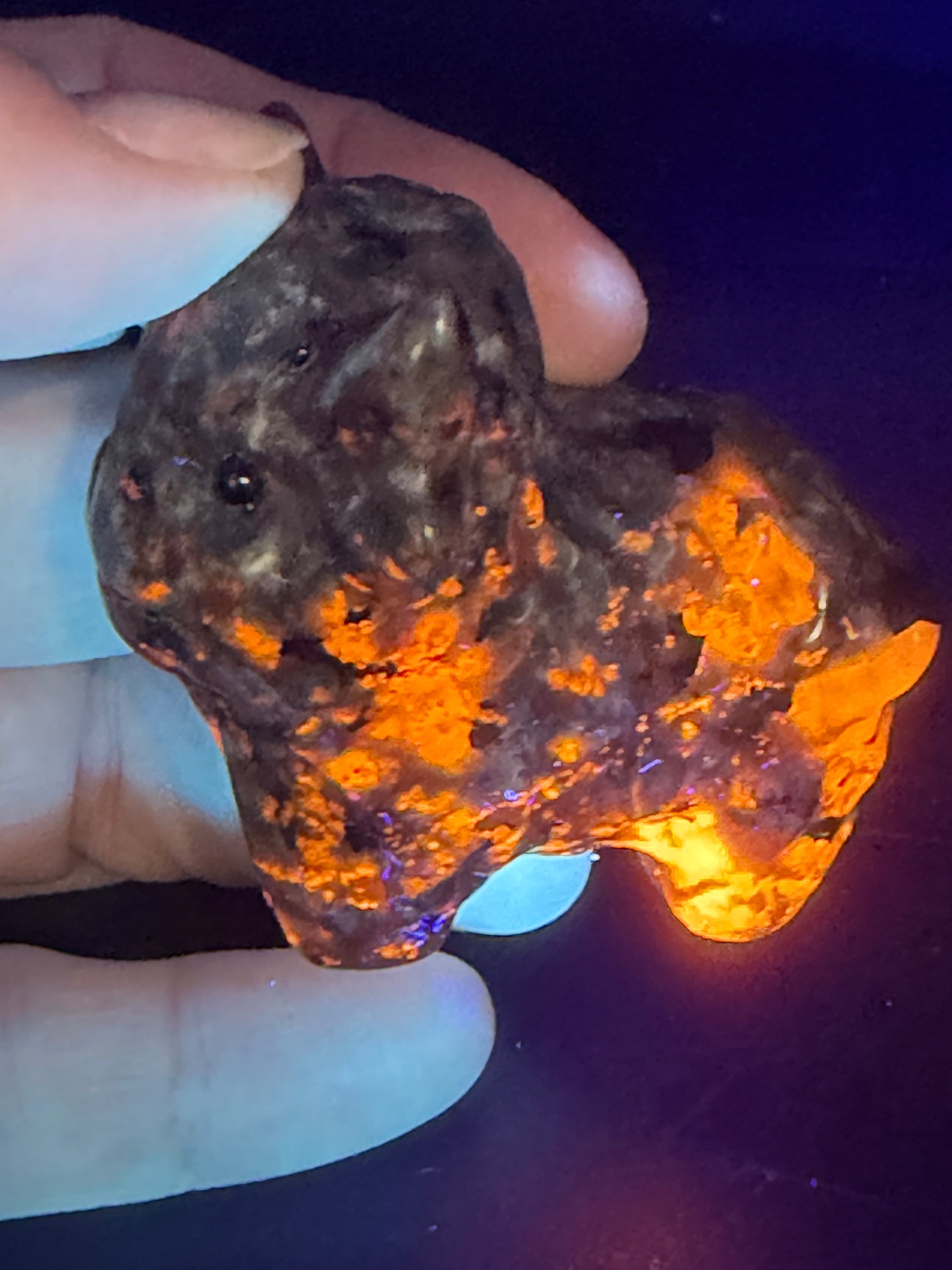 Yooperlite is a syenite stone containing fluorescent sodalite, prized for its unique reaction to UV light. Each carving is completely one-of-a-kind, with its own glow pattern and personality.